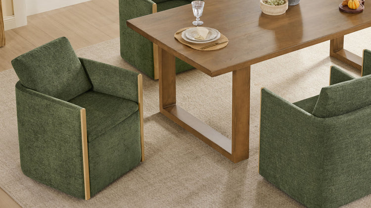 Modern design reimagined for real-life comfort. The Elsa Rolling Dining Chair blends clean lines and natural wood inlay with soft chenille upholstery for a warm, refined look that fits effortlessly into any space. Hidden casters let you glide across the room with ease, while discreet under-seat storage keeps essentials close and clutter-free. Crafted with an FSC®-certified solid wood frame and CertiPUR-US® certified foam, Elsa combines sustainable materials with comfort that lasts through countless gatherings.