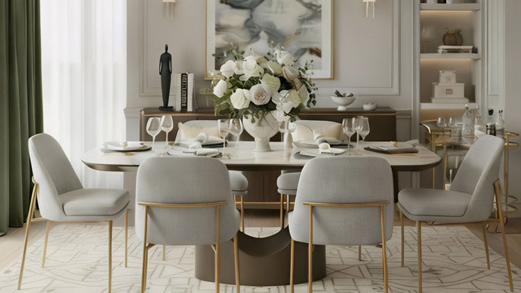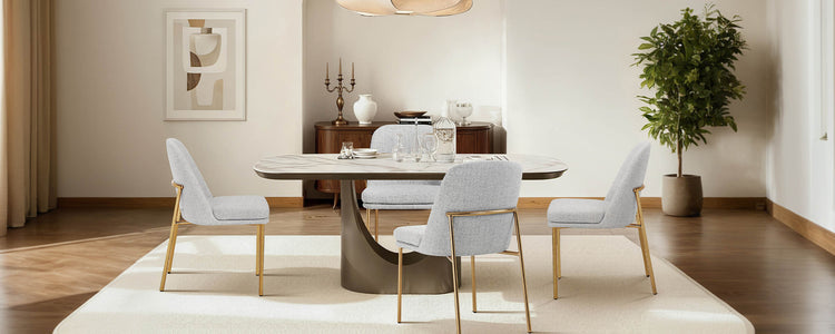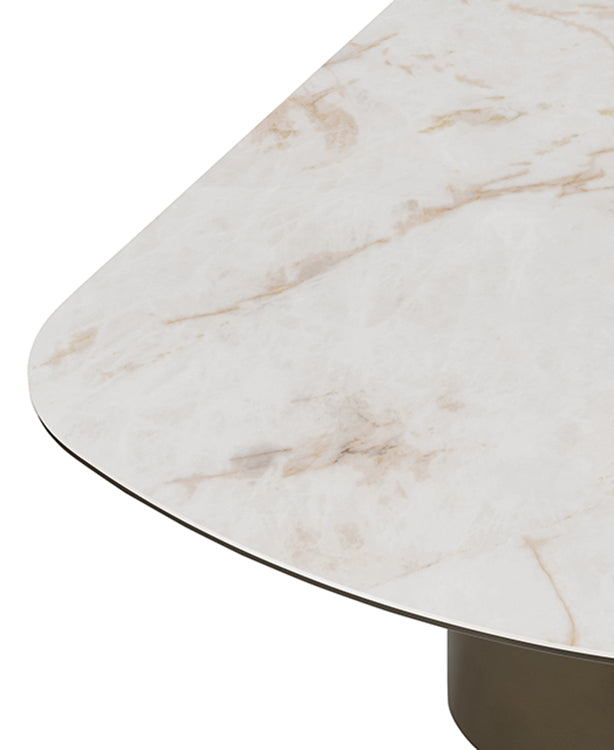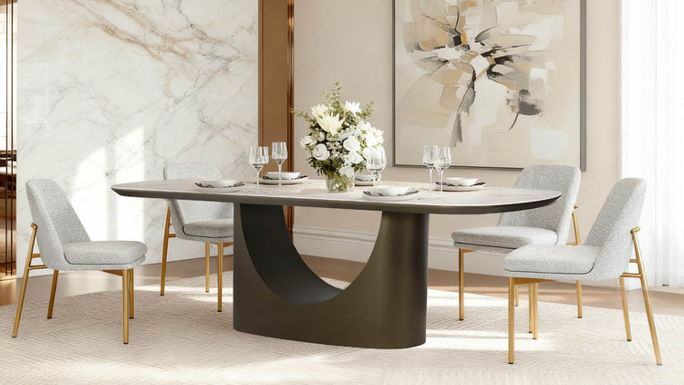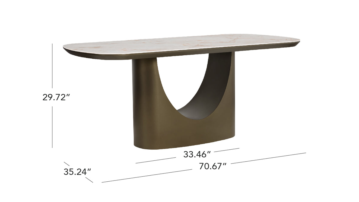 The 71" Layla Marble Elegant Design Soft-Corner Dining Table blends sculptural modernism with quiet luxury. Its soft-edged ceramic top rests on an architectural bronze-finished base featuring a bold curved cutout that creates both visual lightness and structural stability. Smooth textures, refined finishes, and a harmonious silhouette make this table a centerpiece that elevates contemporary dining spaces.