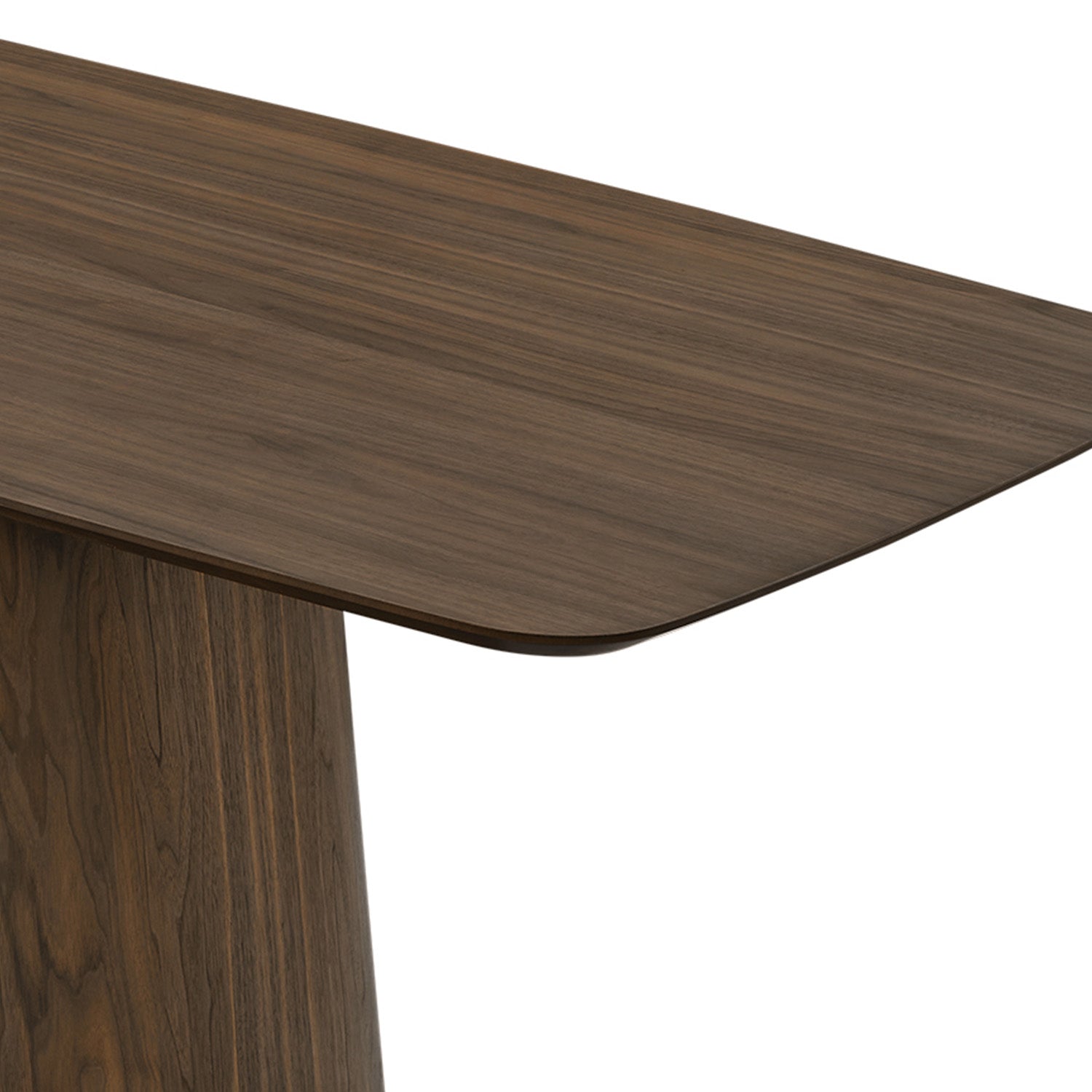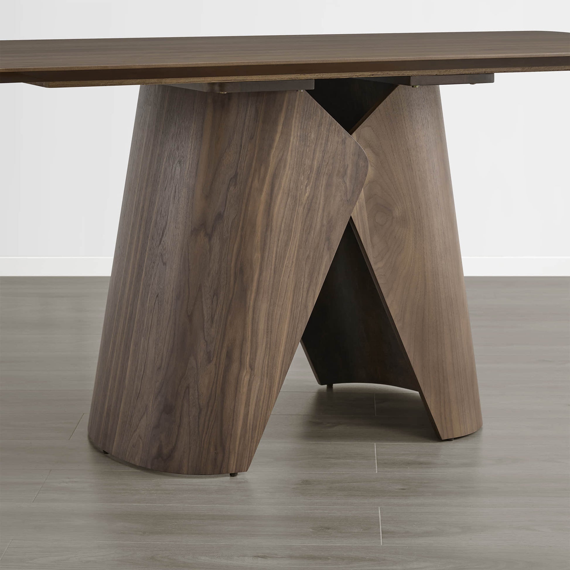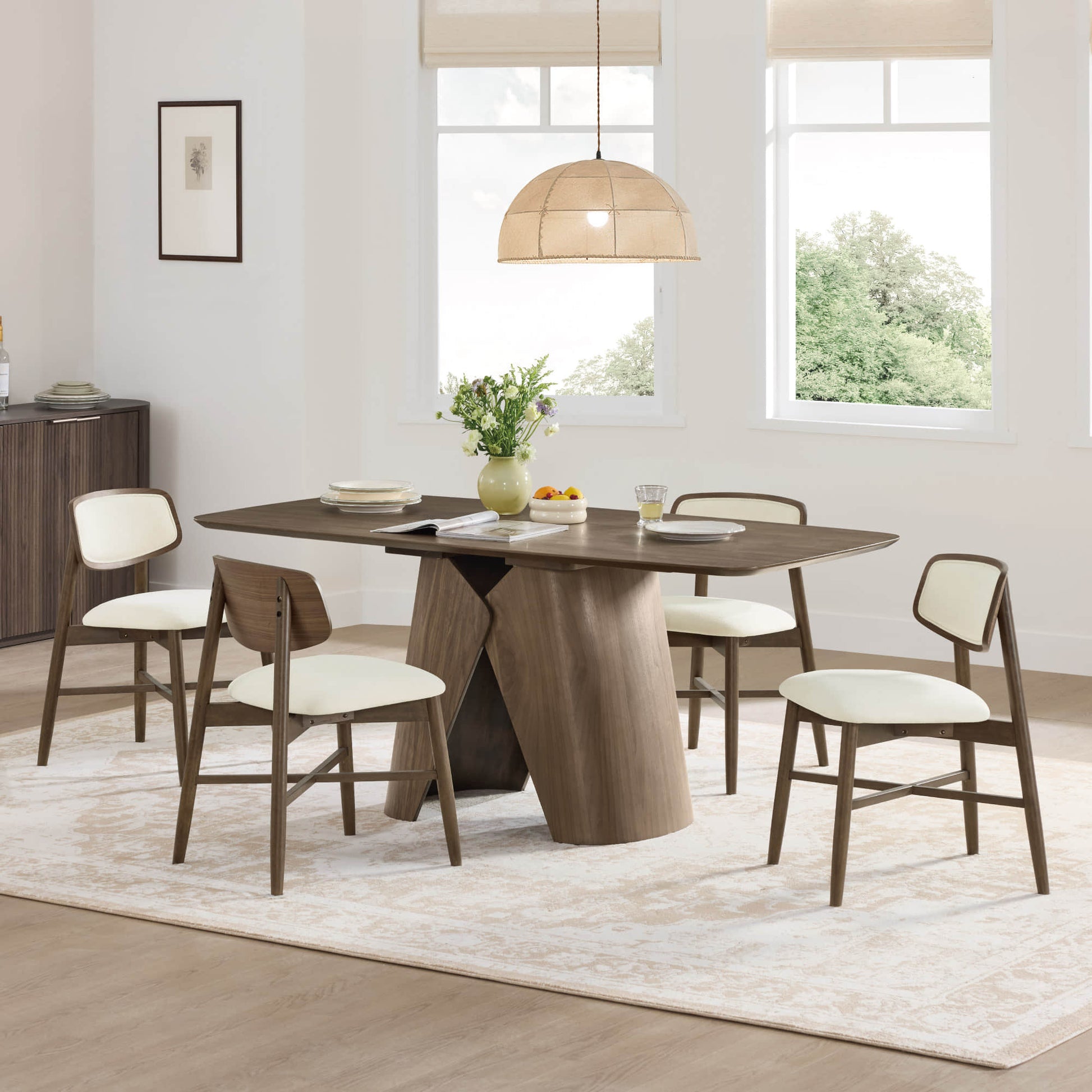 Elowen brings sculptural clarity to the dining space with a bold pedestal base and a softly contoured tabletop. Two angled solid wood legs form an architectural foundation that feels expressive yet grounded. Designed to balance strength and elegance, the table offers generous legroom, steady support, and a warm modern presence that elevates everyday meals and shared gatherings.