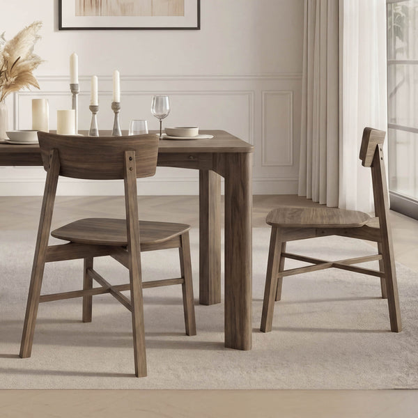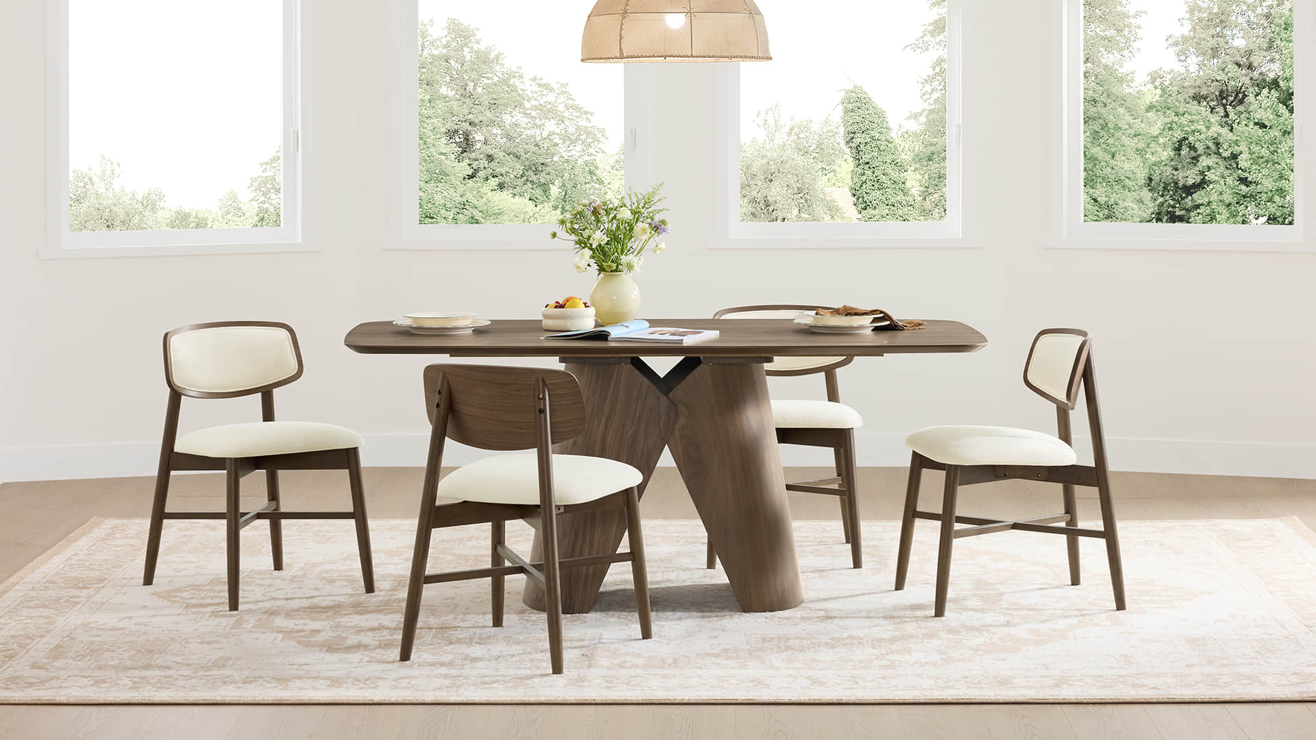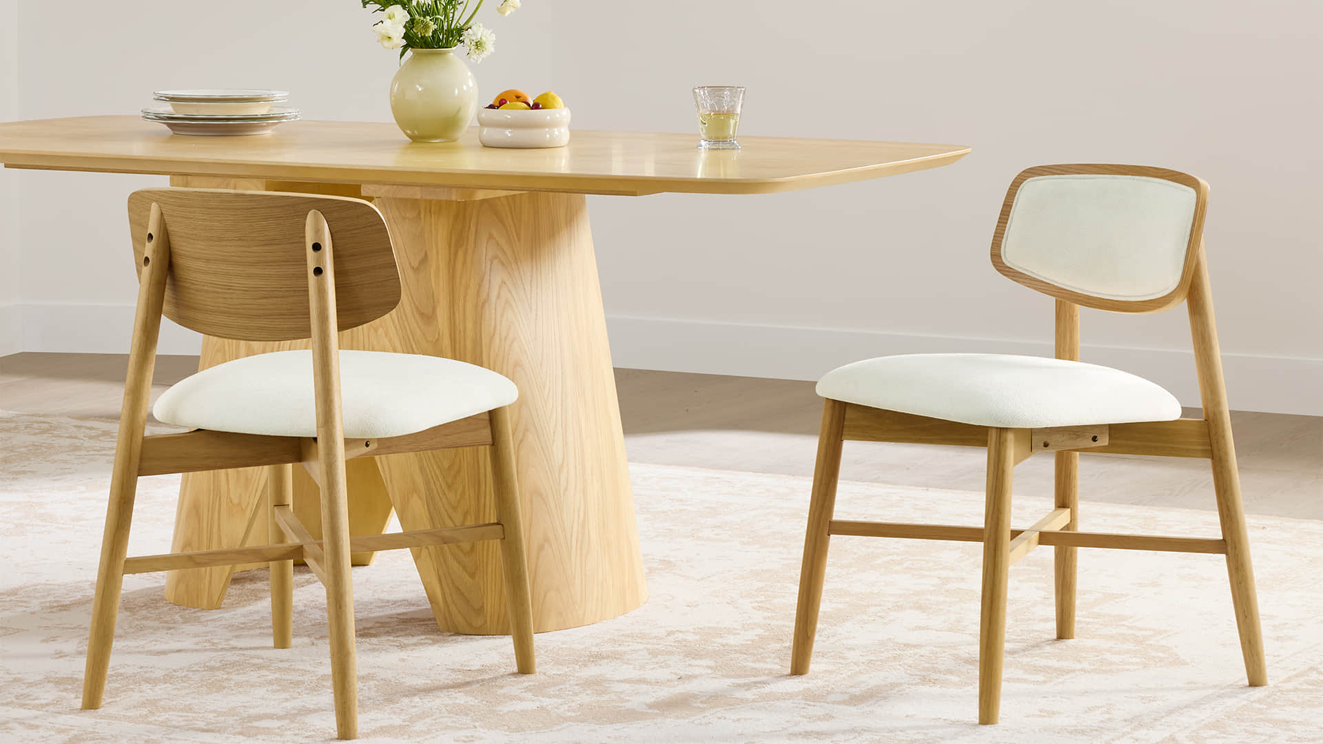 Elowen brings sculptural clarity to the dining space with a bold pedestal base and a softly contoured tabletop. Two angled solid wood legs form an architectural foundation that feels expressive yet grounded. Designed to balance strength and elegance, the table offers generous legroom, steady support, and a warm modern presence that elevates everyday meals and shared gatherings.