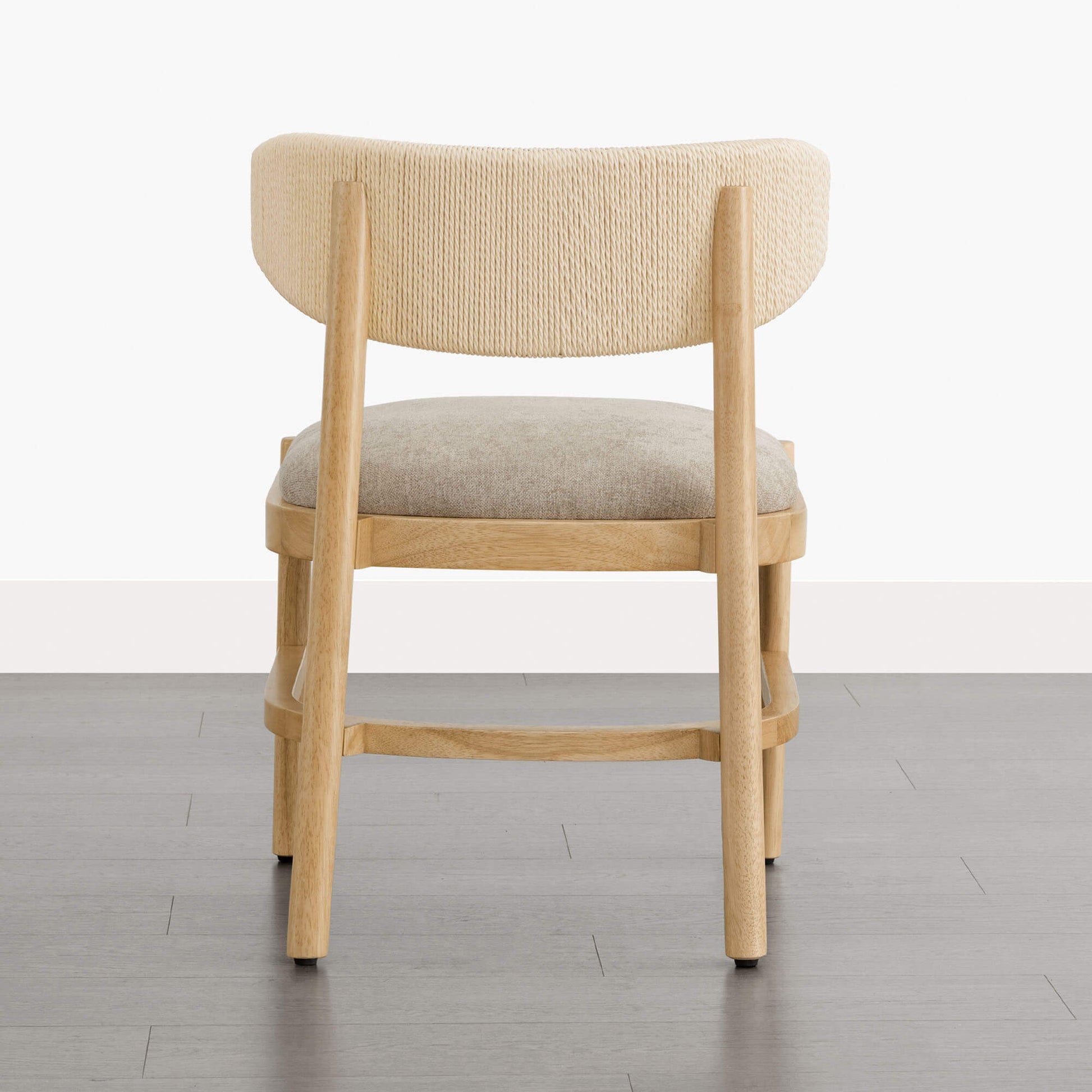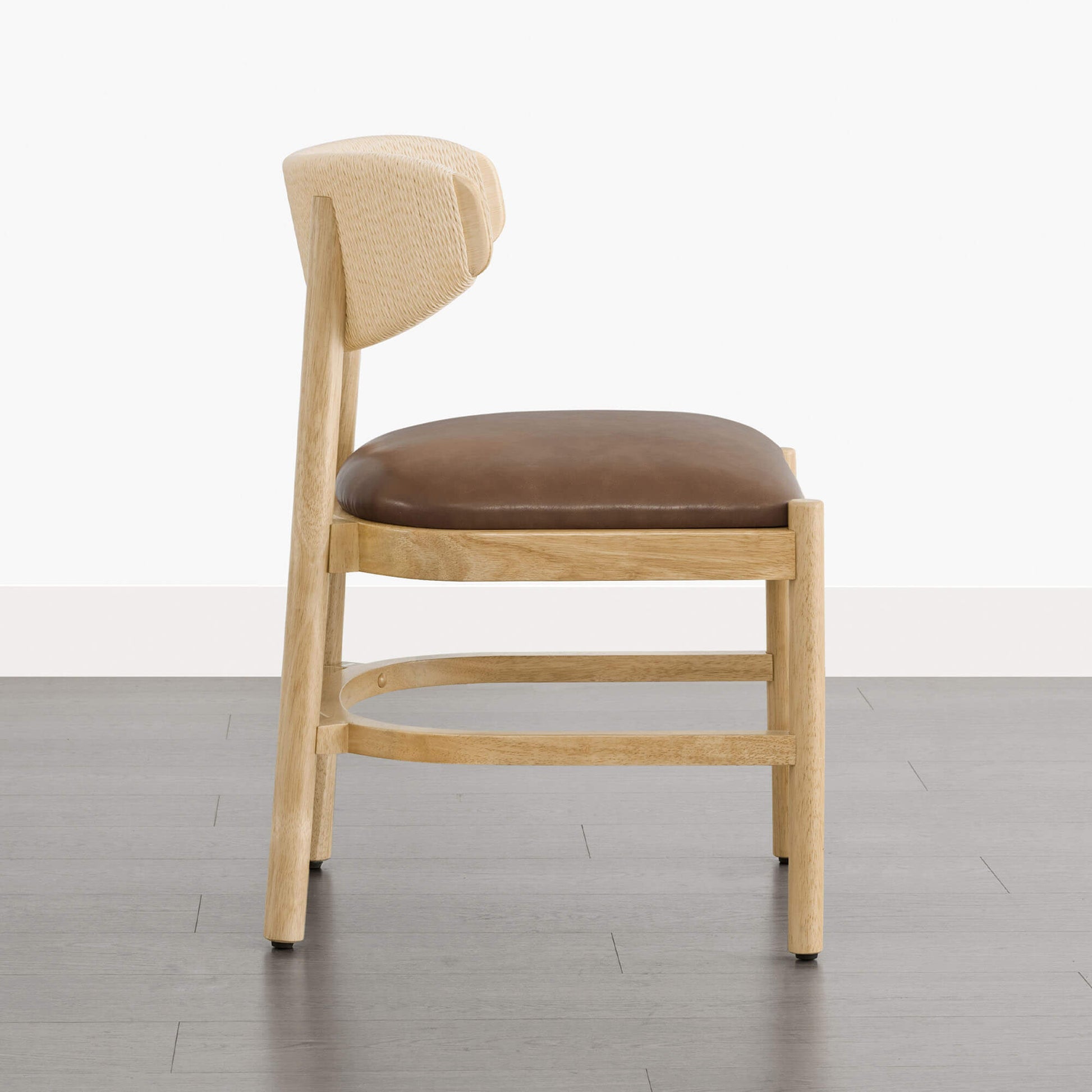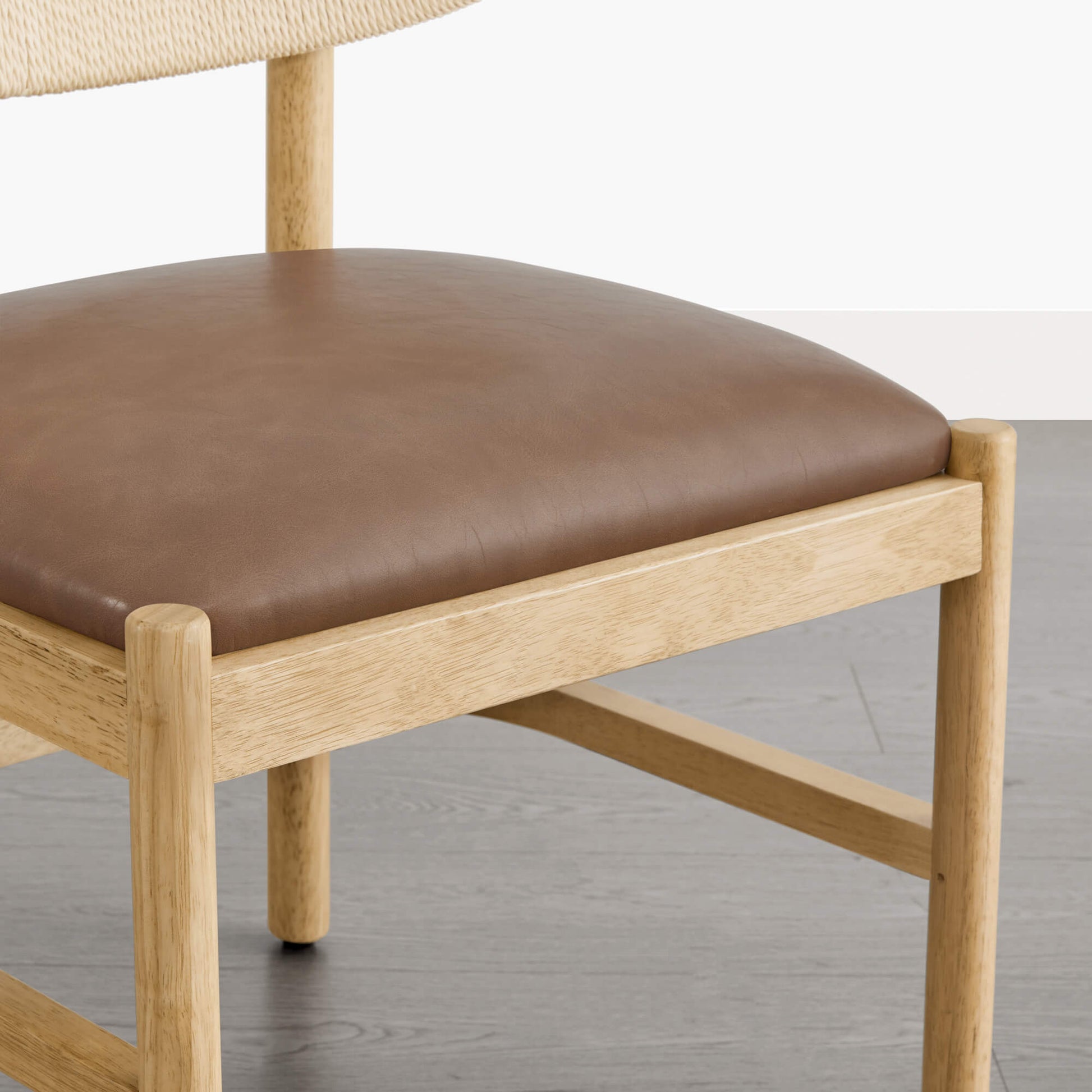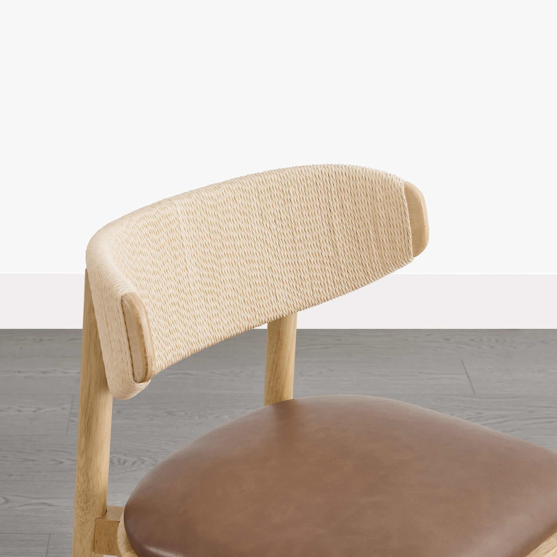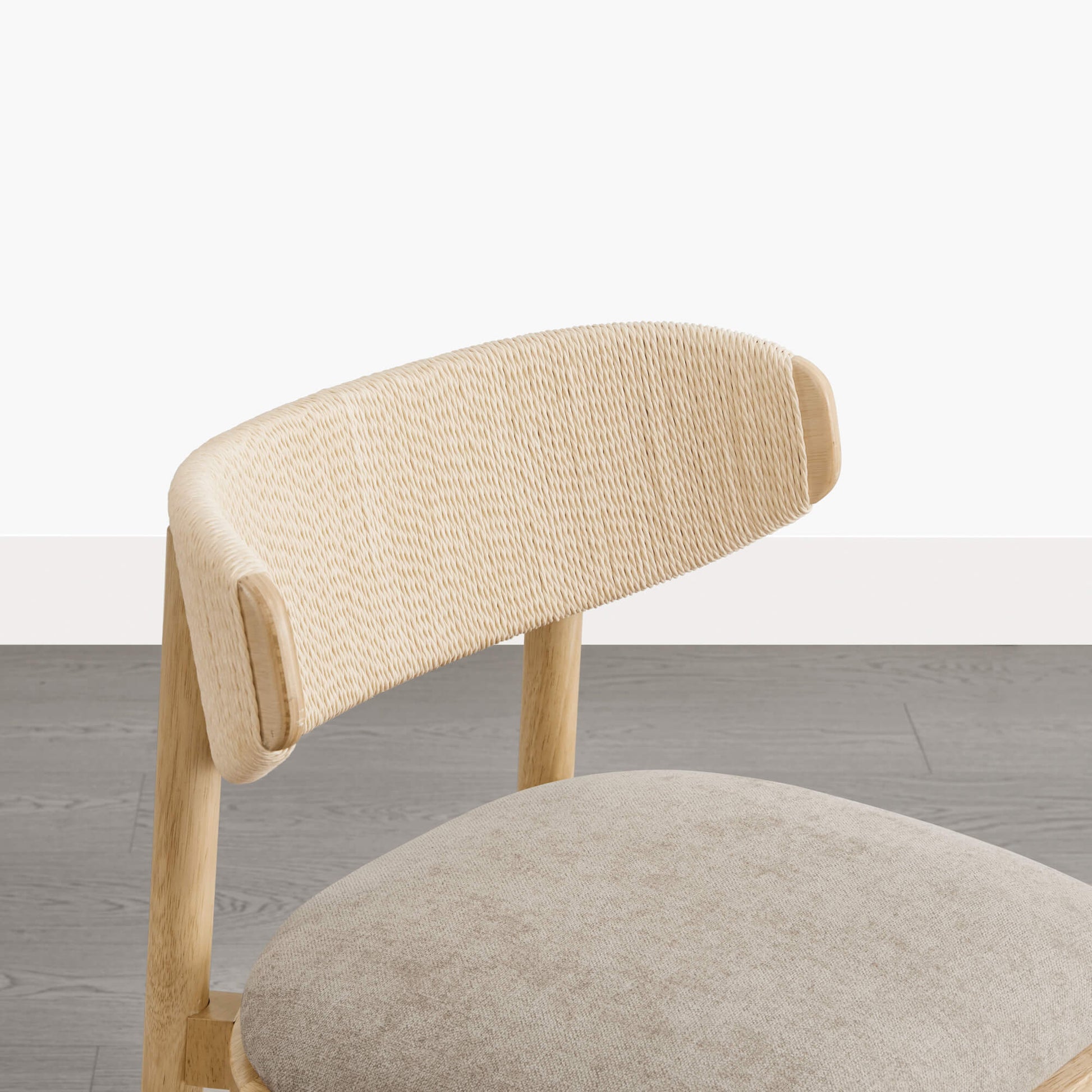Jody is designed with a quiet sense of balance, light in appearance and supportive in use. The curved backrest, finished with handwoven rope detailing, keeps the silhouette open while offering gentle, natural support. A solid rubberwood frame adds warmth and stability beneath the design. Shaped for unhurried meals and long conversations, the ergonomic back and high-density foam seat provide steady comfort. Offered in butter-soft faux leather or a linen-like fabric, Jody balances durability with effortless care for daily use.