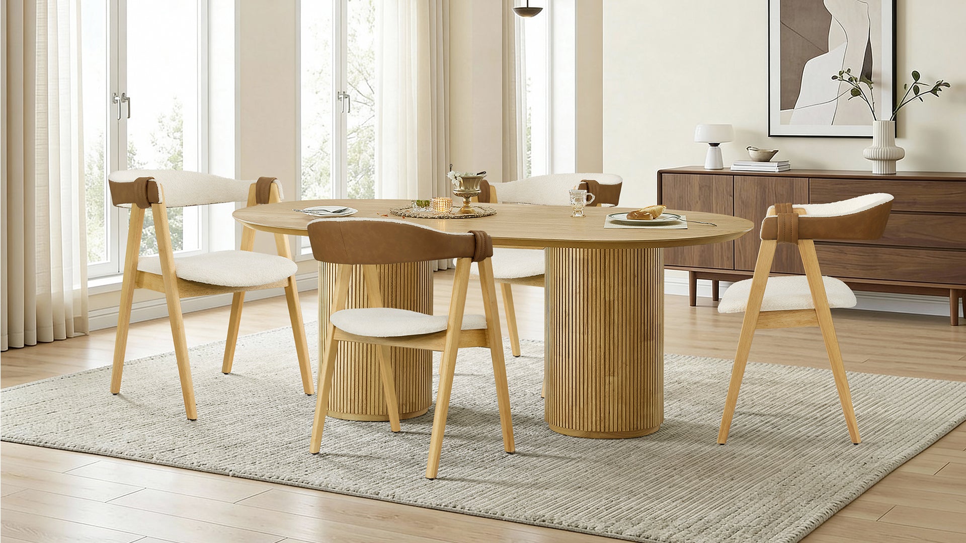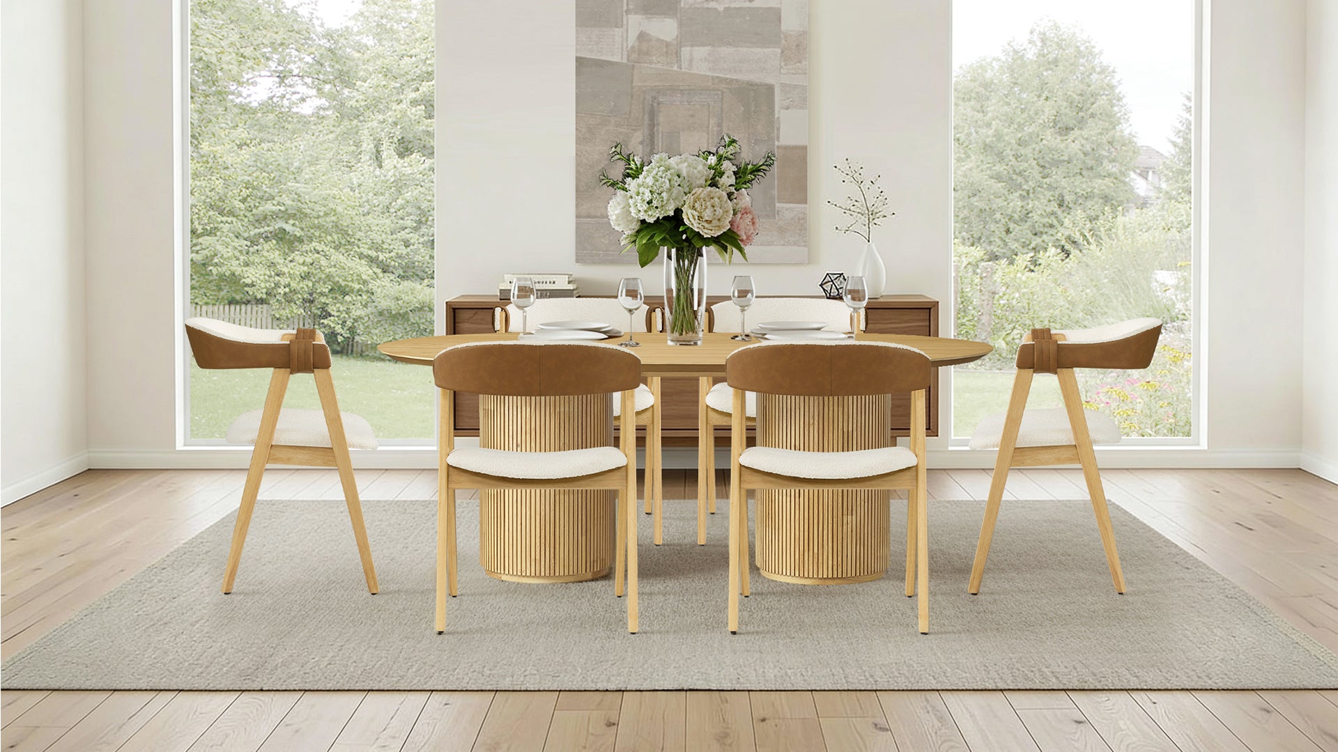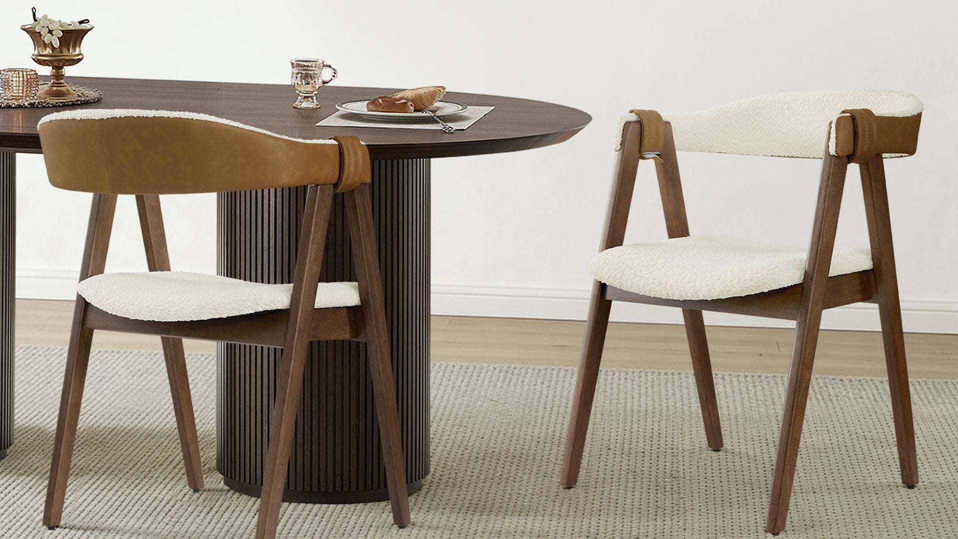 Winfred adds quiet warmth and comfort to your dining space with clean, mid-century silhouettes that complement modern and minimalist interiors. Crafted with an ergonomic curved back and a cushioned seat, it provides tailored support that invites guests to linger. The iconic solid wood triangle legs ensure a stable, wobble-free foundation, while the sophisticated mix of tactile chenille and durable faux leather offers lasting, refined elegance.