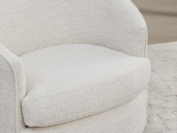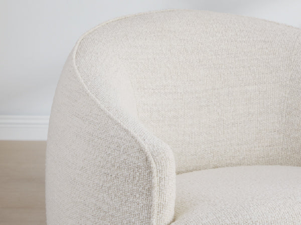 The accent chair upholstered in luxurious textured boucle fabric, embodies a blend of contemporary chic and cozy comfort. It enhances any setting with its sophisticated silhouette and soft, inviting texture.