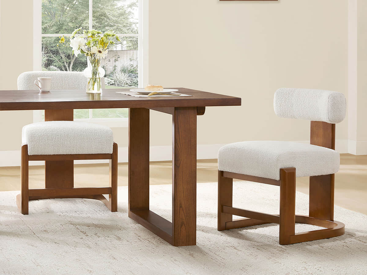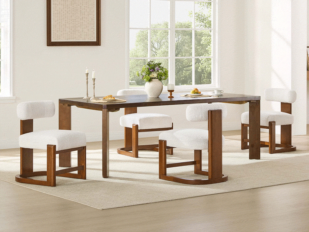 Upholstered in textured bouclé, this dining chair combines a sculptural form with a sturdy solid wood frame — a stylish yet comfortable piece designed for everyday living.