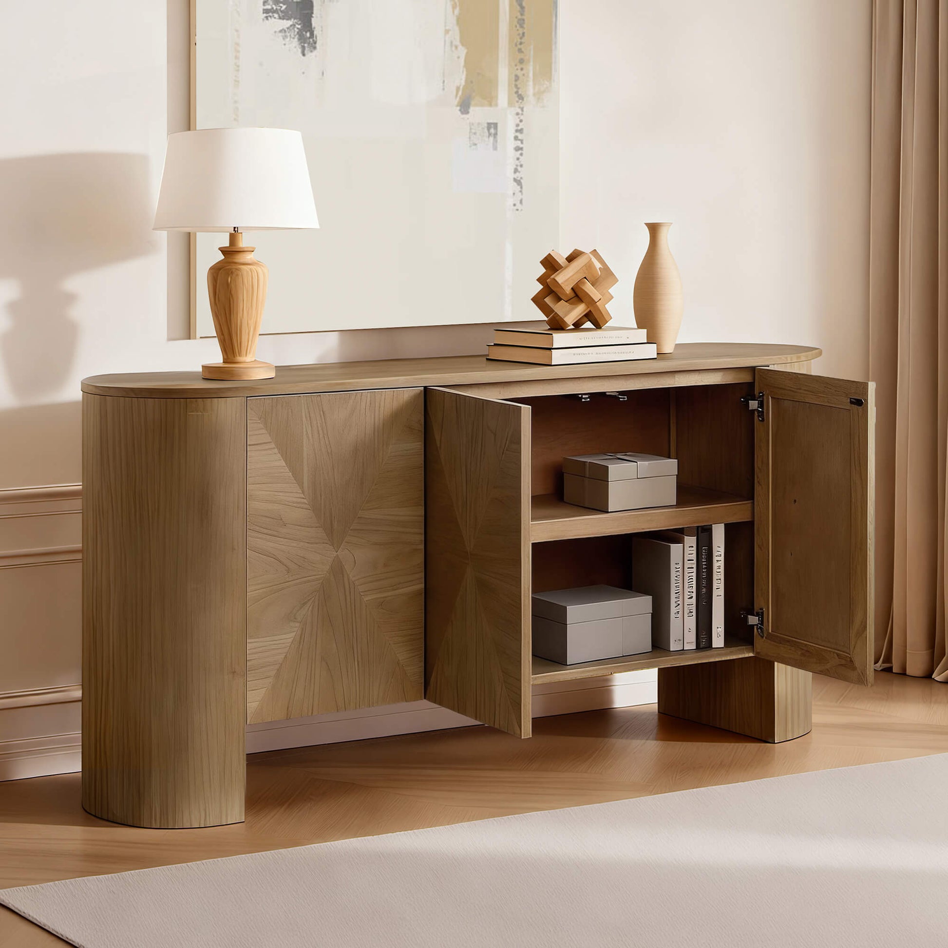 This Bryan sideboard blends natural ash warmth with refined architectural shaping to create a visually calm yet elevated presence. The ash-veneered exterior highlights gentle organic grain, while the push-to-open design keeps the façade clean and uninterrupted. Built with an upgraded 18mm plywood core for superior stability, it brings natural harmony to any dining or living space.