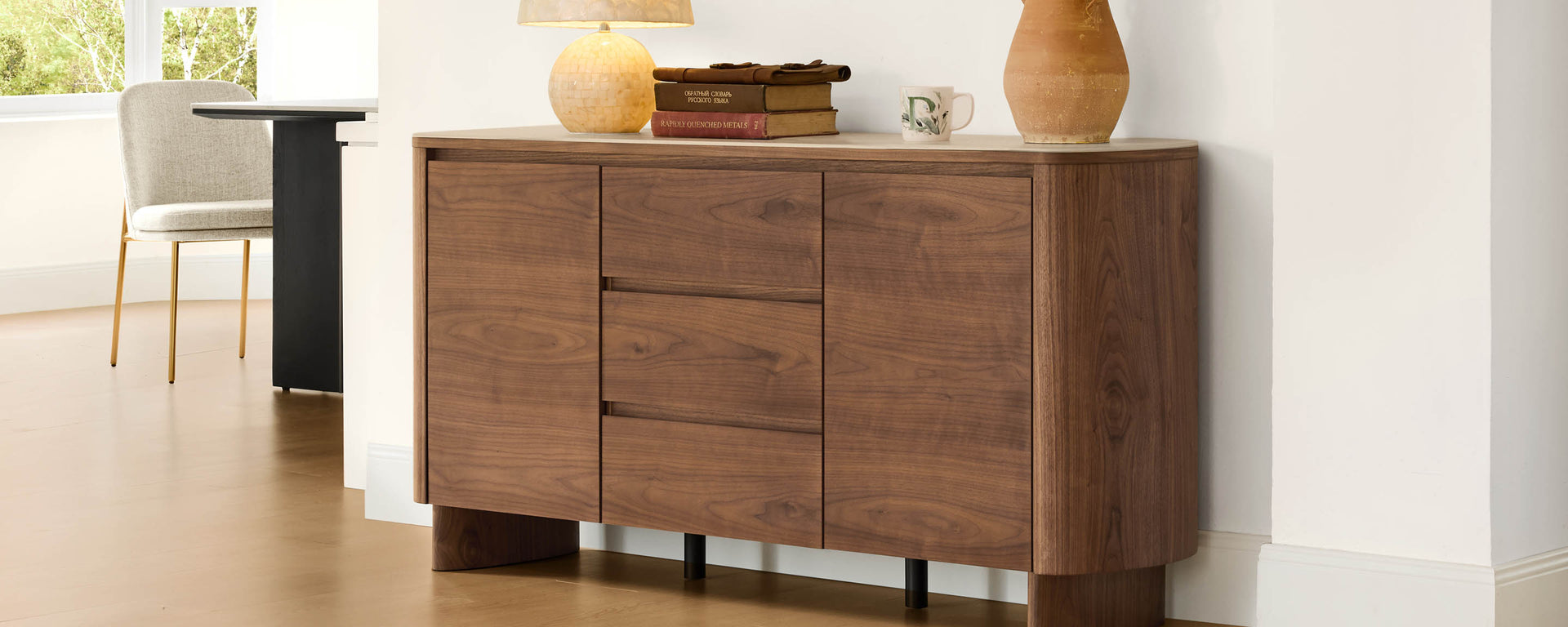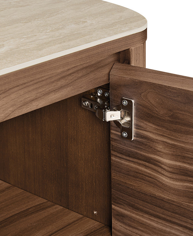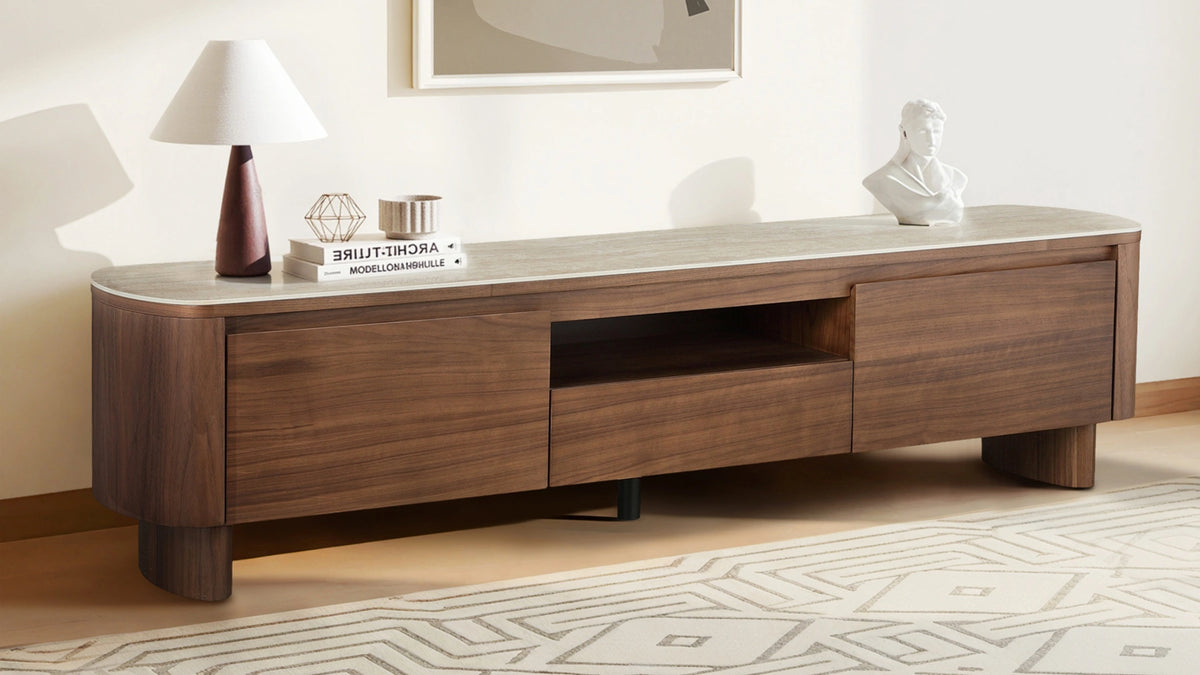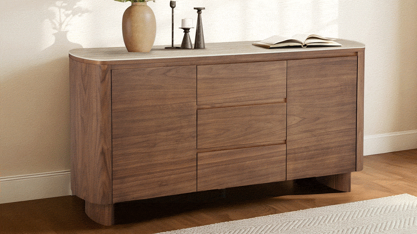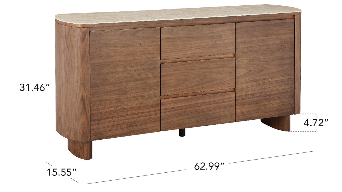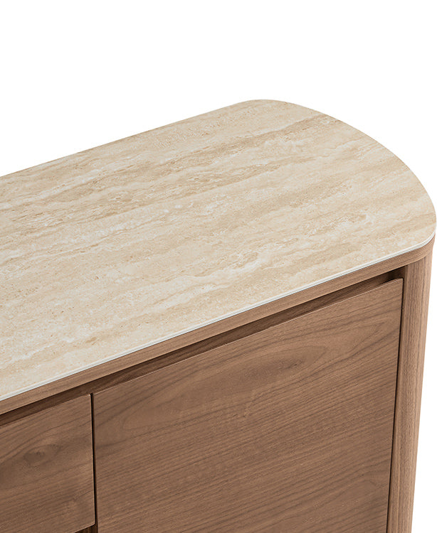 Chad Sideboard pairs natural walnut veneer with a smooth 0.2" travertine sintered stone top, creating a timeless balance of warmth and refinement. Its curved corners and concealed handles lend a clean, modern silhouette, while three drawers and two side cabinets offer generous storage for dining or living essentials. Thoughtfully crafted to last, with simple assembly—just attach the legs.
