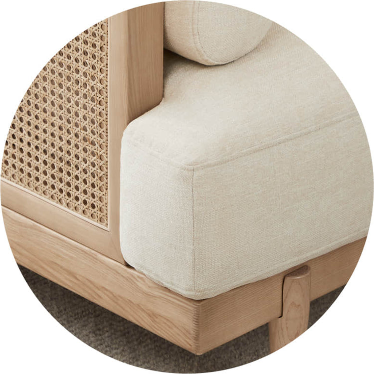 The Julane Modern Cane Sofa is a thoughtfully designed statement piece, crafted with solid ash wood trims, woven rattan panels, and a soft linen fabric that adds a touch of organic flair and warmth to any living room. Its clean silhouette, marked by straight lines from the wood, is balanced elegantly by the cylindrical arm pillows and plush cushions.
