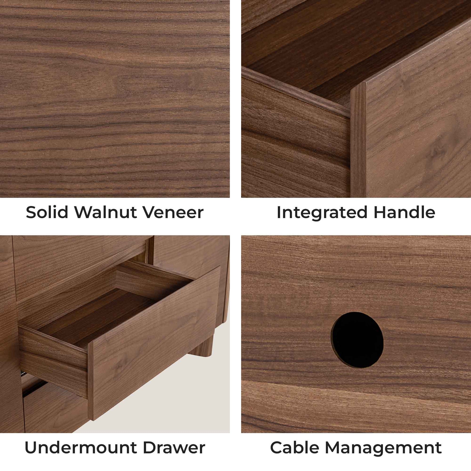 Chad Sideboard pairs natural walnut veneer with a smooth 0.2" travertine sintered stone top, creating a timeless balance of warmth and refinement. Its curved corners and concealed handles lend a clean, modern silhouette, while three drawers and two side cabinets offer generous storage for dining or living essentials. Thoughtfully crafted to last, with simple assembly—just attach the legs.