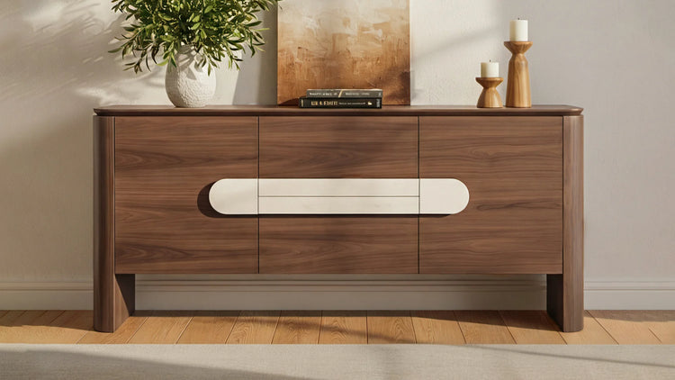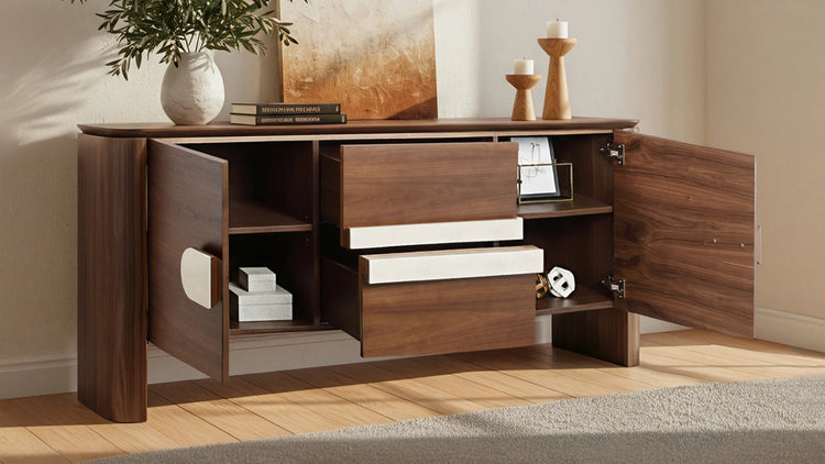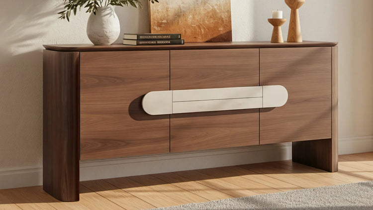 Defined by its sculpted silhouette and reeded oak front, the Moore Sideboard brings quiet sophistication to any space. Rounded edges soften its form, while the recessed black metal base adds contemporary balance. Behind four soft-close doors, thoughtful compartments organize essentials with elegance and ease — design, function, and craftsmanship in harmony.