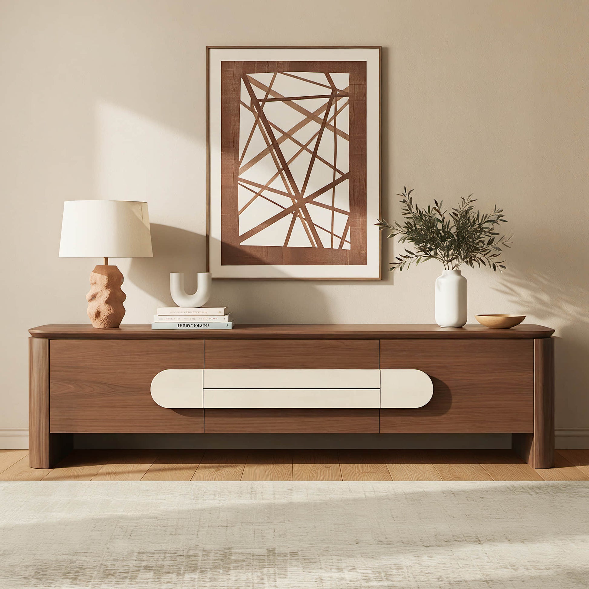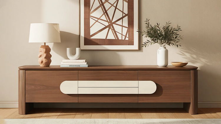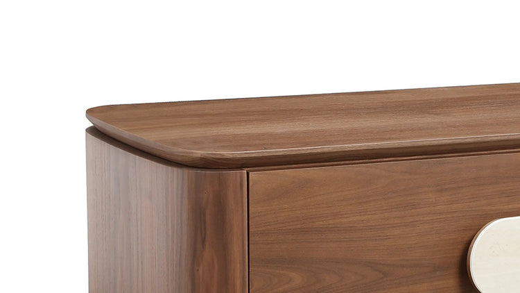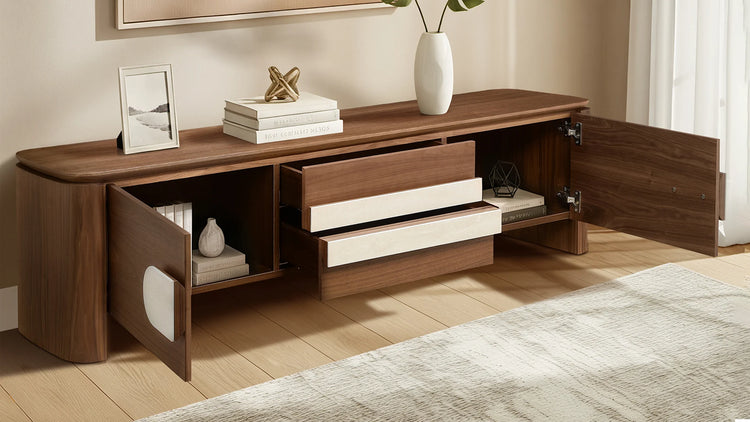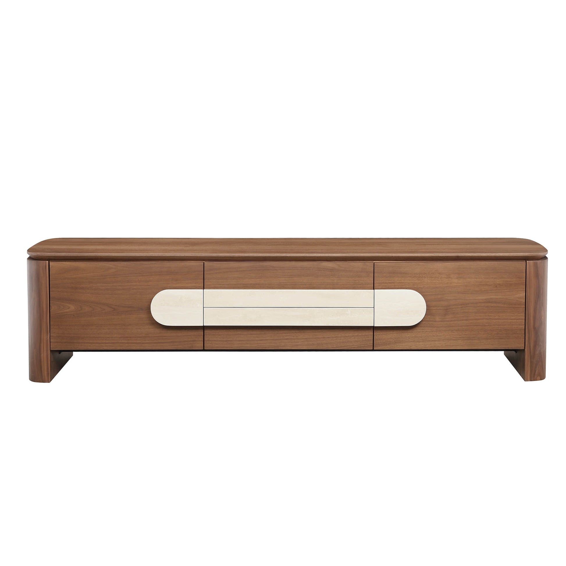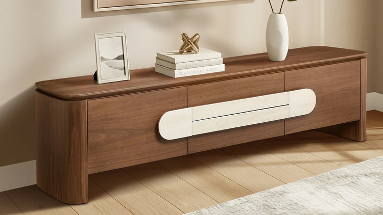 Blending modern minimalism with functional elegance, the Otis TV Stand anchors your media space with deep walnut warmth and subtle travertine accents. Rounded edges and a sculpted silhouette create a refined and tactile presence. Fully assembled and thoughtfully detailed, it’s a statement of craftsmanship that organizes, elevates, and endures.
