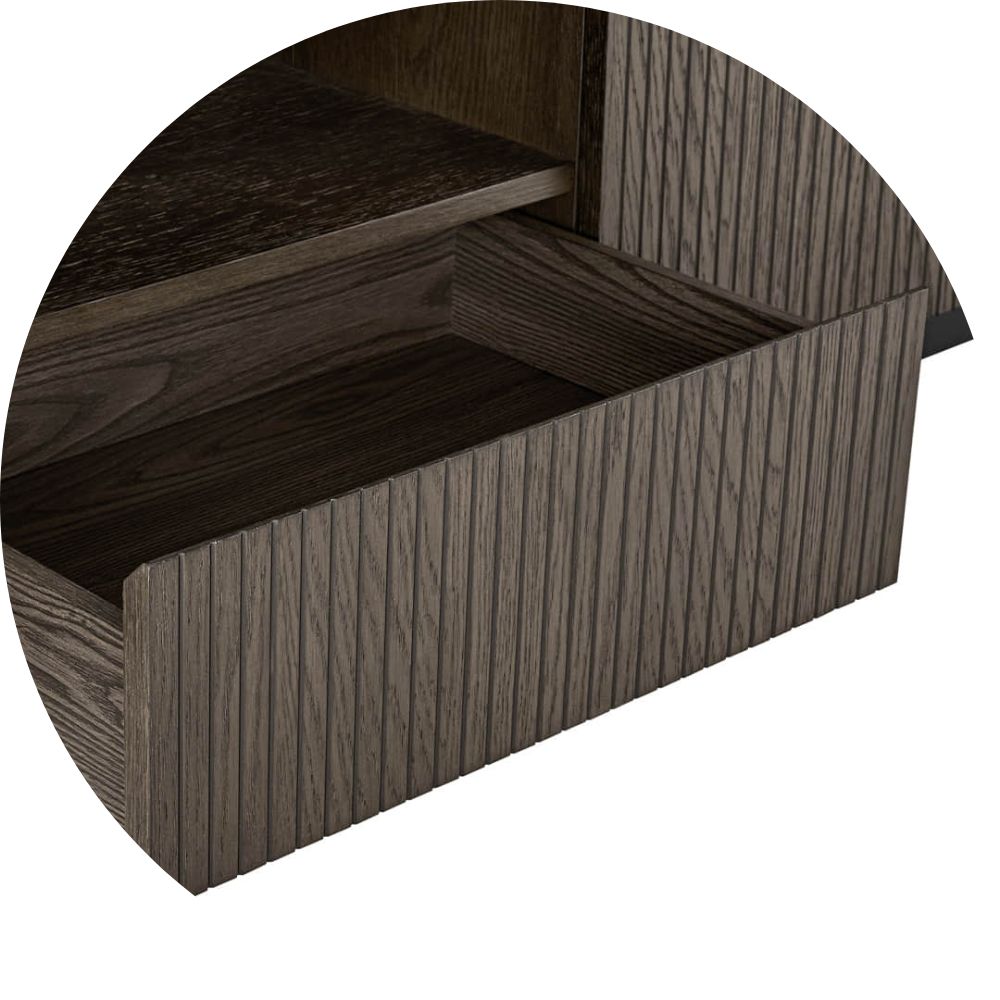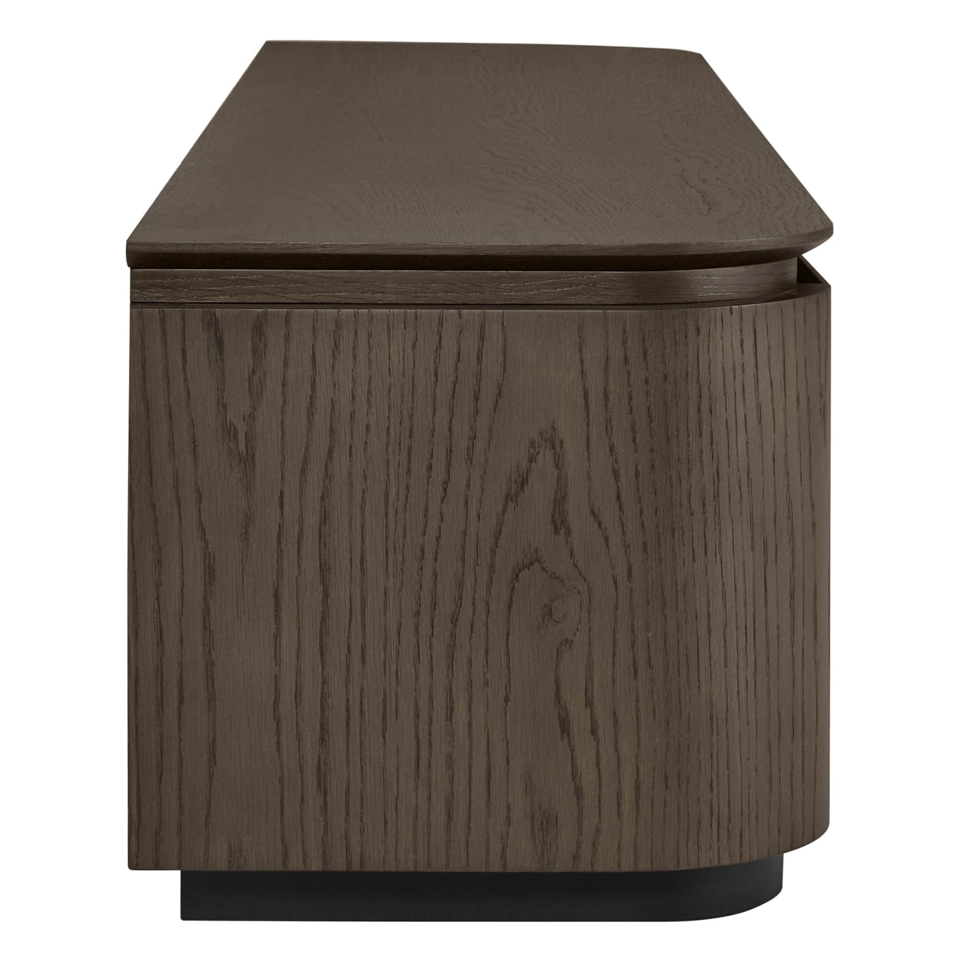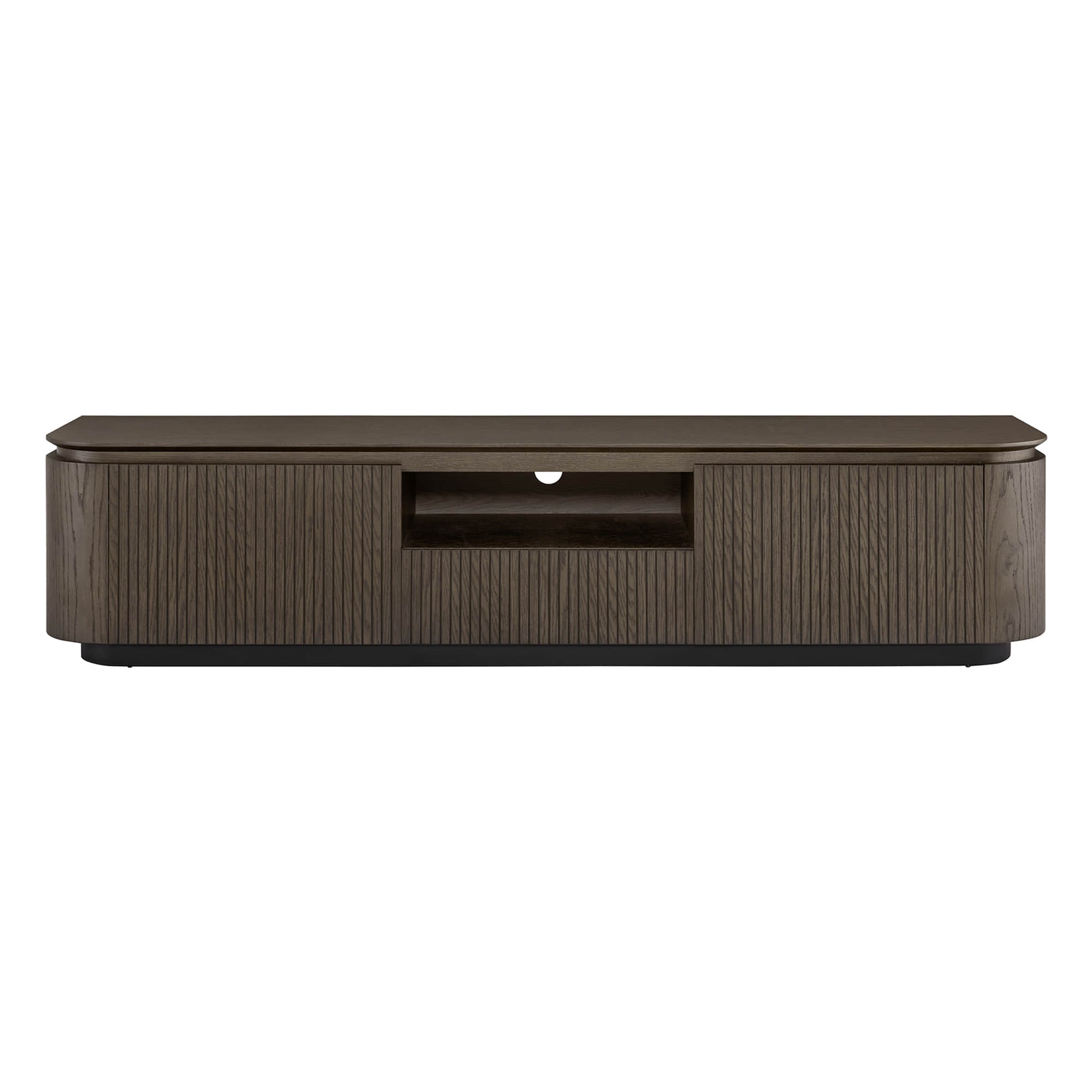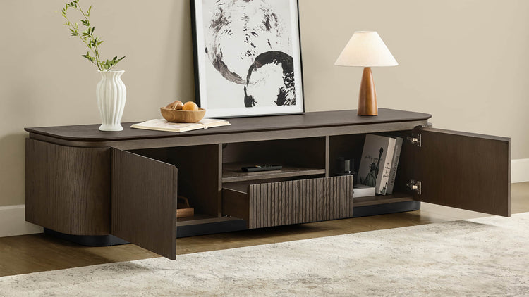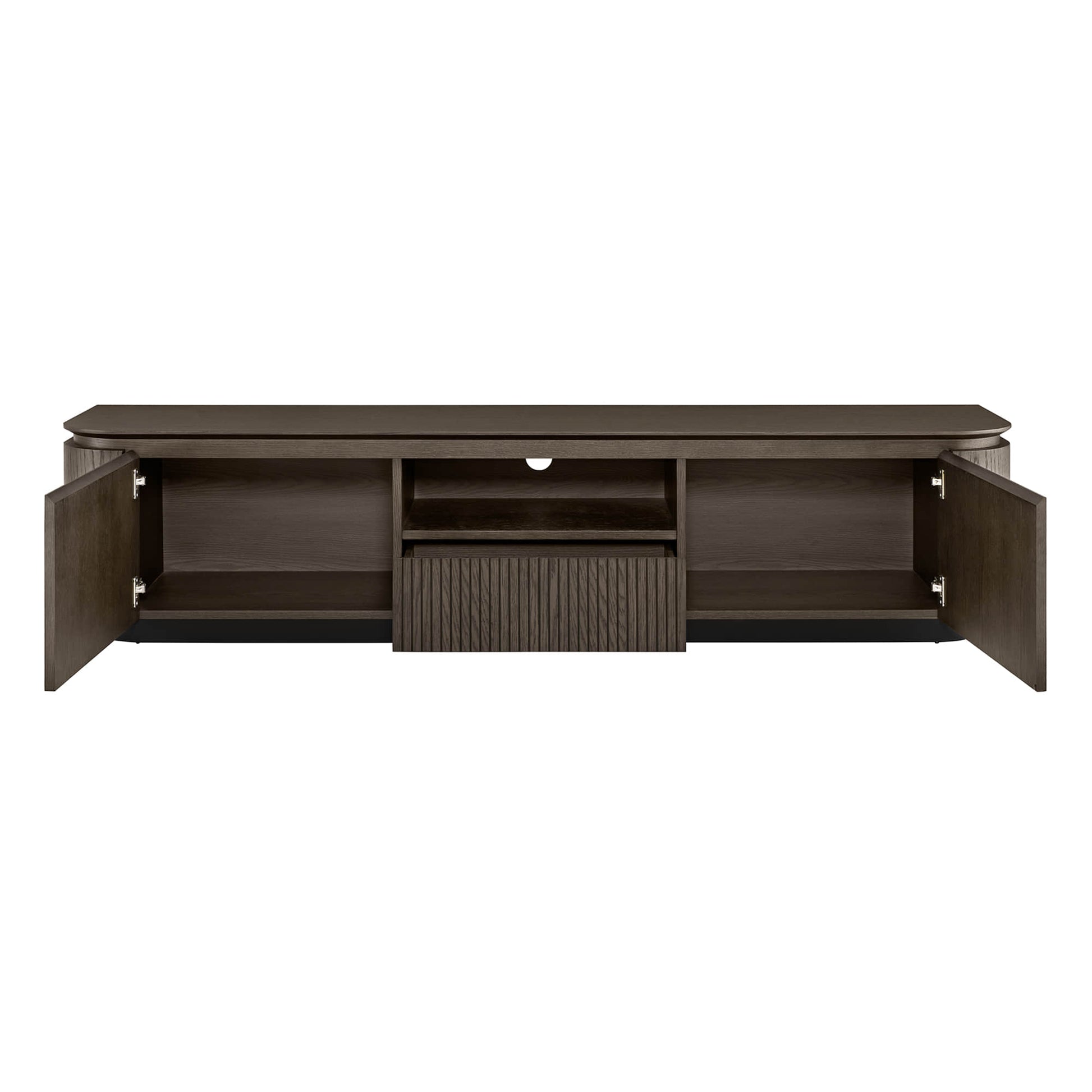 Sleek and grounded, the Moore TV Stand blends modern minimalism with mid-century warmth. Its dark brown oak-veneered body rests on a matte-black metal base, creating a balanced sense of strength and lightness. The signature reeded front catches light in quiet rhythm, while rounded edges soften its silhouette. A timeless centerpiece that brings refined harmony to contemporary living spaces.