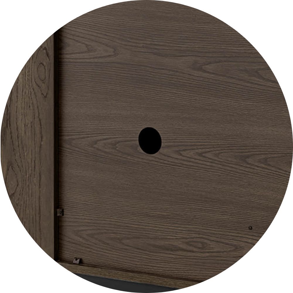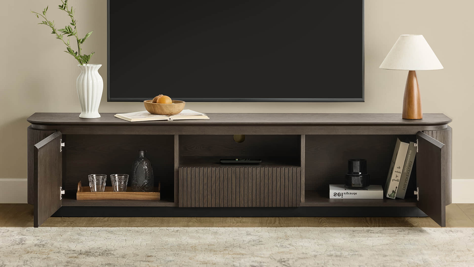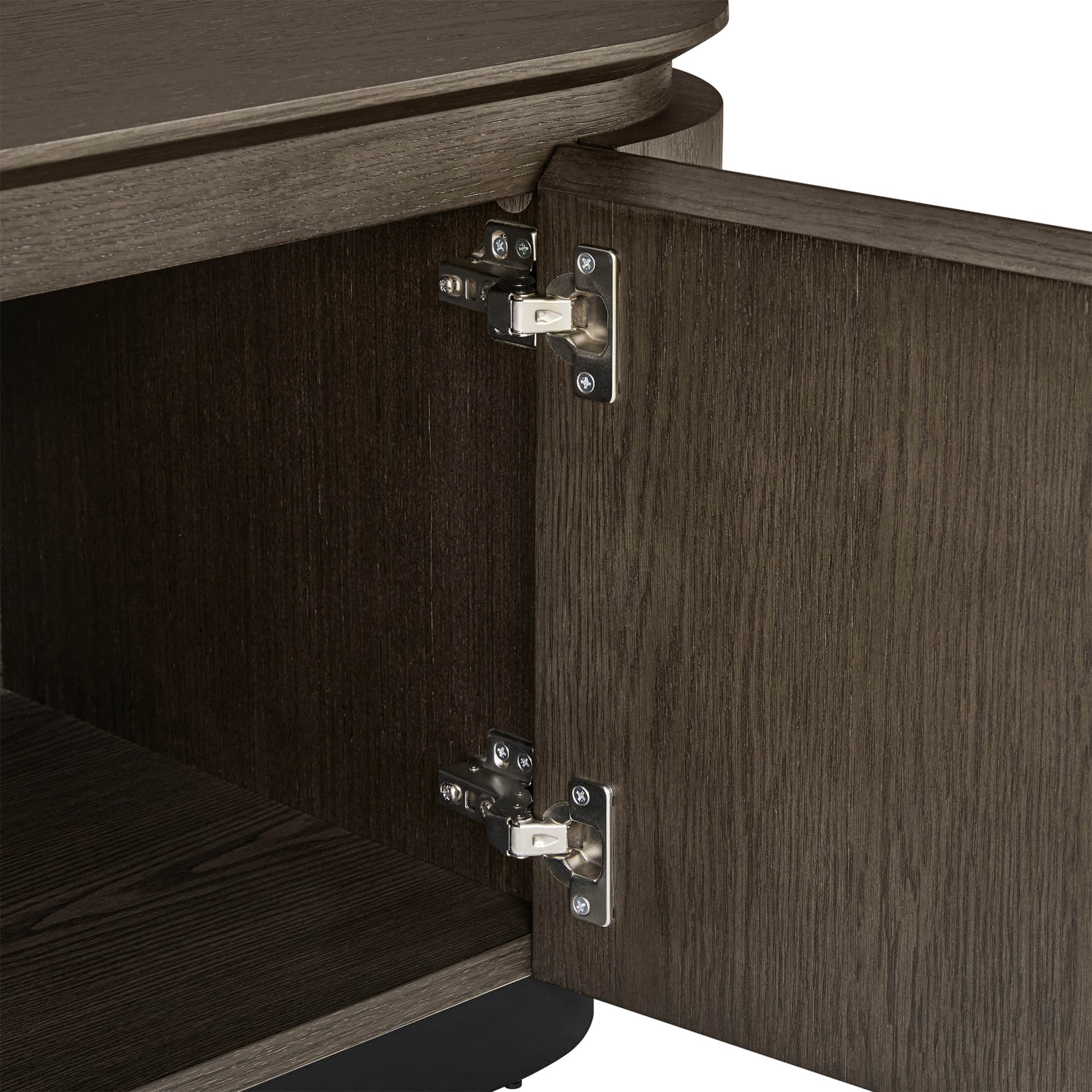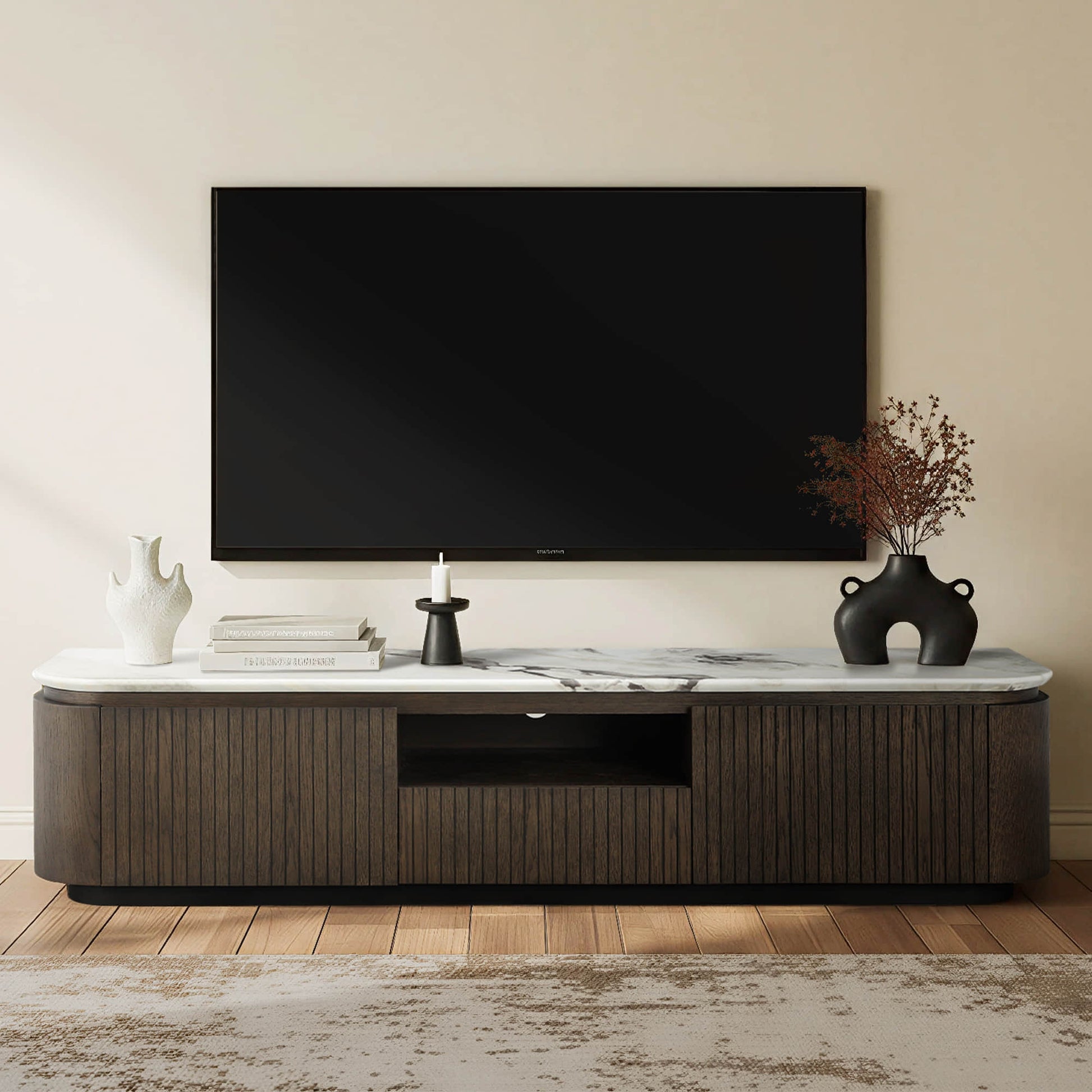 Sleek and grounded, the Moore TV Stand blends modern minimalism with mid-century warmth. Its dark brown oak-veneered body rests on a matte-black metal base, creating a balanced sense of strength and lightness. The signature reeded front catches light in quiet rhythm, while rounded edges soften its silhouette. A timeless centerpiece that brings refined harmony to contemporary living spaces.