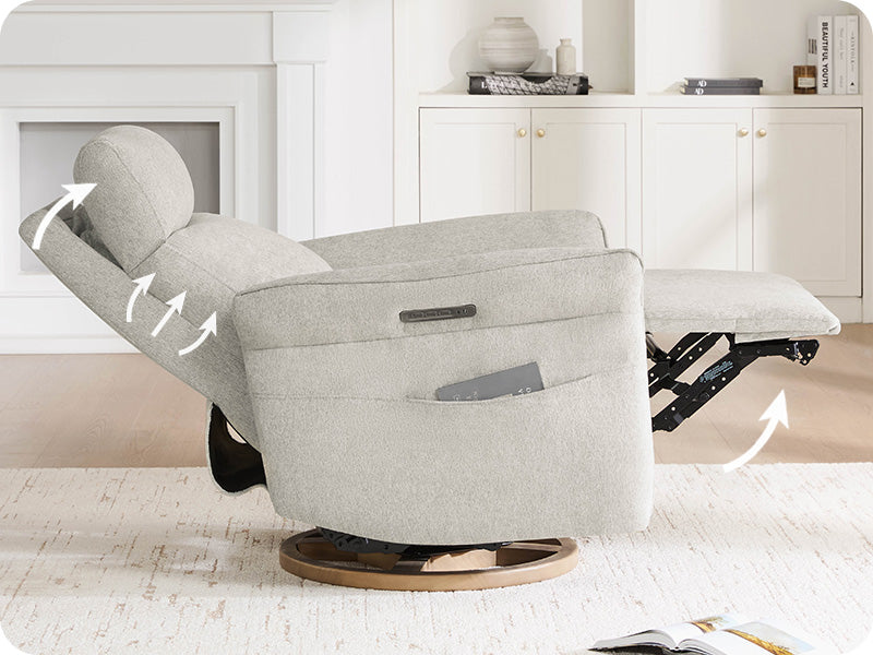 Designed for seamless relaxation, the Vinca recliner offers a 270° swivel, smooth gliding motion, and silent, fluid reclining to elevate your moments of rest. The no-sag spring platform, paired with ergonomically designed outward-turned armrests, ensures lasting support and comfort.