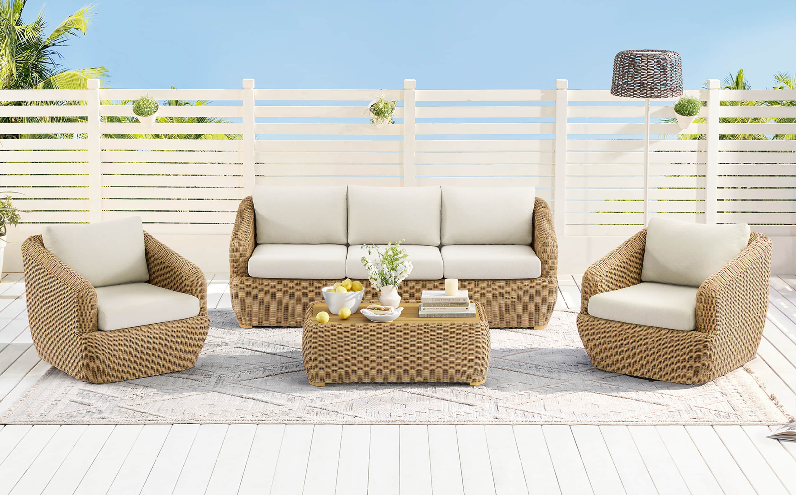 Warm honey-toned resin wicker paired with light taupe cushion. This creates an inviting, sunlit look. Matched with crisp off-white cushions, the contrast feels fresh, airy, and effortlessly outdoor-ready.