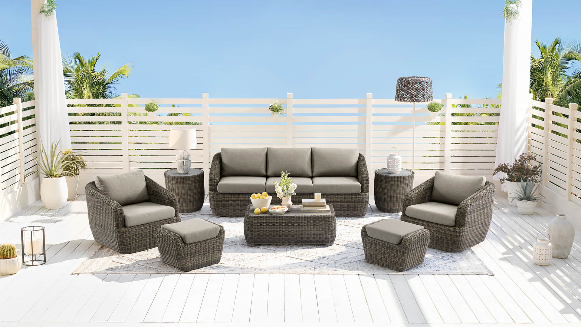 Multi-toned gray resin wicker paired with stone gray cushion. This brings subtle depth with a clean, modern feel. Paired with soft taupe cushions, the palette feels calm, balanced, and easy to style across outdoor settings.