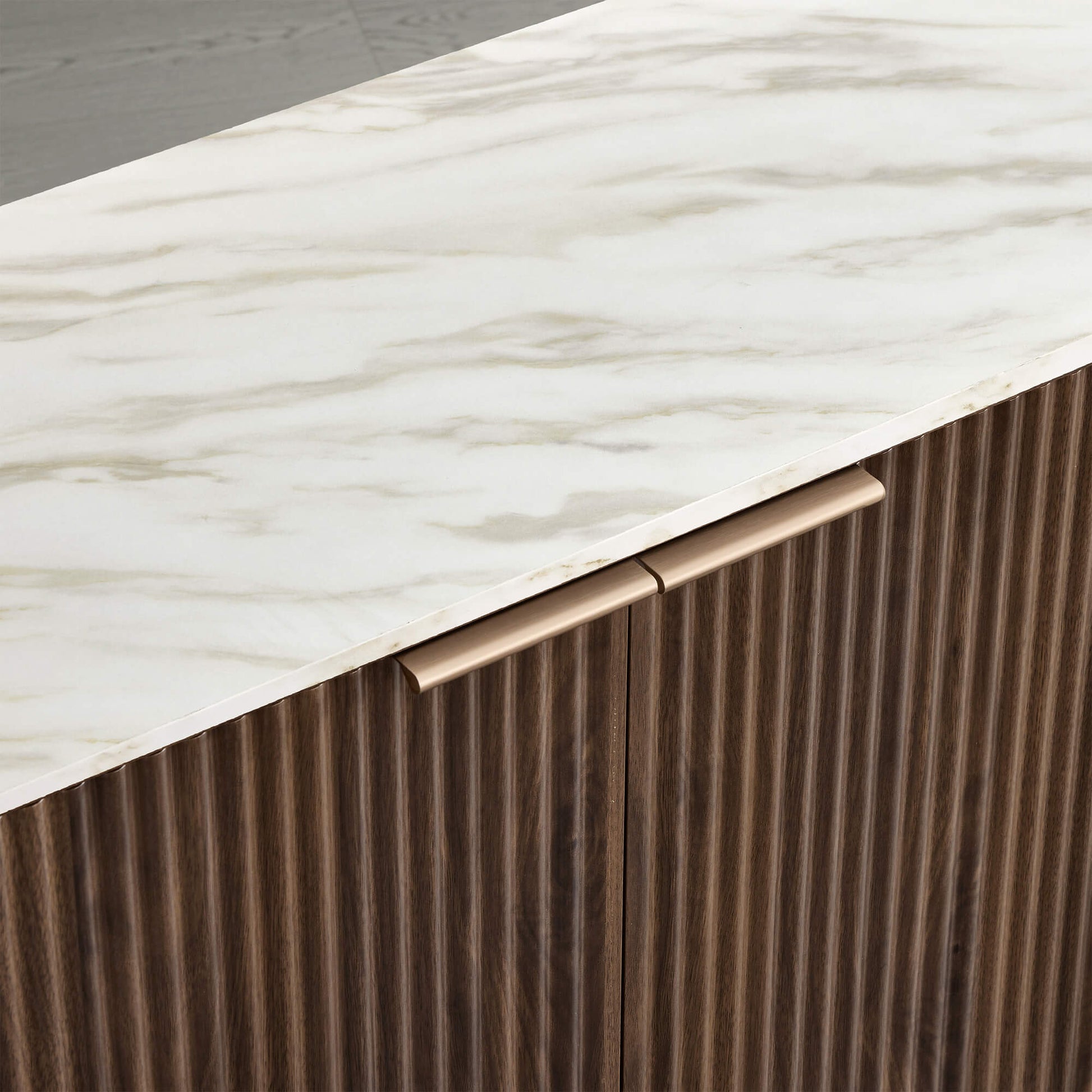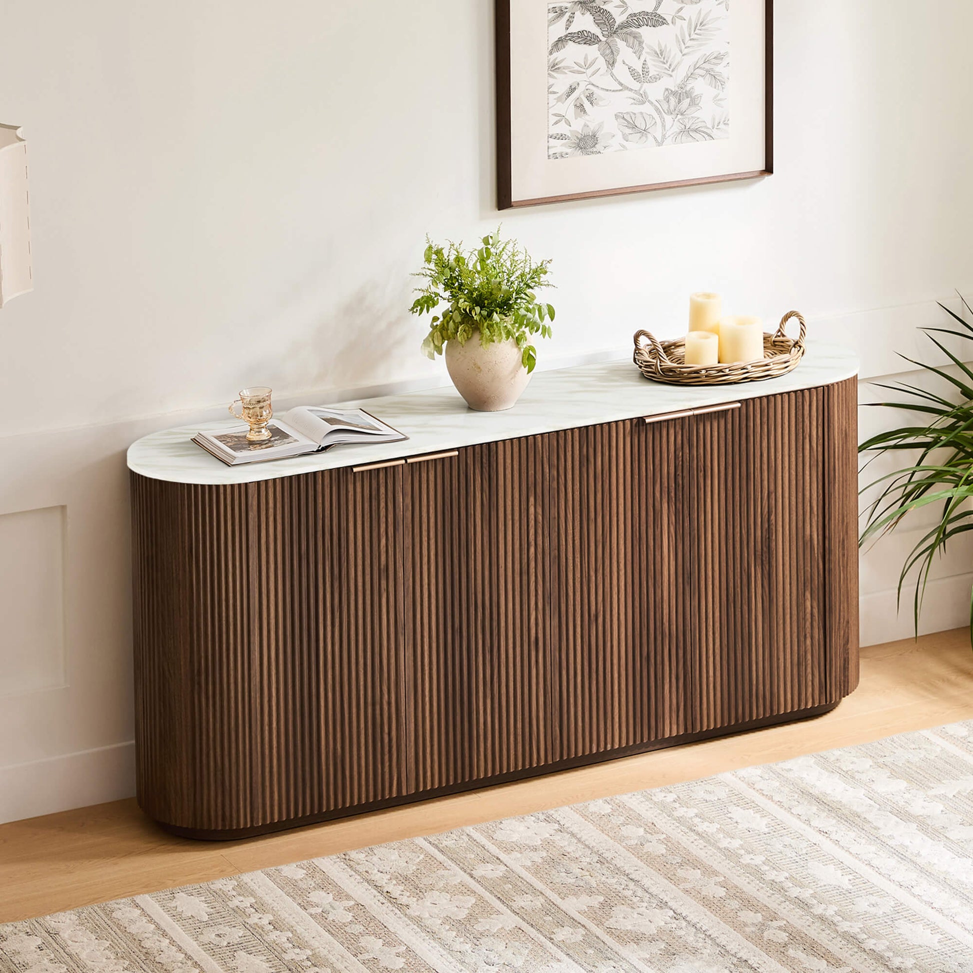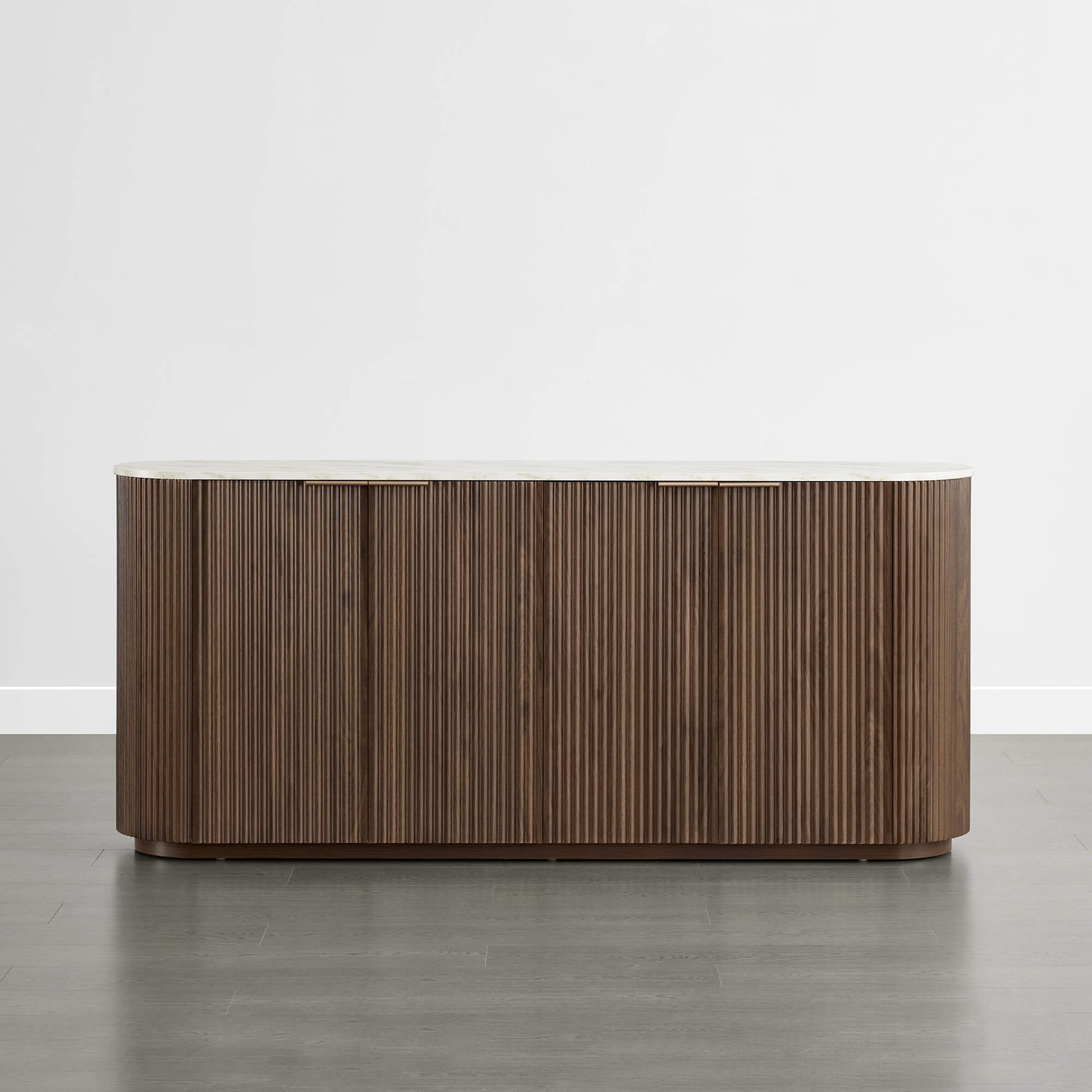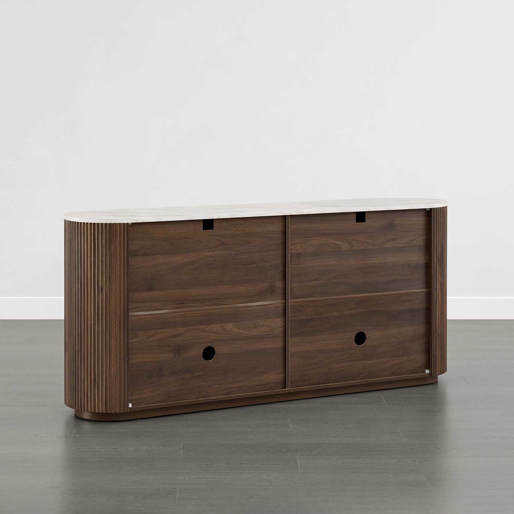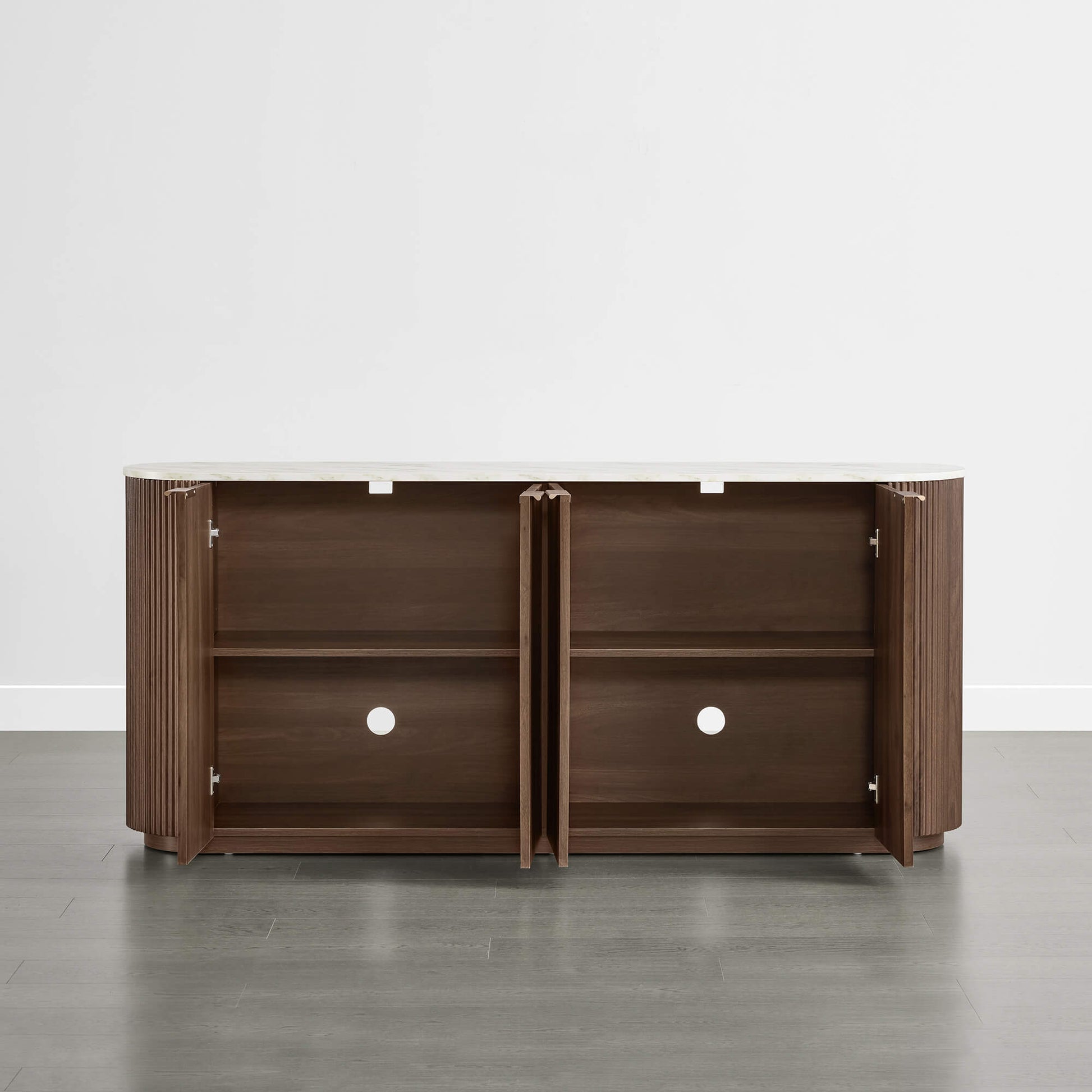 Bring sculptural elegance and everyday utility together with the Bowen Sideboard. Its expansive 70.1" width makes a bold statement while offering generous serving and display space. Choose a faux marble or wood-grain top to suit your style, while semi-cylindrical columns add both strength and grace. Inside, adjustable shelves adapt to dinnerware or décor. Built from eco-friendly panels with a scratch- and moisture-resistant finish, Bowen offers timeless durability and quiet soft-close convenience.