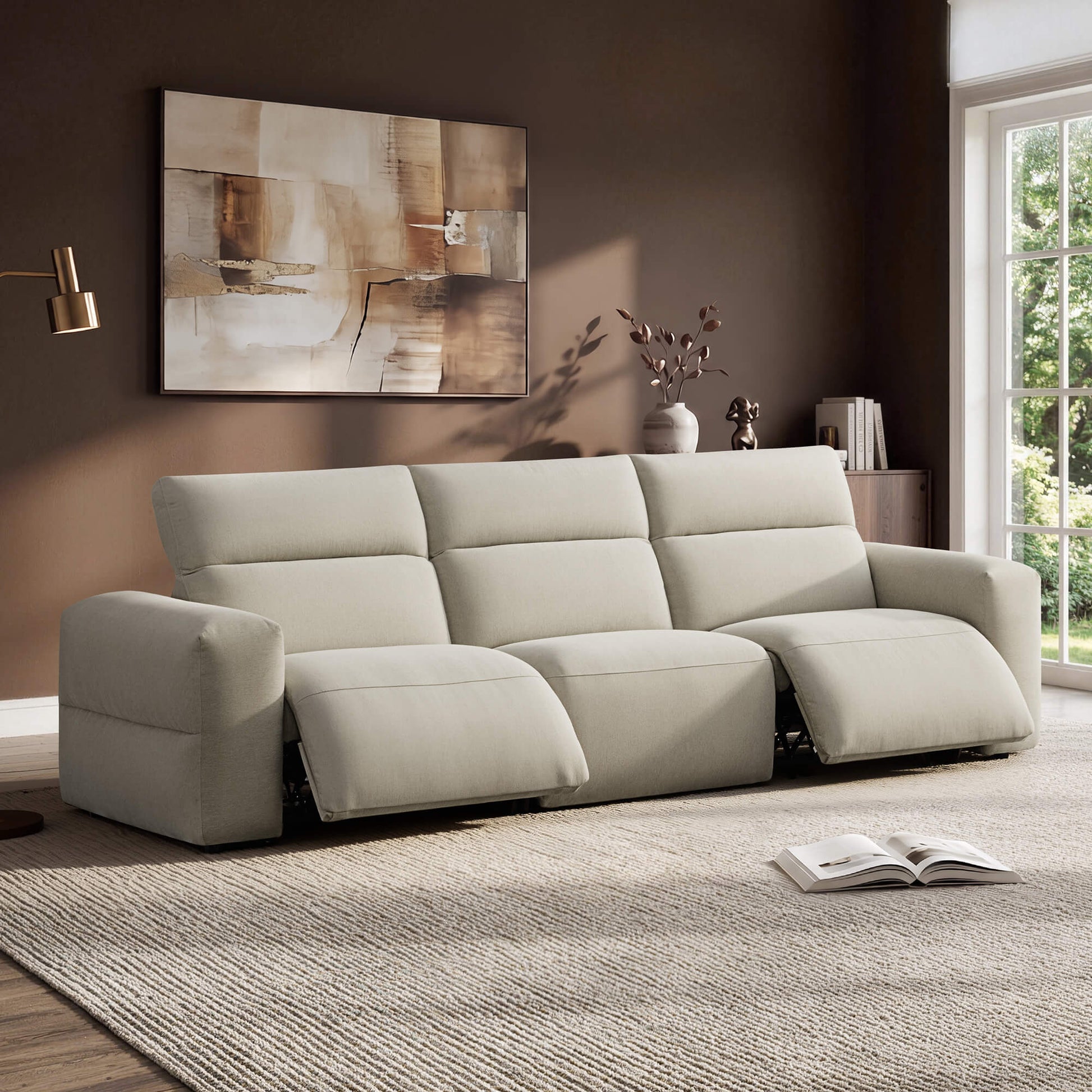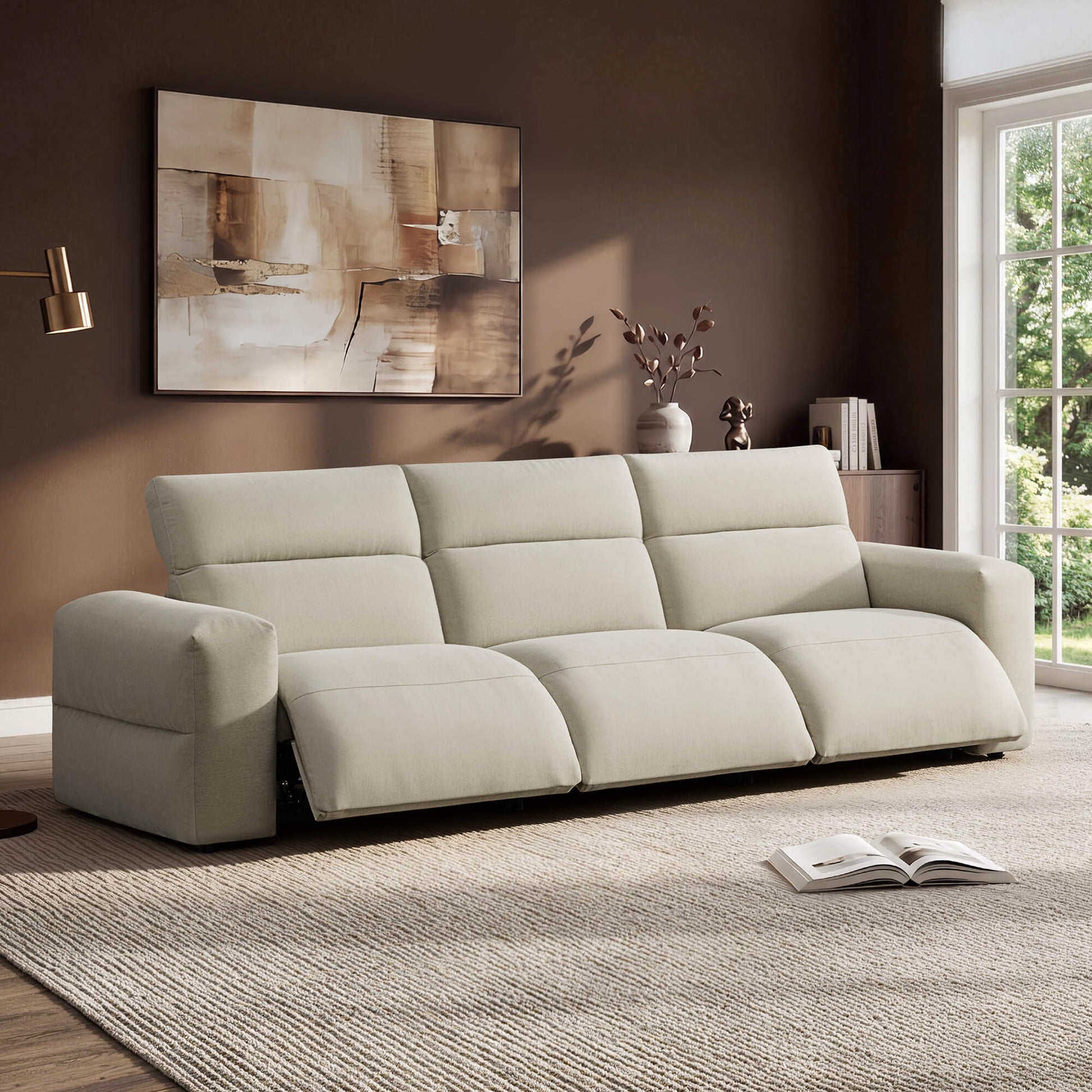 Recline smoothly with the power-adjustable headrest follows your posture. Wide 12.4" armrests anchor the body, creating a serene, grounded moment designed for effortless rest and quiet relaxation.