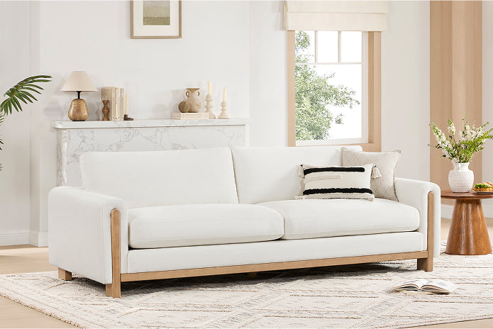 The Keaton Performance Sofa has a masterfully elegant silhouette, defined by its naturally warm-hued wood base that forms a harmonious H-shape. Inspired by Scandinavian design, its clean, sharp lines, contrasted against its gentle curves, offer a captivating visual balance that adds an organic feel to any space.