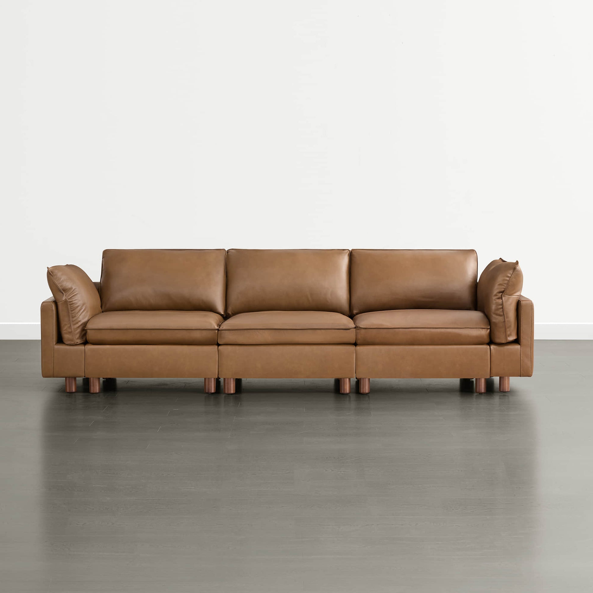 The Brendon Modular Sofa blends modern design with lasting comfort, available in buttery top-grain leather or soft, textured fabric. Its raised high-leg design adds airy elegance and easy cleaning, while oversized armrests and adjustable cushions offer personalized support. Plump cushions with zip-off covers make upkeep effortless, keeping every pillow fresh and inviting through daily lounging. Built from FSC® Certified, kiln-dried wood with a no-sag spring system, Brendon delivers timeless style and everyday ease.