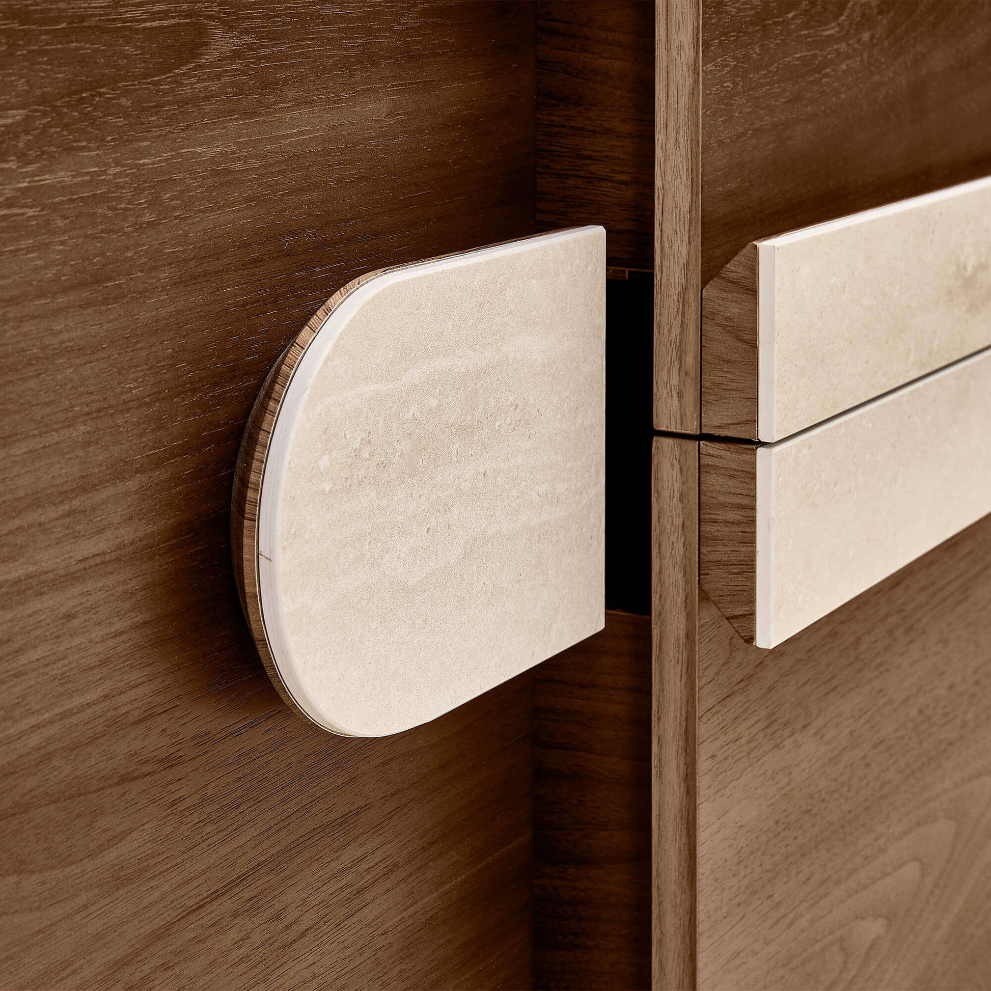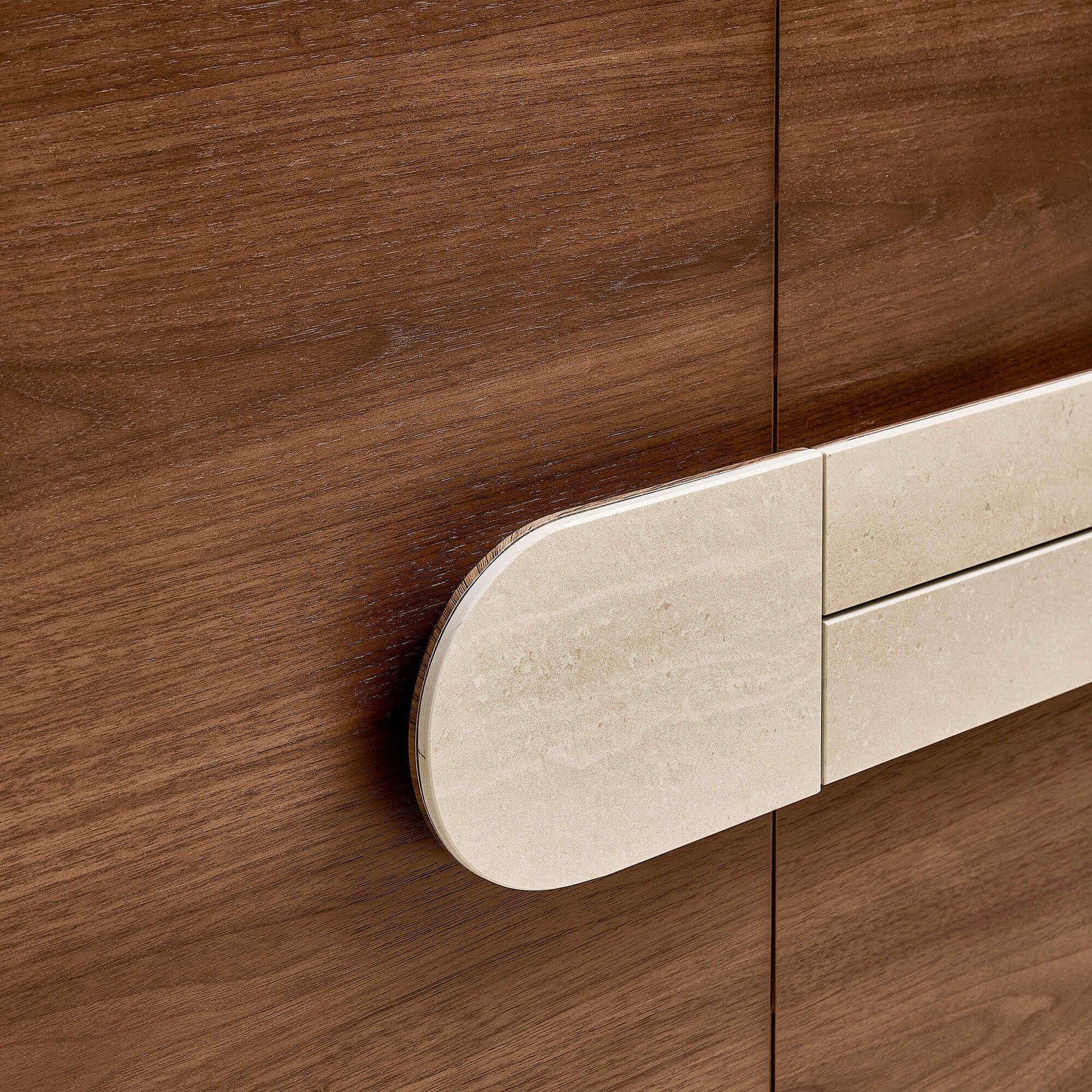 Rooted in modern minimalism, the Otis Sideboard embodies quiet sophistication through natural materials and sculpted form. The deep walnut body reveals a calming grain, while the creamy travertine-inspired handle creates a striking yet balanced contrast. Rounded corners and softened edges lend a refined, tactile finish that feels both modern and timeless. Designed for elevated living, Otis merges craftsmanship with thoughtful function — complete with concealed cable cutouts and a fully assembled structure built to endure.