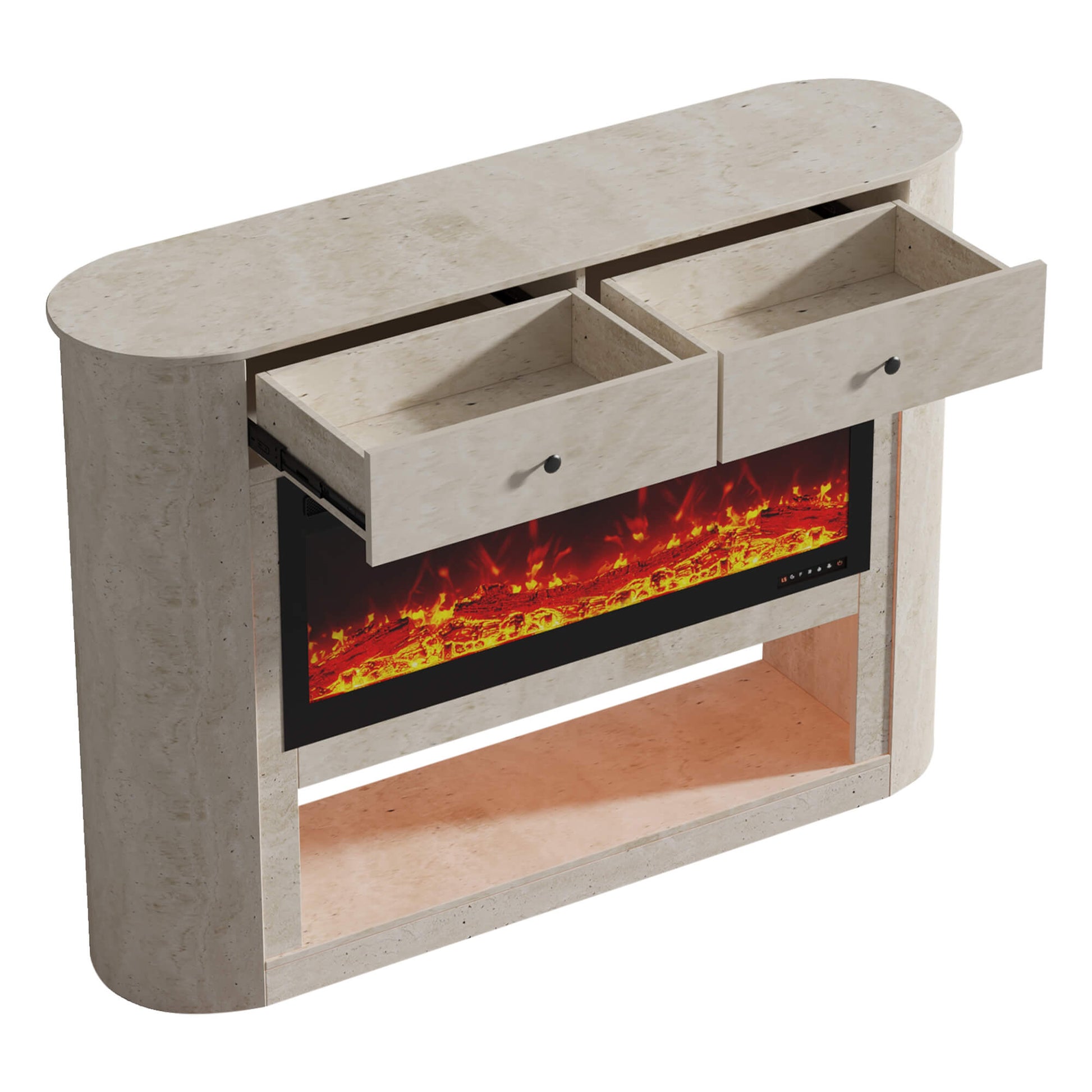 This travertine fireplace sideboard brings warmth, texture, and modern sophistication into any dining or living space.A built-in LED fireplace enhances the cabinet with customizable ambience—featuring 7-level flame brightness and soft, eye-friendly illumination.The engineered stone surface giving the piece a substantial, architectural presence.