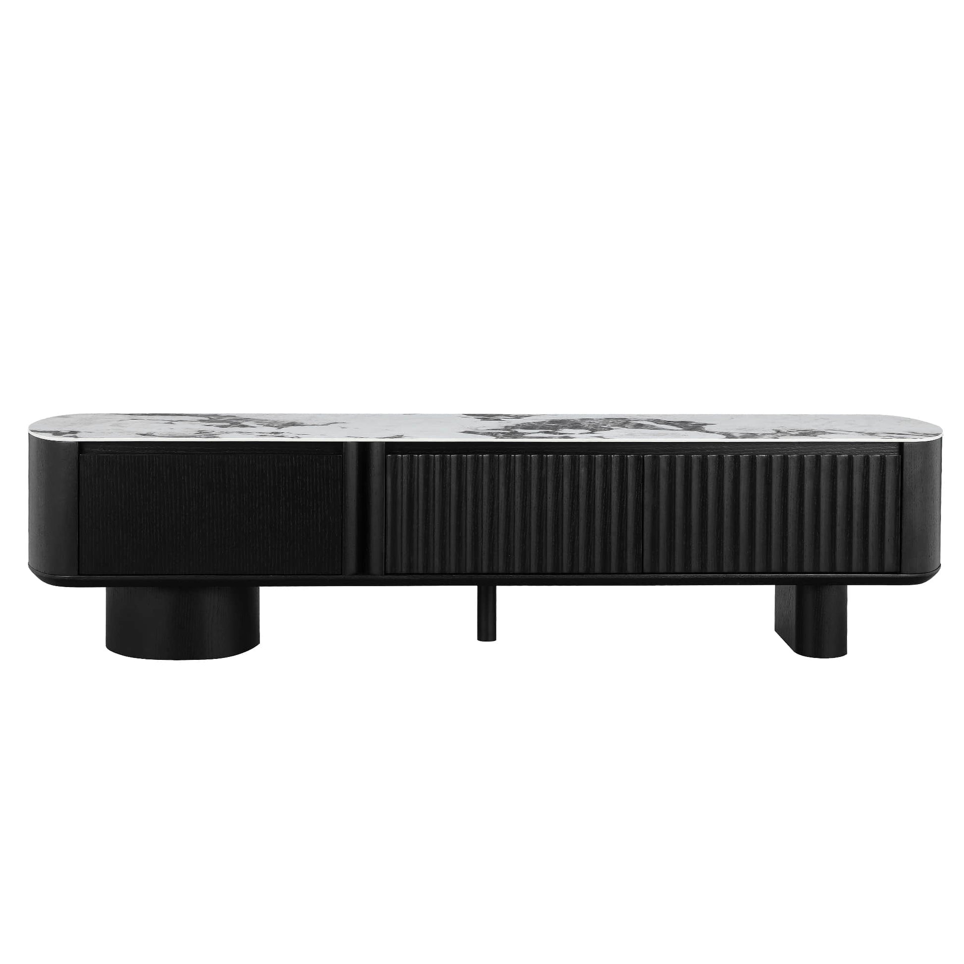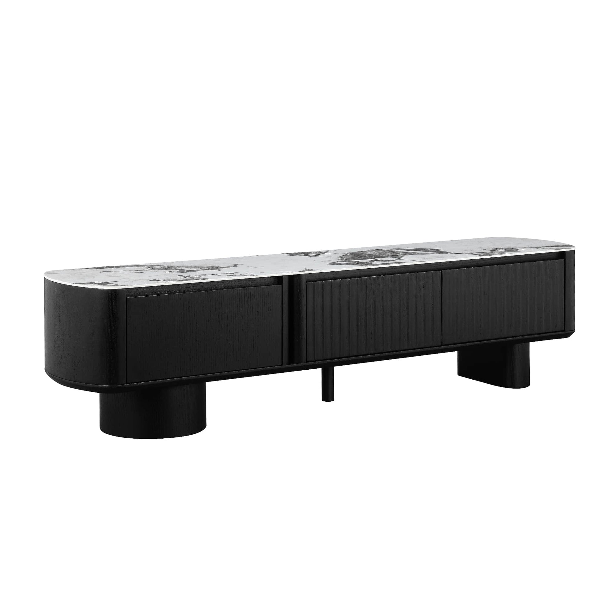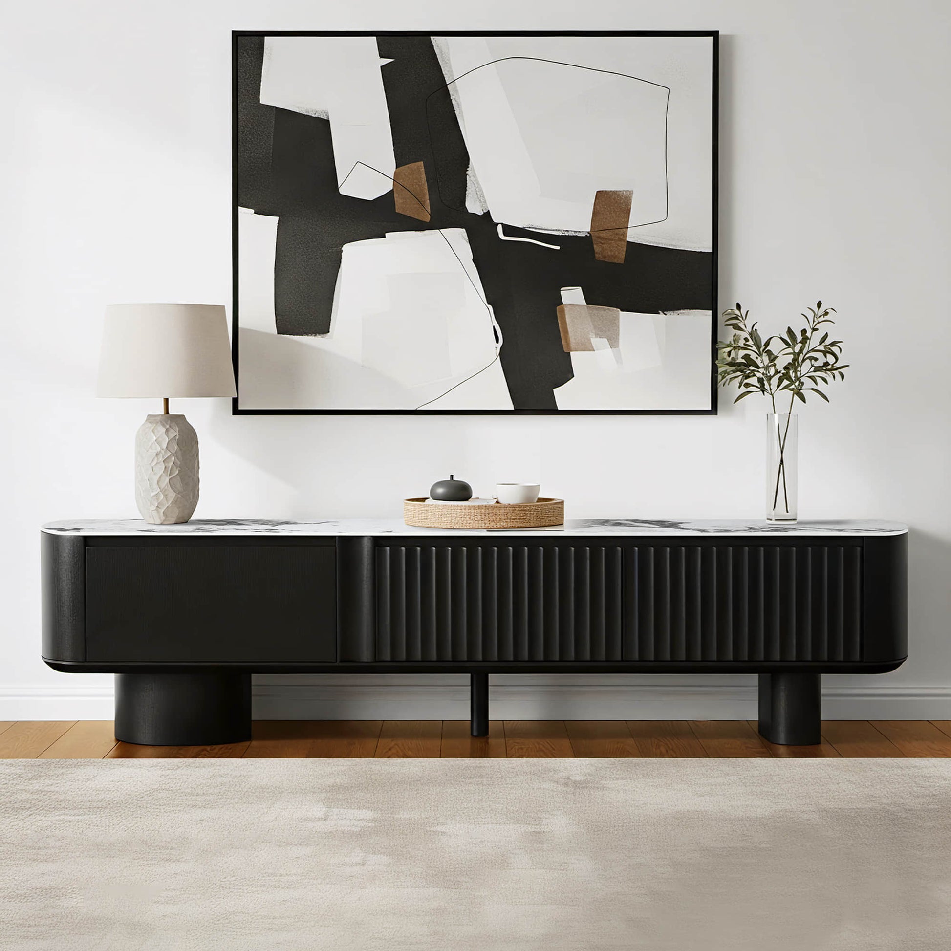 This Rex TV console is a masterpiece of modern design, blending luxurious marble and textured black wood to create an atmosphere of sophistication and opulence. Its robust structure and unique leg composition not only ensure durability and stability but also inject a bold artistic flair. With ample storage solutions and meticulous craftsmanship, it’s a high-value statement piece that elevates any living space, balancing functionality and upscale aesthetics seamlessly.