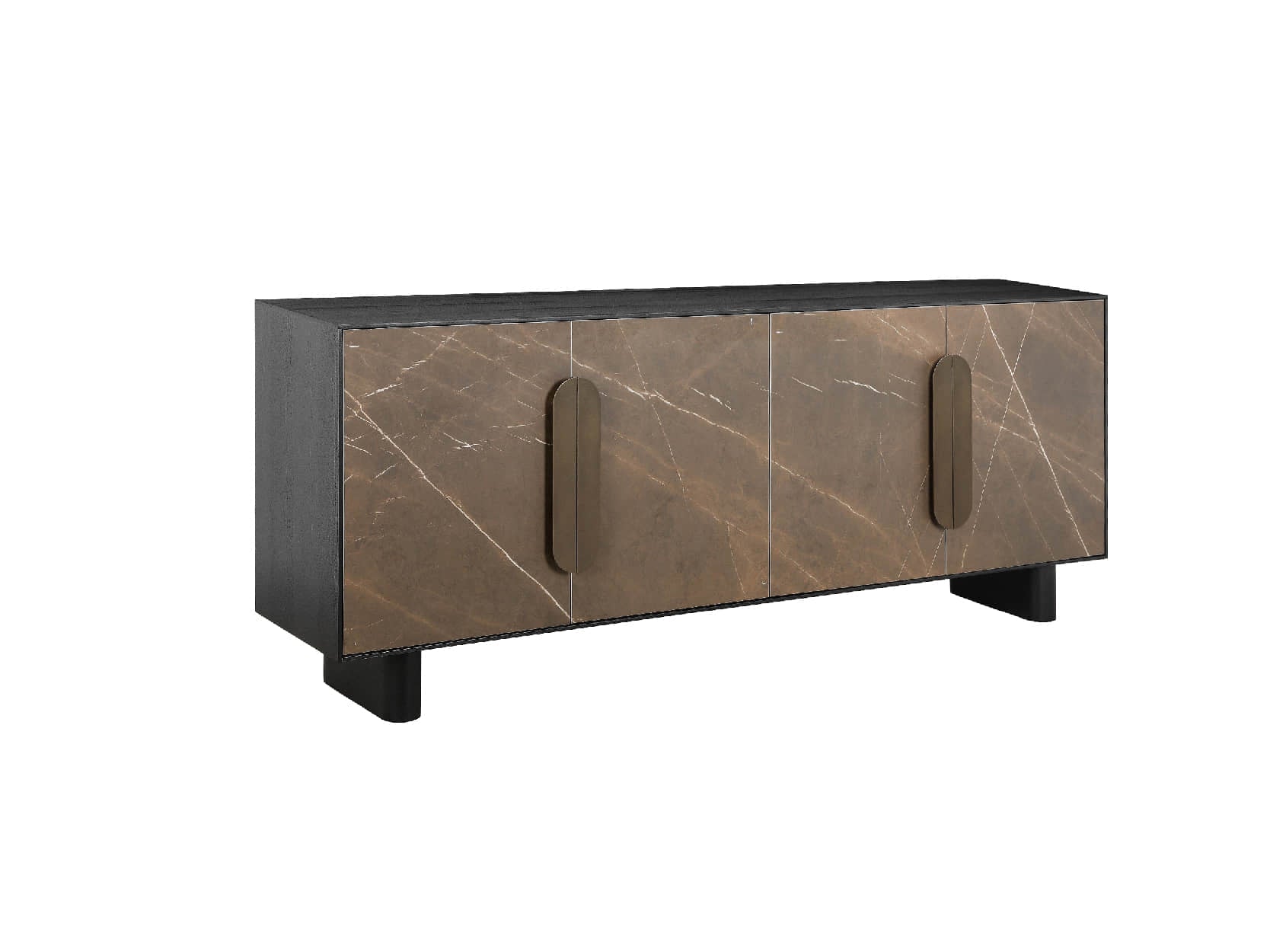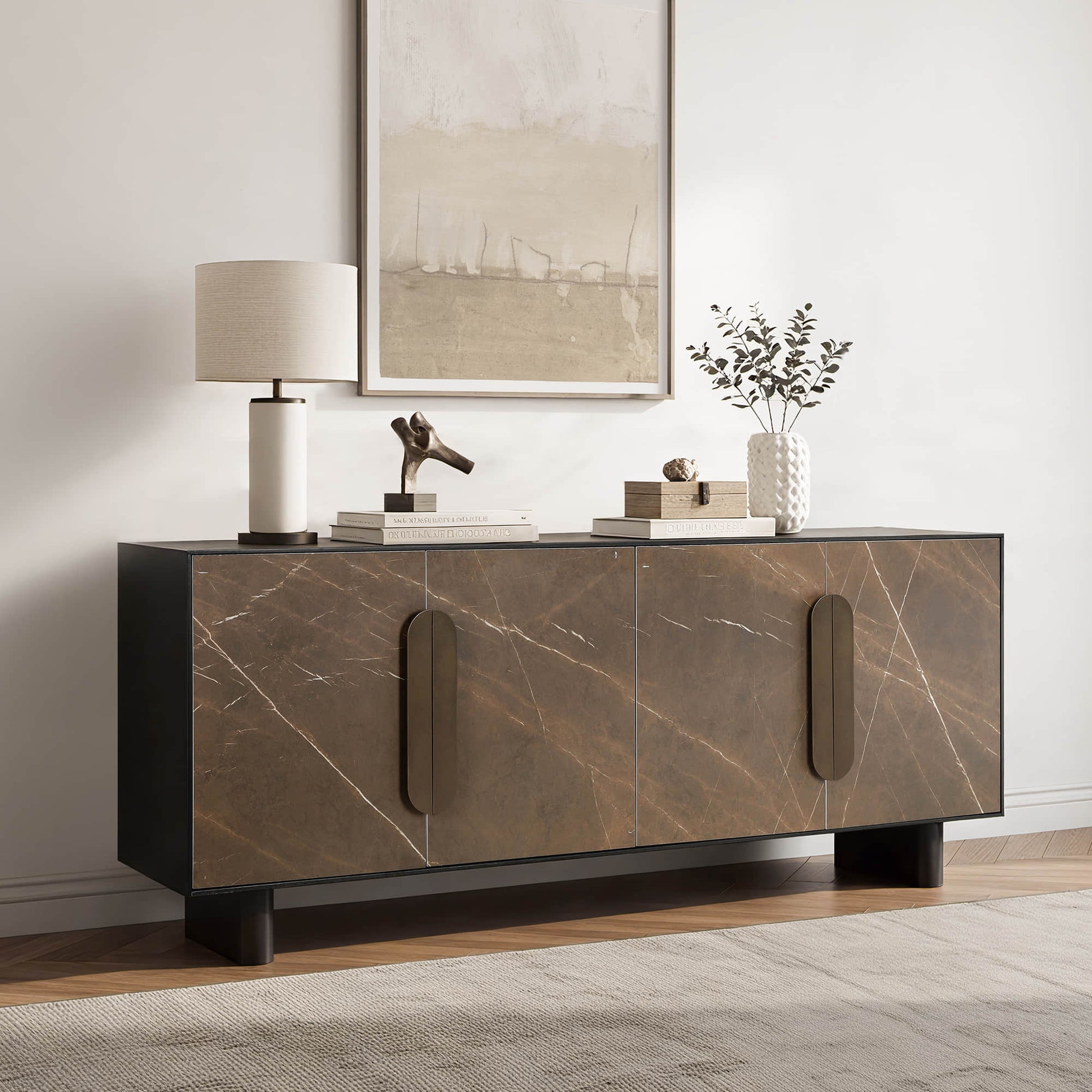 The 79" Vito Metal-Accent Sideboard is defined by its sculptural steel frame, which introduces a contemporary and elegant silhouette from the very first glance. Complemented by ceramic door fronts and precision metal accents, it gains a refined, enduring character. Its deep, calming color palette further enhances its poised presence, allowing it to transition seamlessly from Scandinavian purity to urban contemporary spaces—balancing visual substance with an appealing sense of lightness.
