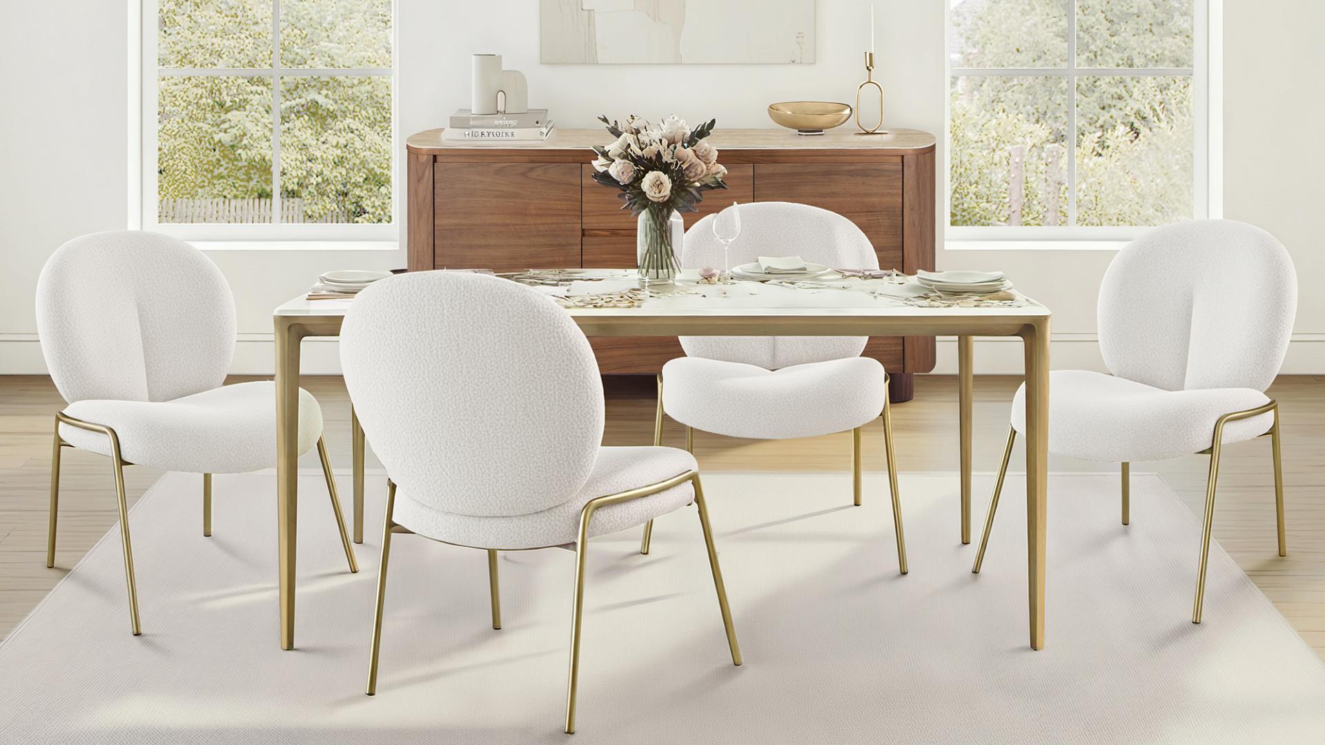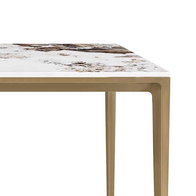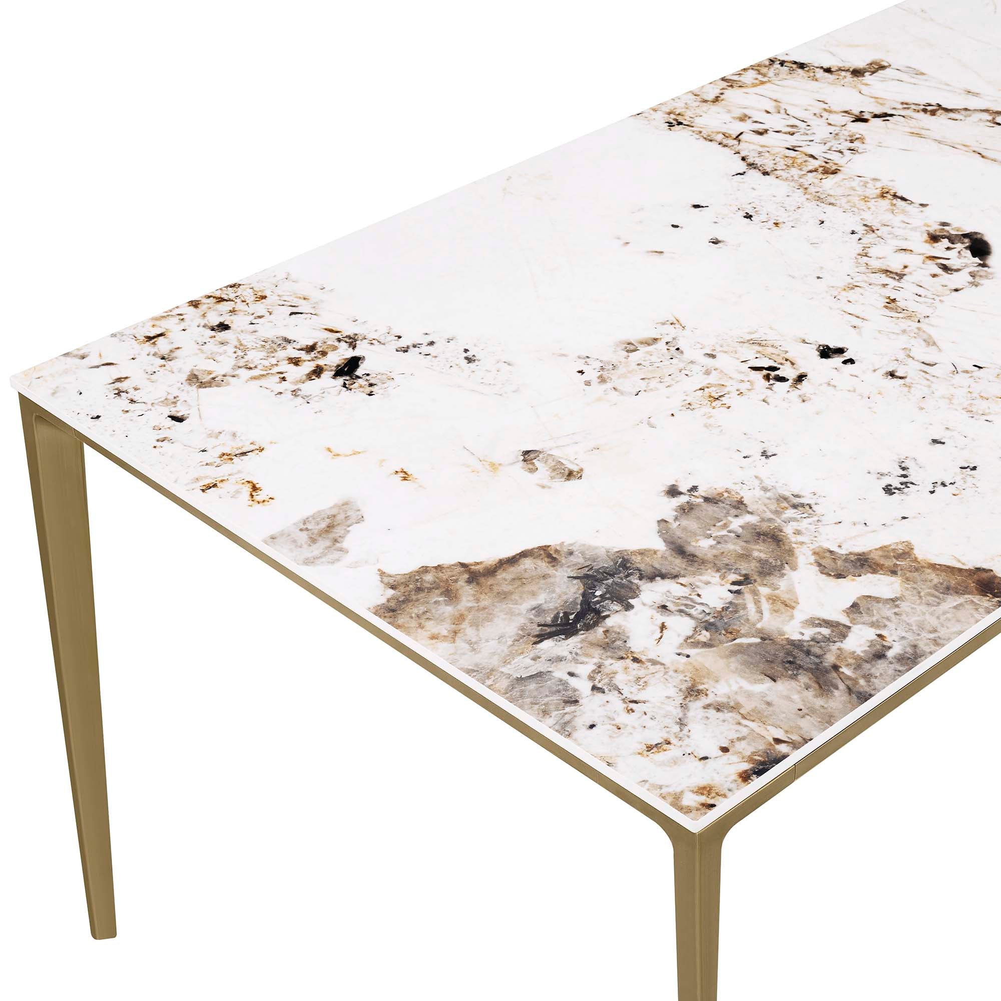 The Teresa dining table that elevates everyday meals. This dining table pairs expressive Pandora stone with bronze aluminum, creating a generous, refined setting for shared meals and sophisticated gatherings.