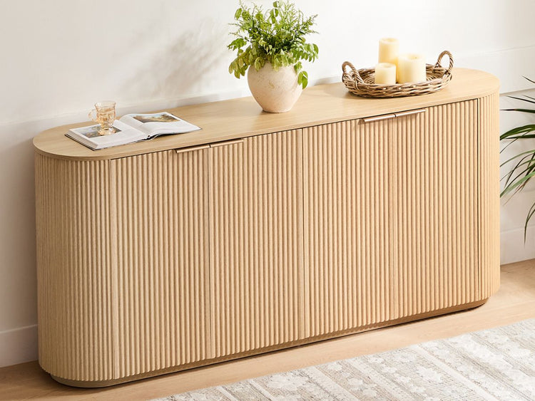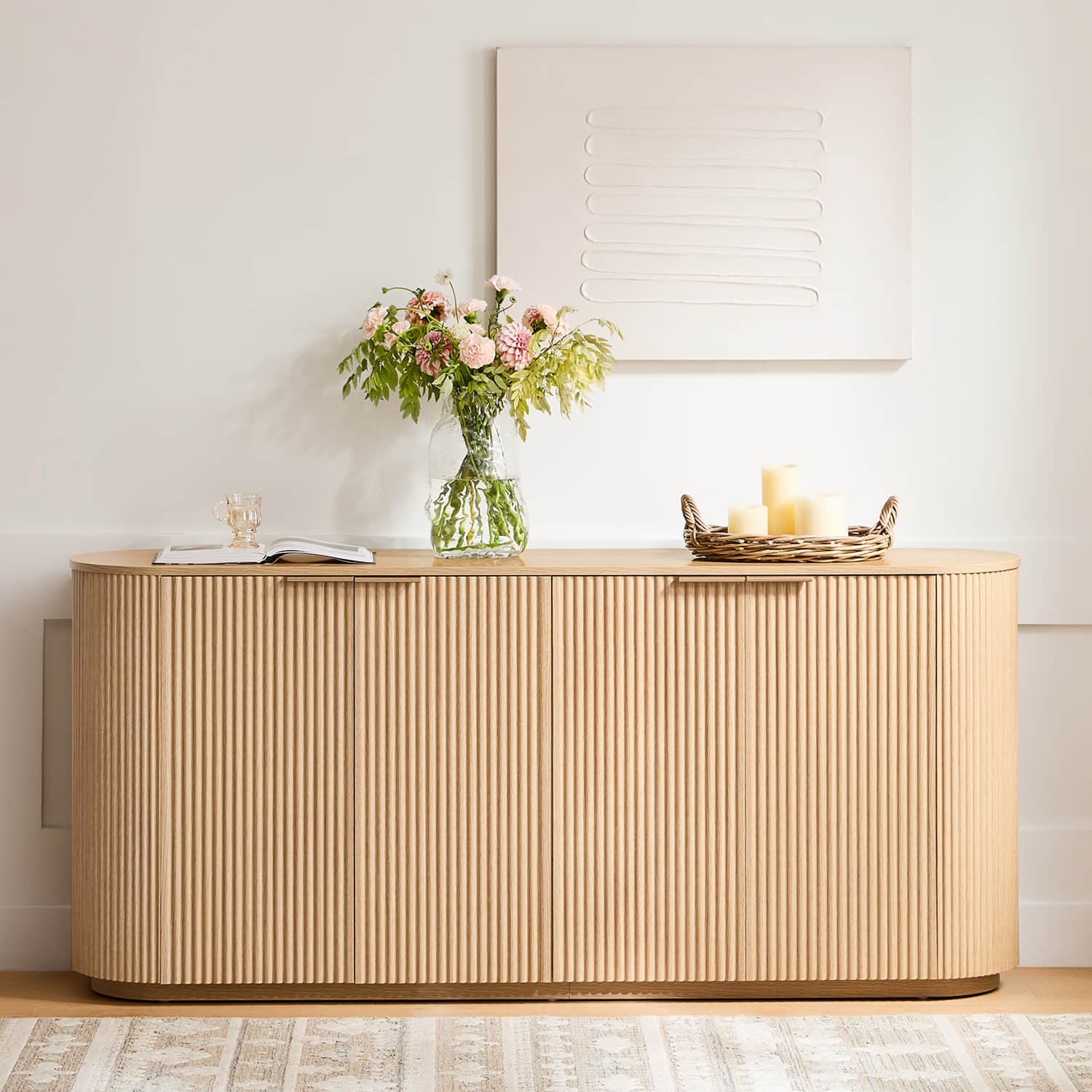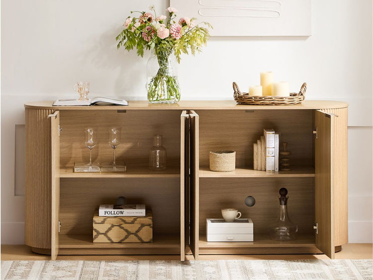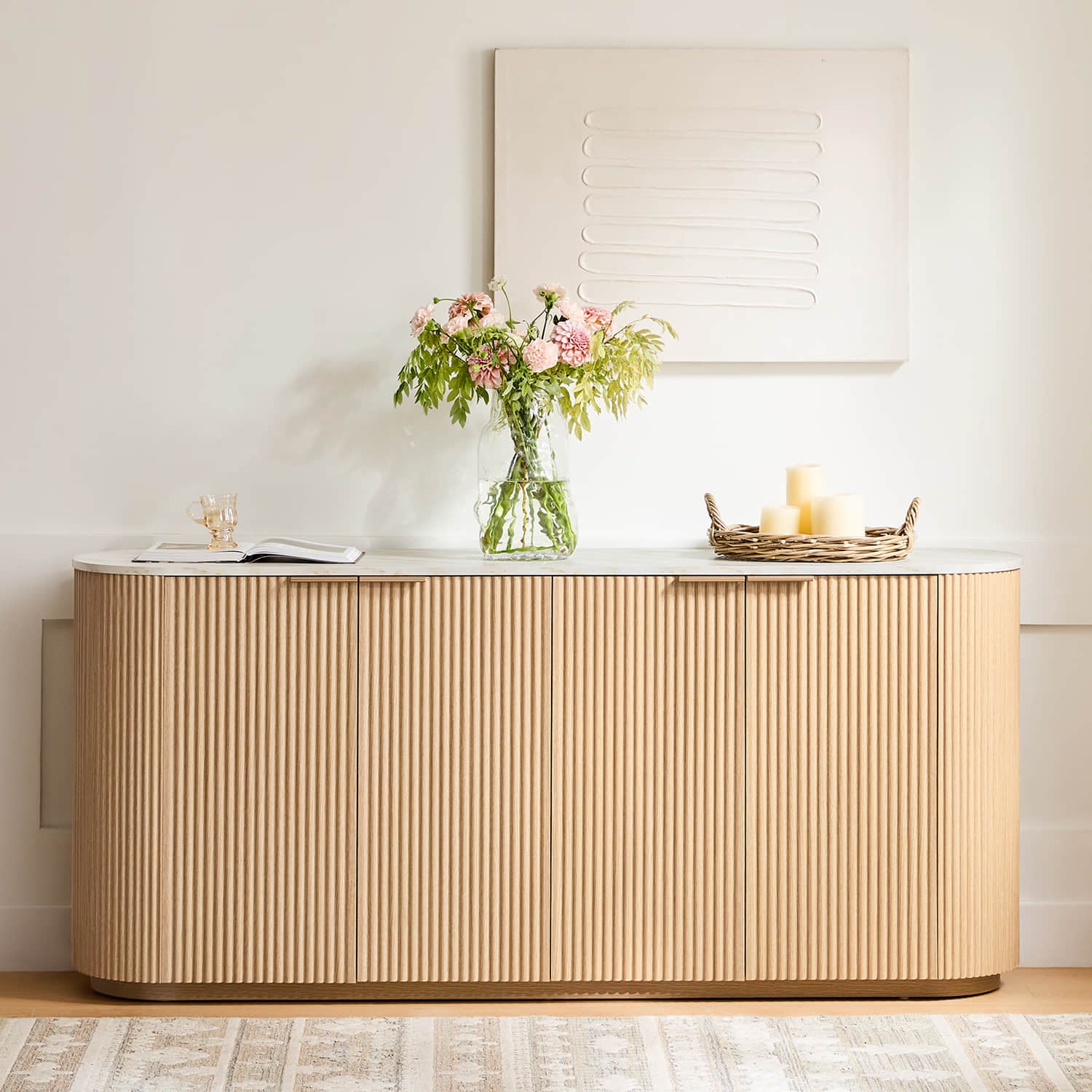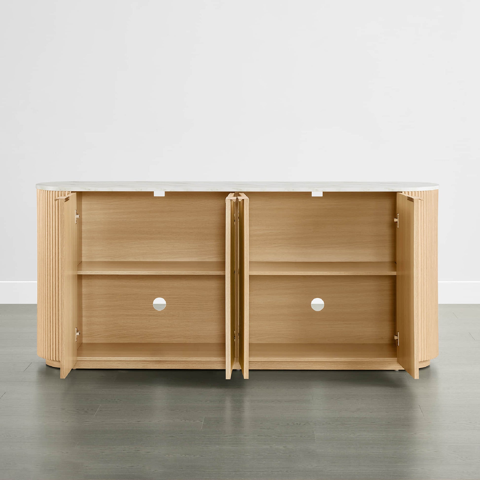 Bring sculptural elegance and everyday utility together with the Bowen Sideboard. Its expansive 70.1" width makes a bold statement while offering generous serving and display space. Choose a faux marble or wood-grain top to suit your style, while semi-cylindrical columns add both strength and grace. Inside, adjustable shelves adapt to dinnerware or décor. Built from eco-friendly panels with a scratch- and moisture-resistant finish, Bowen offers timeless durability and quiet soft-close convenience.