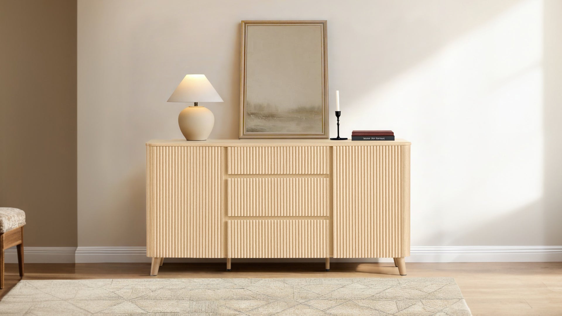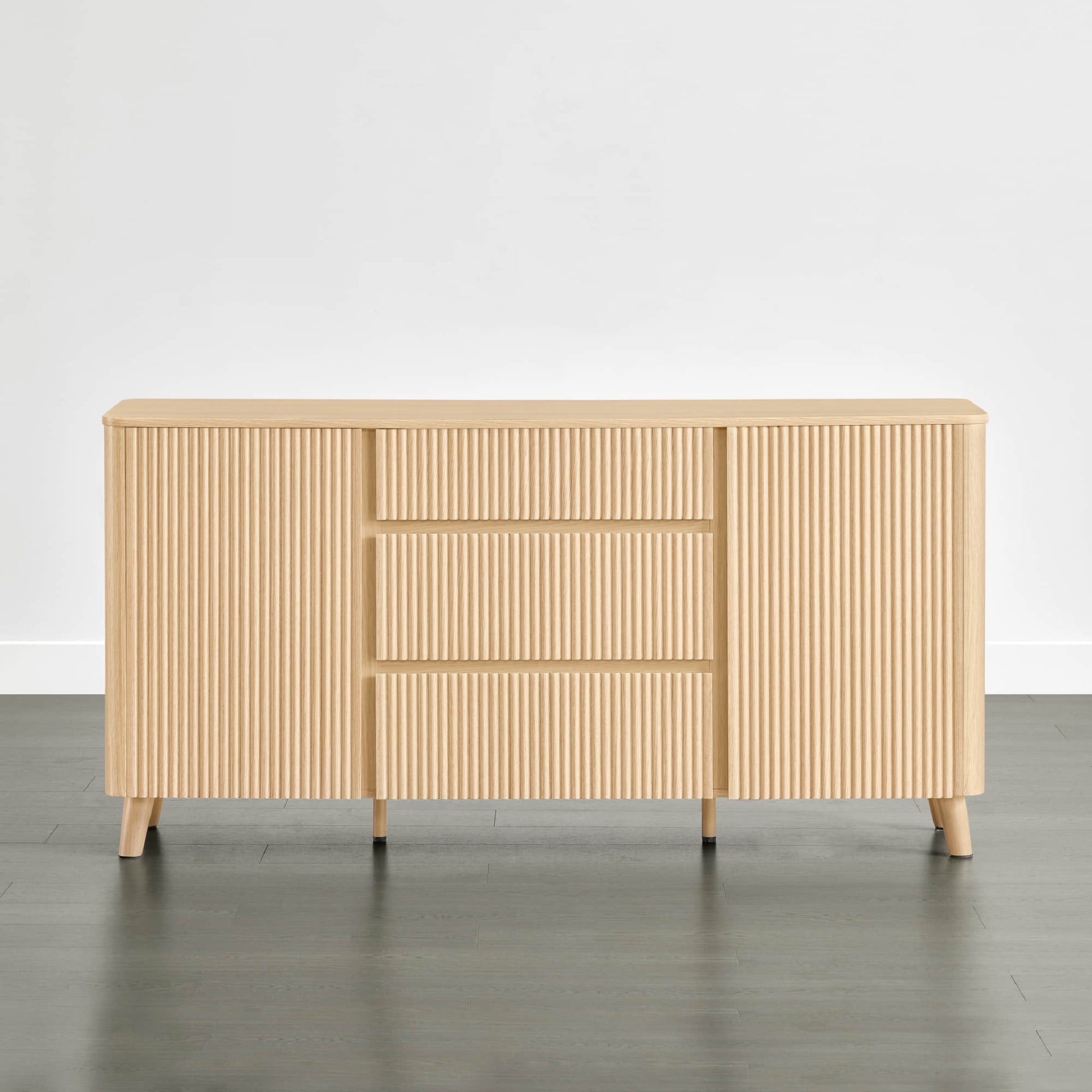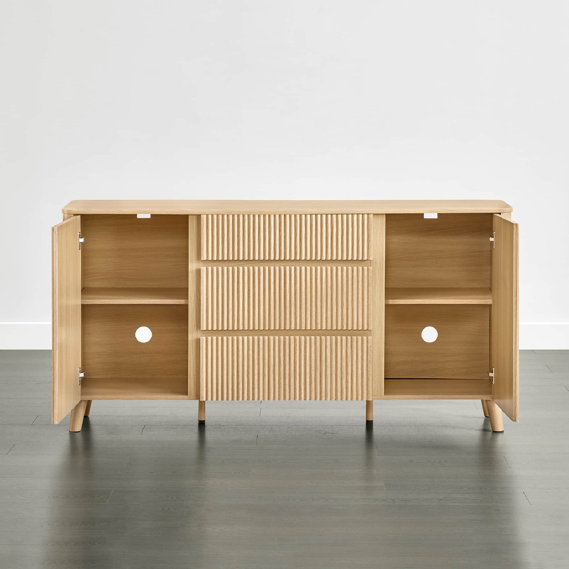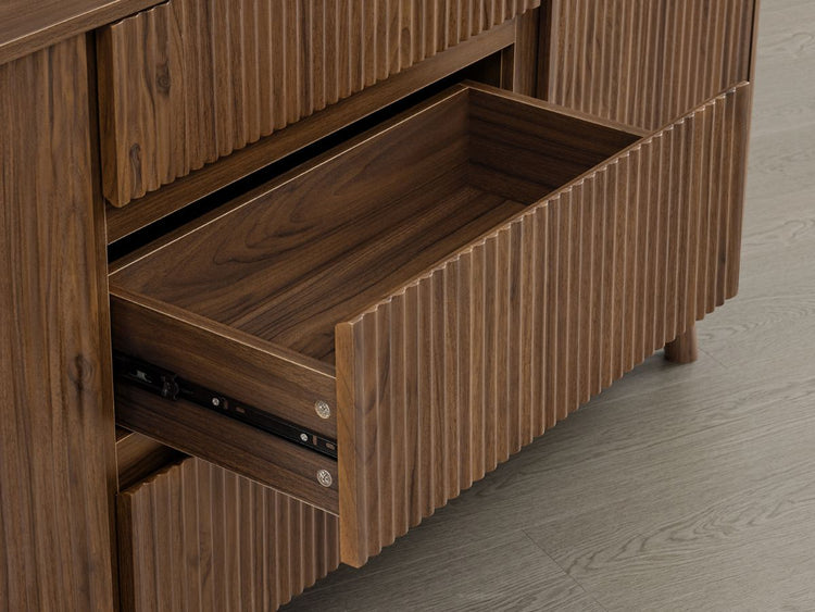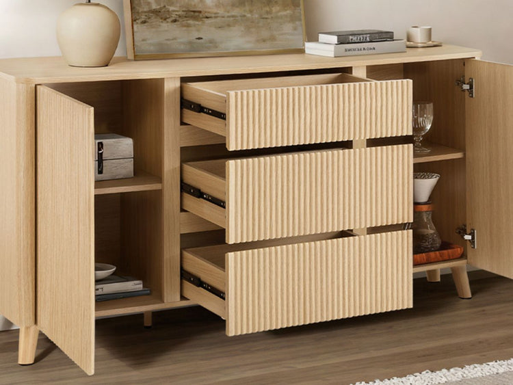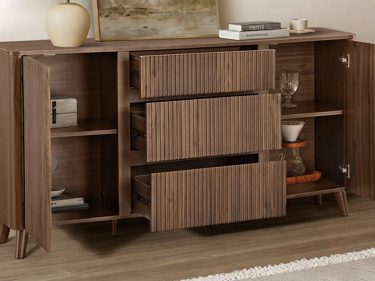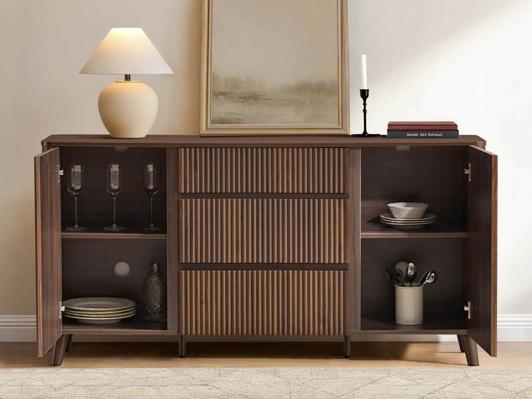 Meet Clara, a 62-inch sideboard that blends sculptural design with everyday function. Its fluted panel doors and rounded edges bring modern elegance and family-friendly safety into your dining space. Deep and shallow drawers pair with adjustable shelves to keep serveware, linens, or décor neatly organized. A scratch- and water-resistant finish ensures durability through every spill, while hidden cable ports and silent-close hinges deliver practical ease. Clara grounds your home with strength, style, and effortless upkeep.