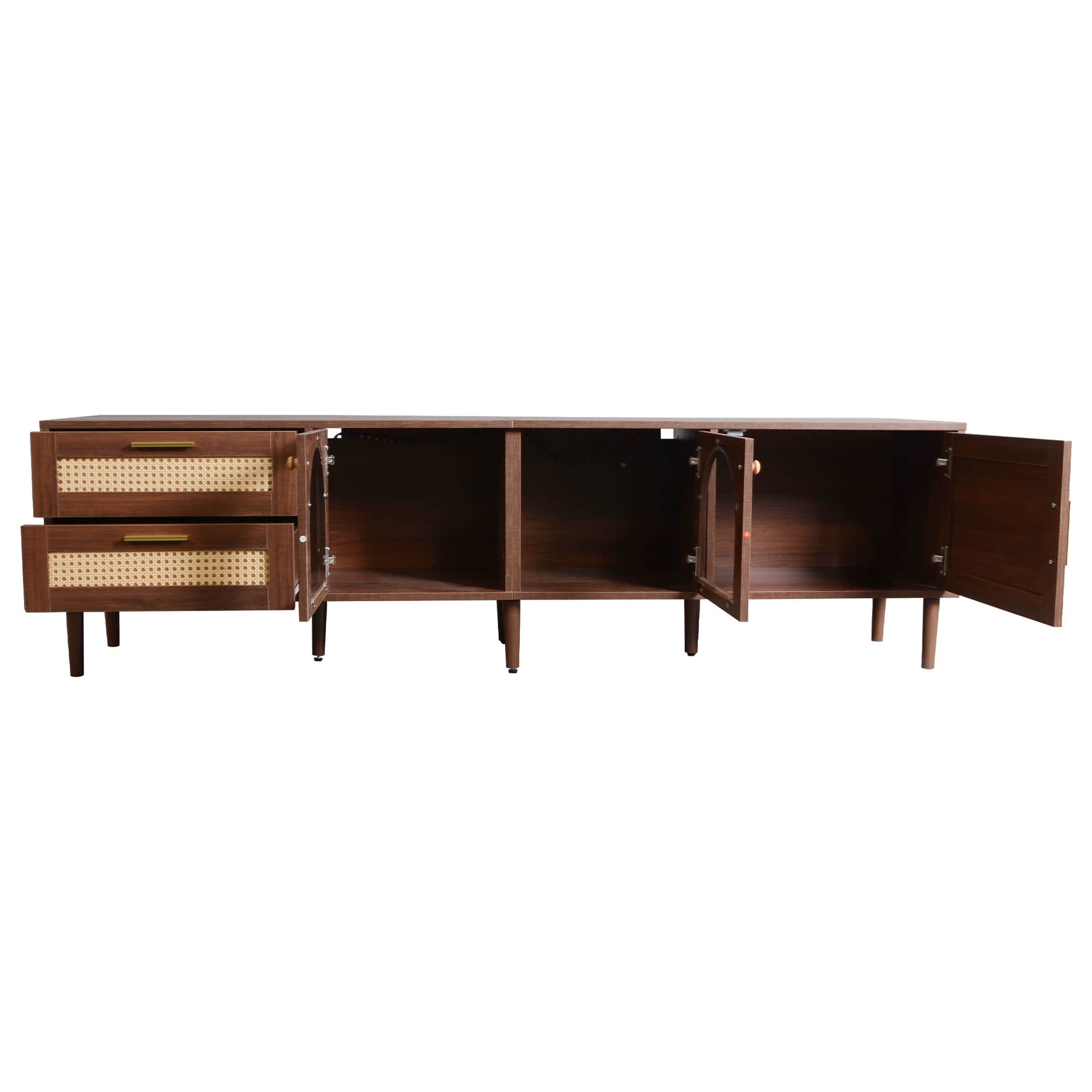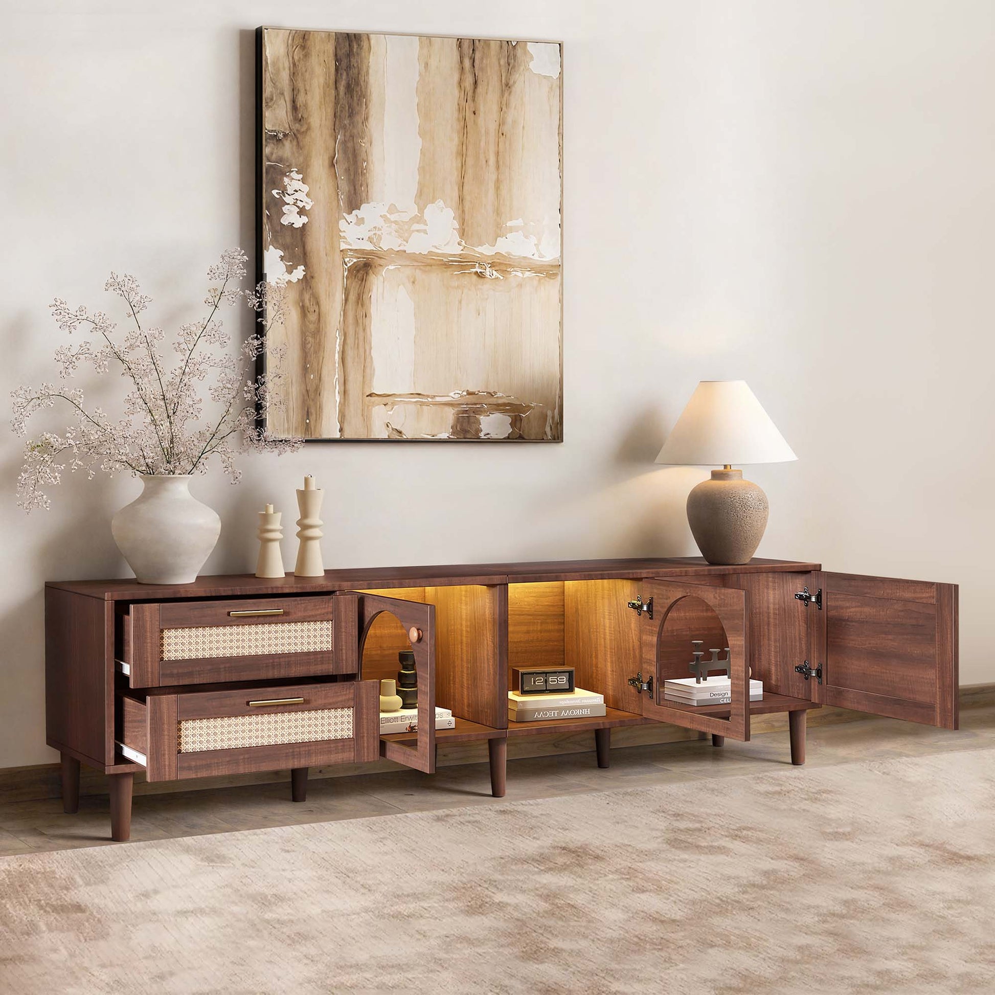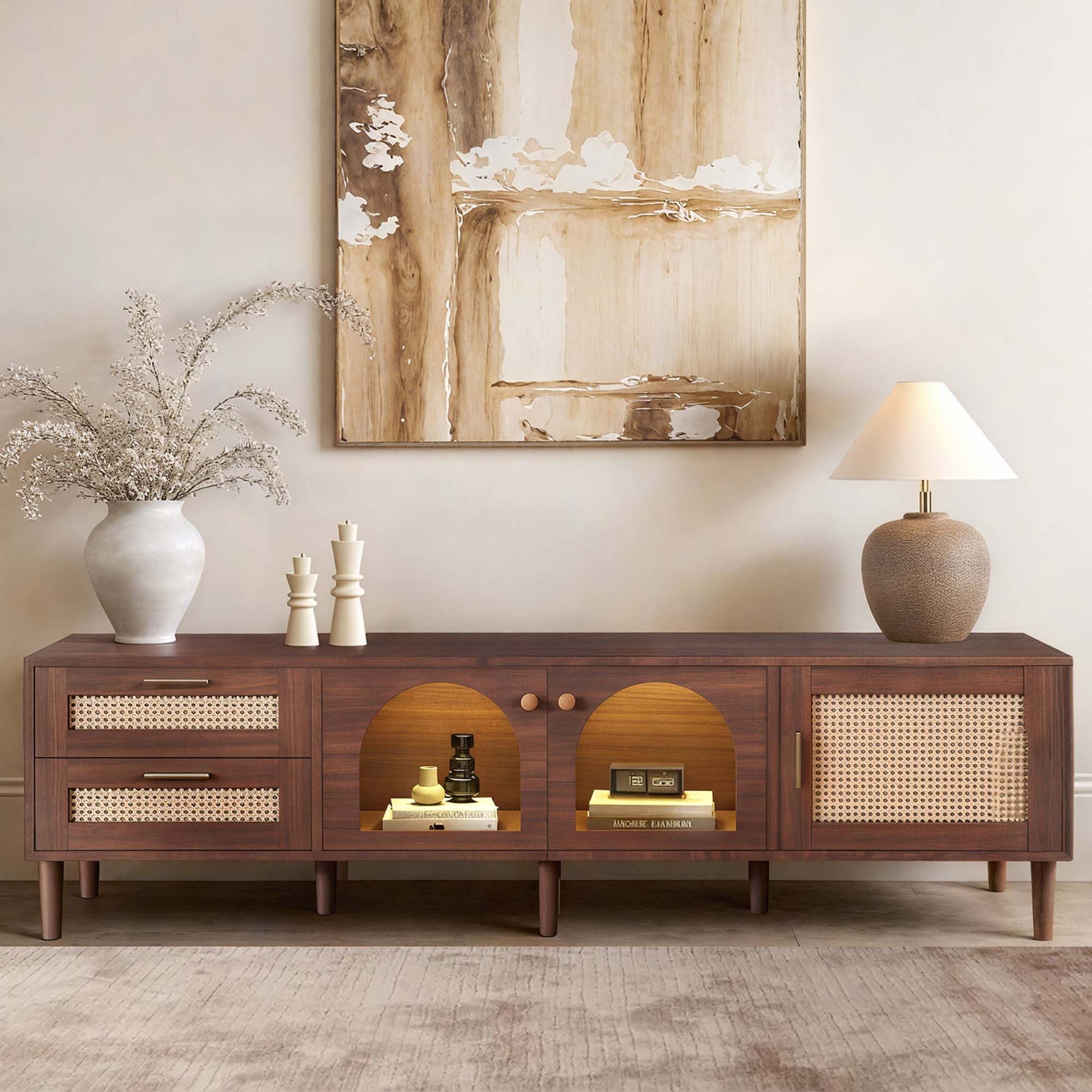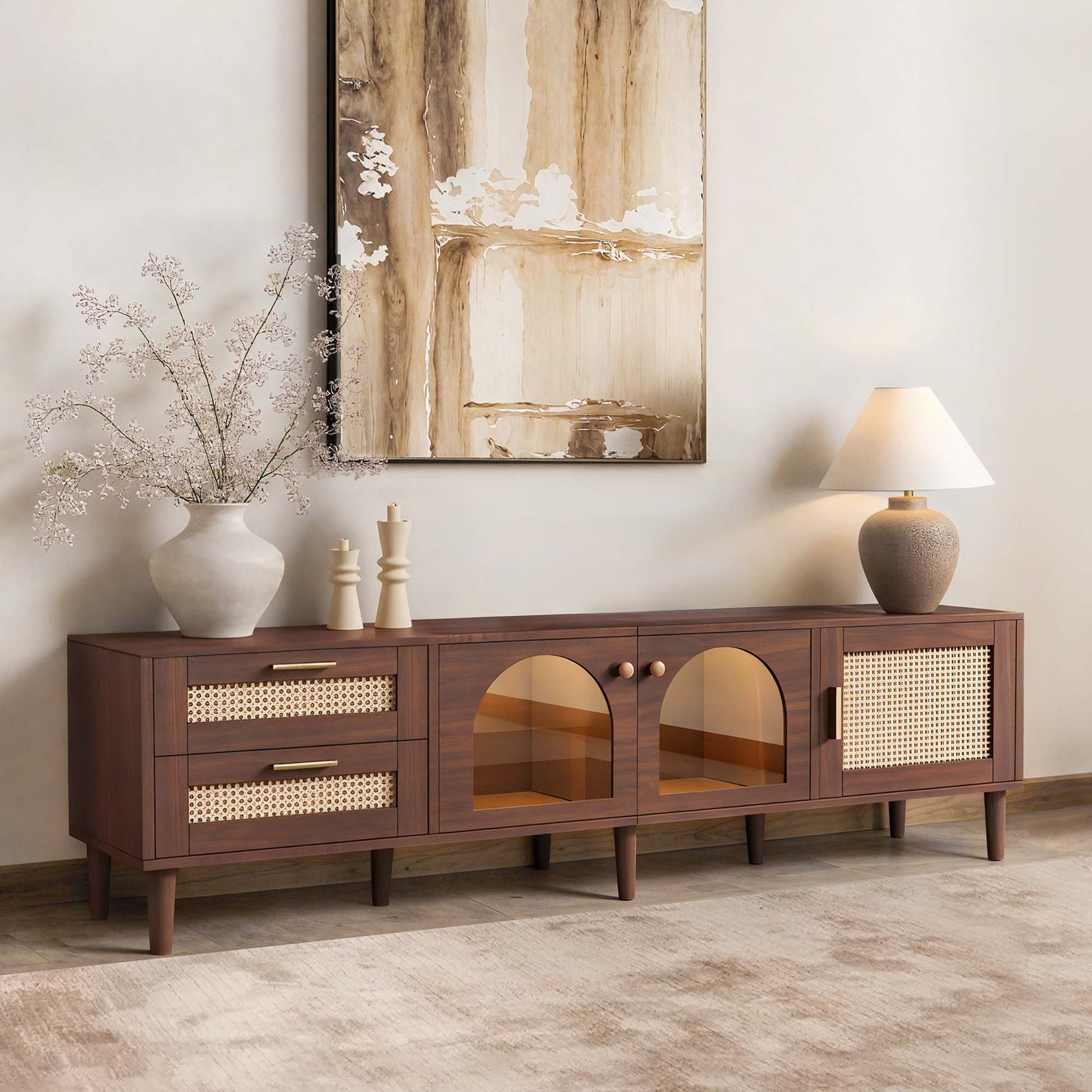 Bring modern elegance and cozy ambiance to your living space with the Rowan Rattan TV Stand. Designed to accommodate TVs up to 80'', this 70'' media console blends clean lines with natural textures for a warm, elevated look.
