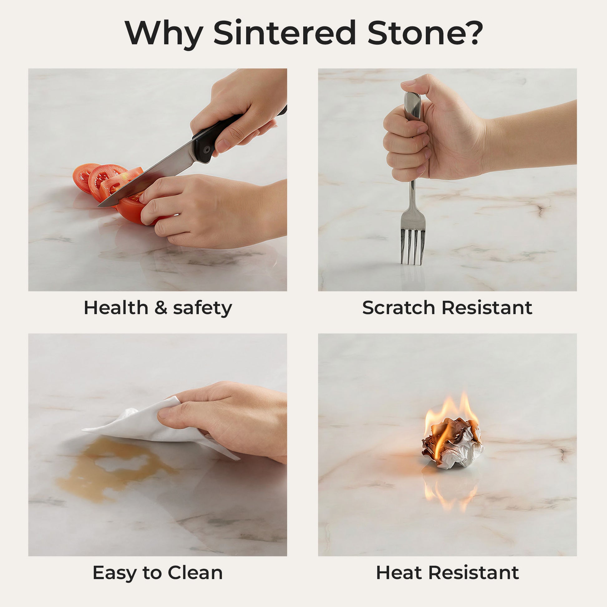 6mm Sintered Stone Top: Premium 6mm sintered stone delivers superior resistance to heat, scratches, and stains, with a smooth, non-porous surface that prevents food absorption.