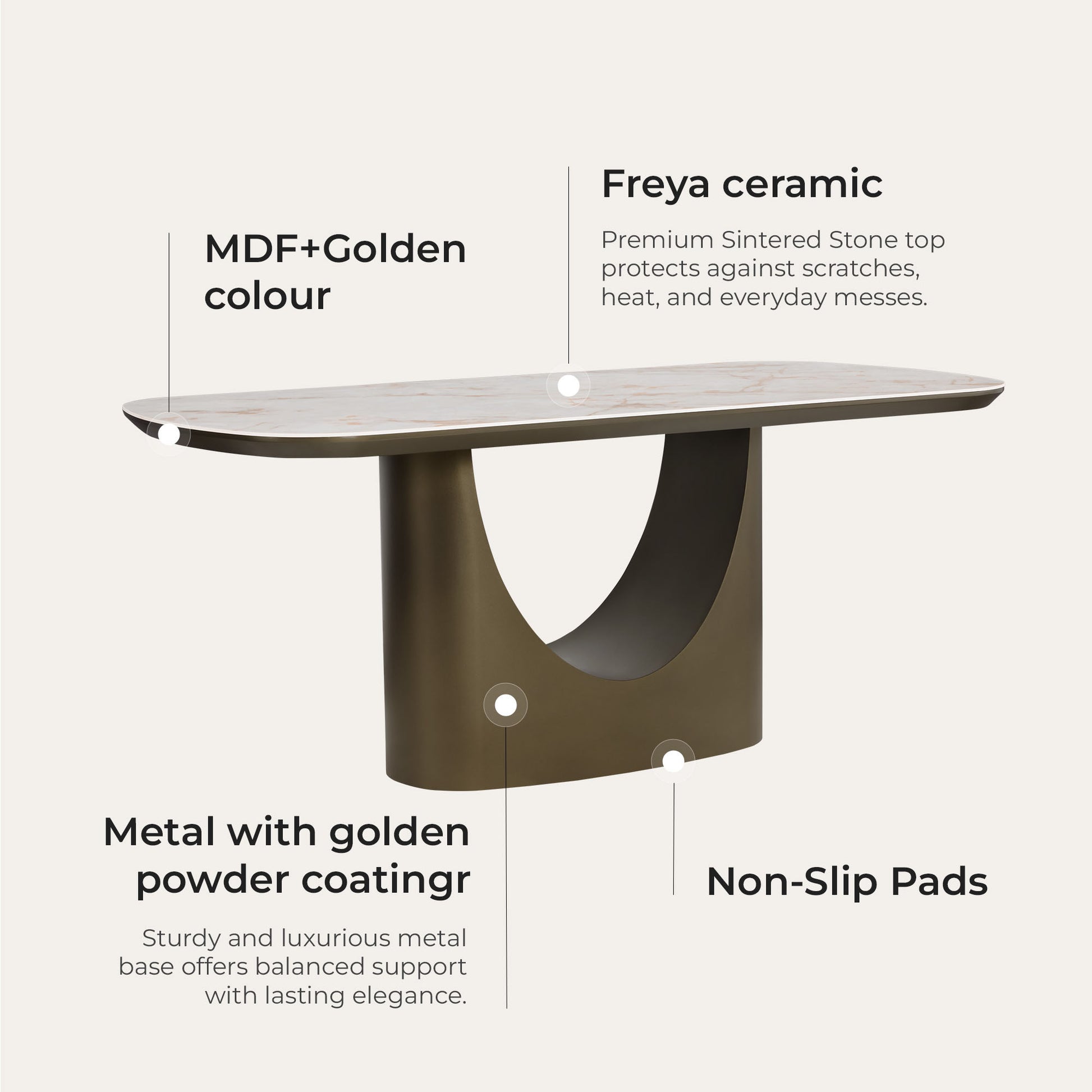 A thickened sintered stone top resists scratches, heat, and spills, staying easy to clean, while the bronze-finished metal base provides lasting strength and stability for daily family dining.