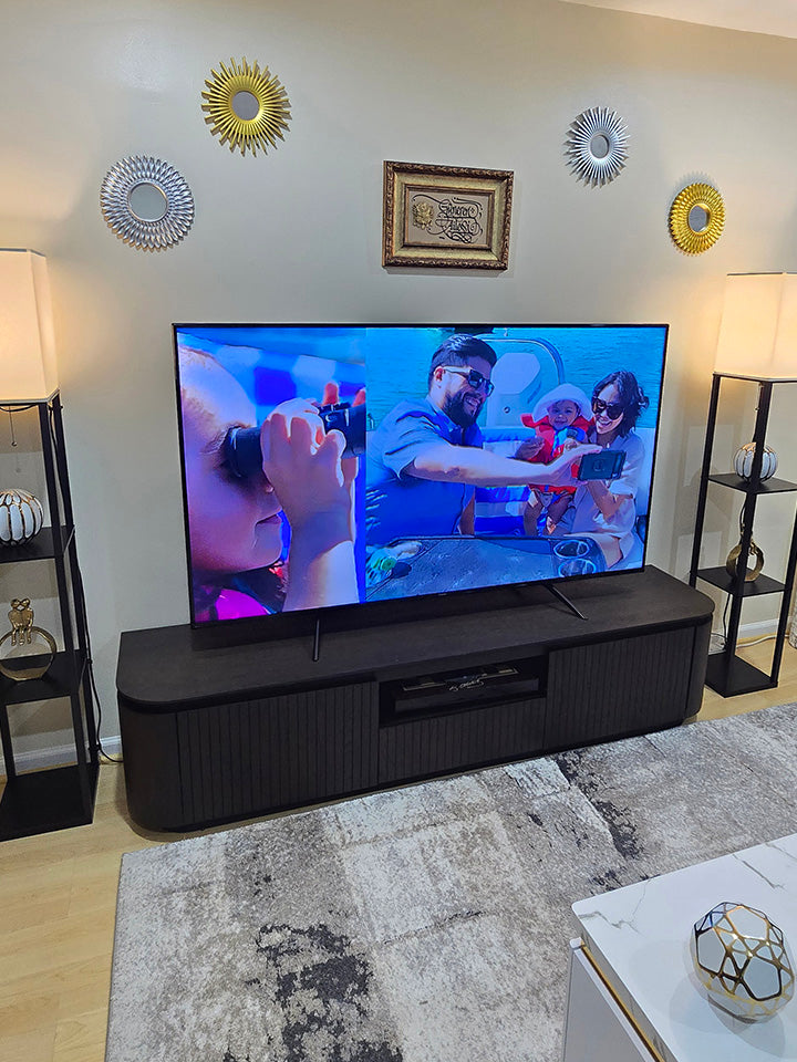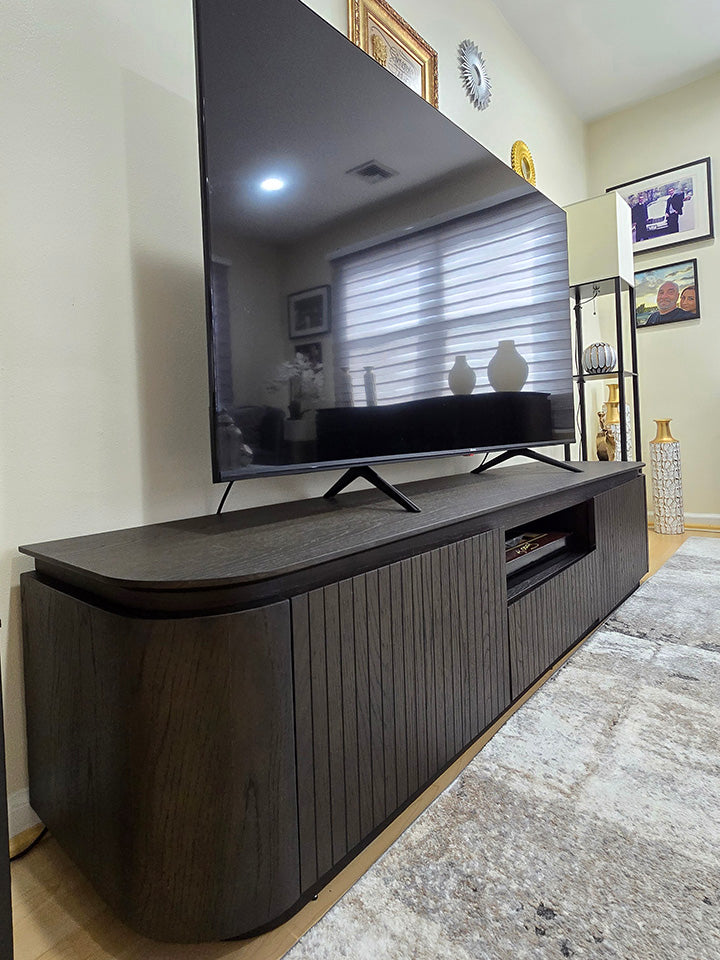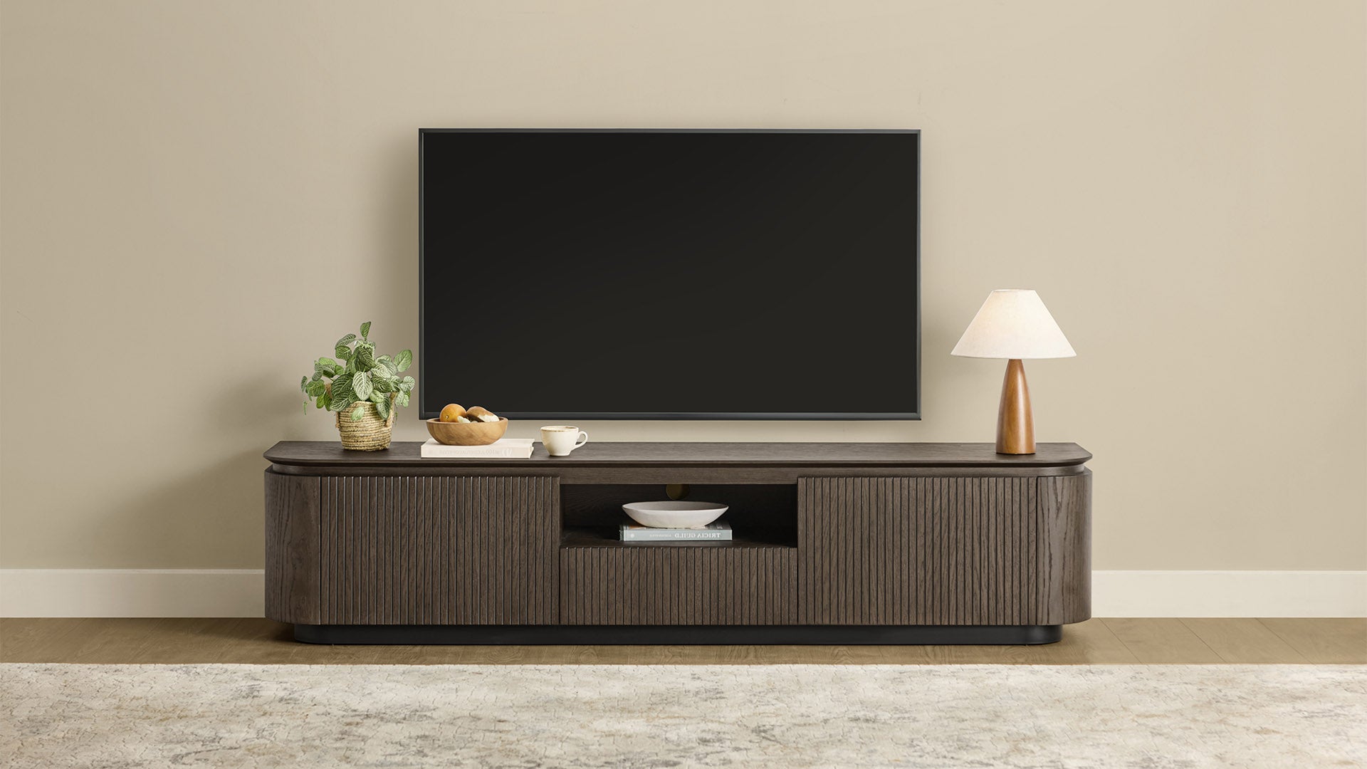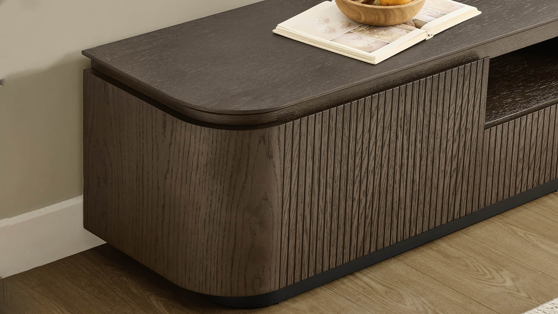 Sleek and grounded, the Moore TV Stand blends modern minimalism with mid-century warmth. Its dark brown oak-veneered body rests on a matte-black metal base, creating a balanced sense of strength and lightness. The signature reeded front catches light in quiet rhythm, while rounded edges soften its silhouette. A timeless centerpiece that brings refined harmony to contemporary living spaces.