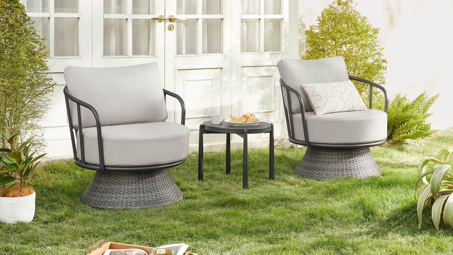 Settle into effortless outdoor moments with the Ellie Outdoor Set, designed for style and comfort. Each swivel chair features plush, reversible cushions atop a durable powder-coated steel and weathered charcoal wicker base, while the coordinating side table completes the look. Built to withstand sun, rain, and everyday use, this modern coastal bistro set balances relaxed comfort with long-lasting durability, making your patio, balcony, or poolside a welcoming retreat.