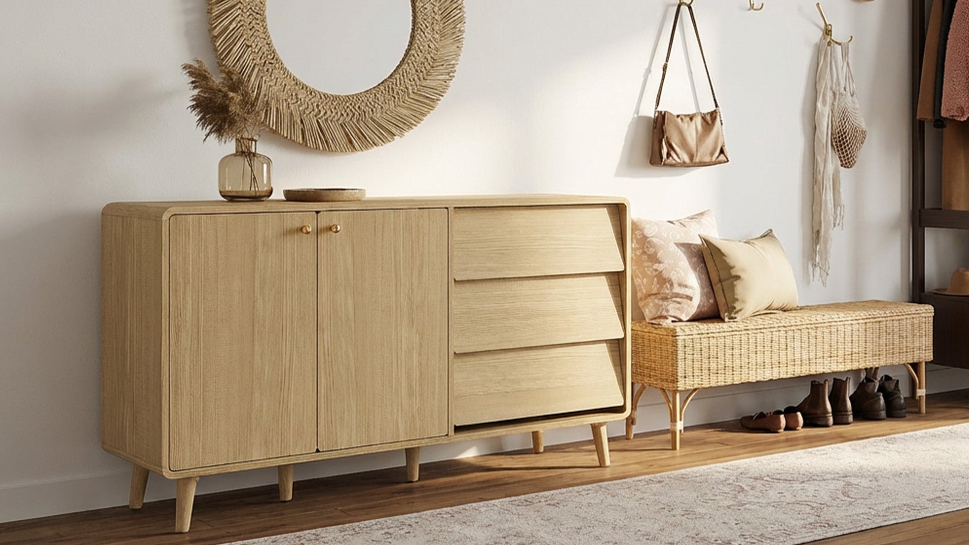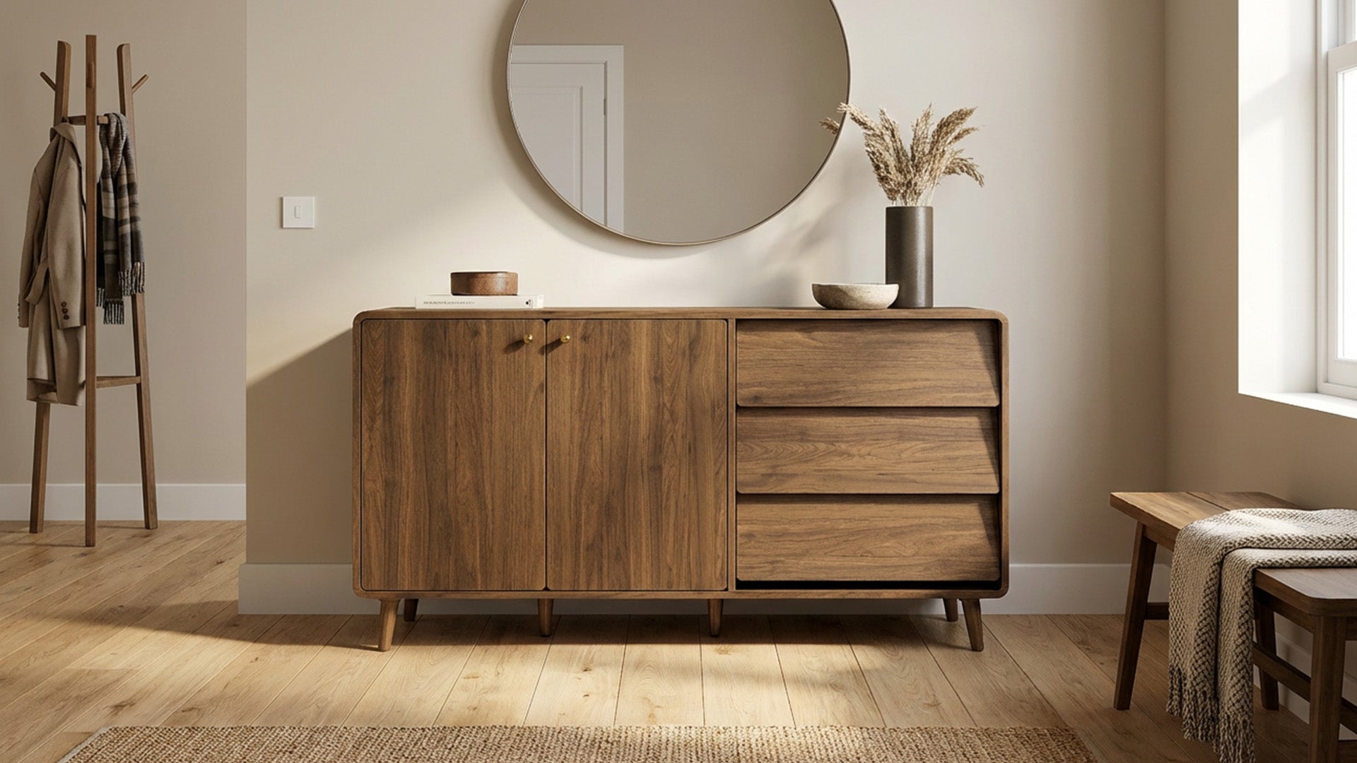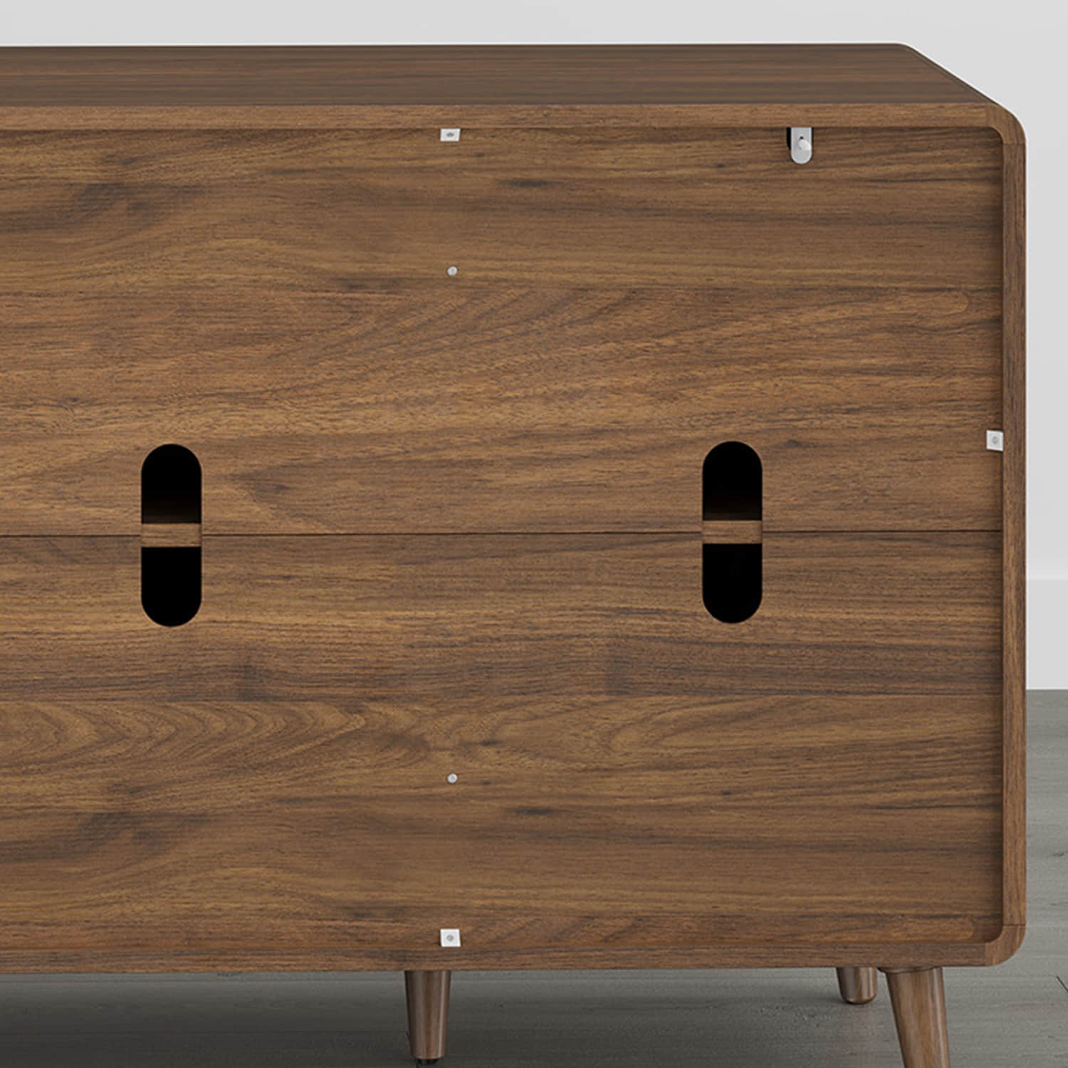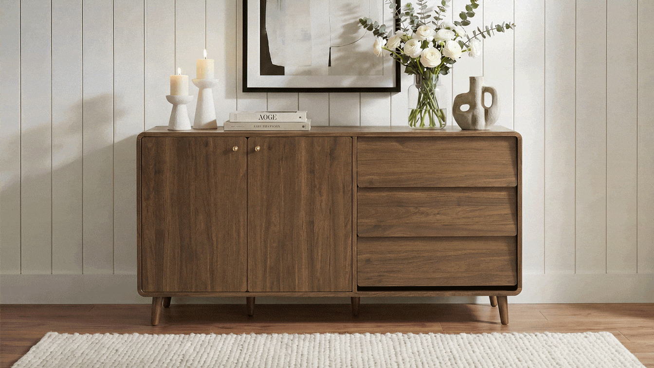 Bring effortless organization and mid-century charm to your home with the Hudson Mid-Century Storage. Its 58" arc-shaped design features rounded corners and a mix of doors and drawers, offering versatile storage while keeping daily essentials neatly tucked away. Crafted with durable engineered wood, solid wood legs, and quiet soft-close hinges, this piece combines timeless style, practical functionality, and thoughtful design for a clutter-free, welcoming space.