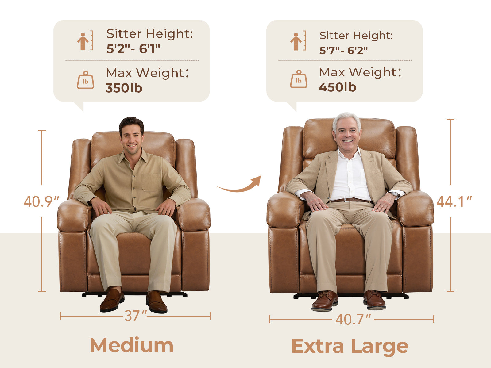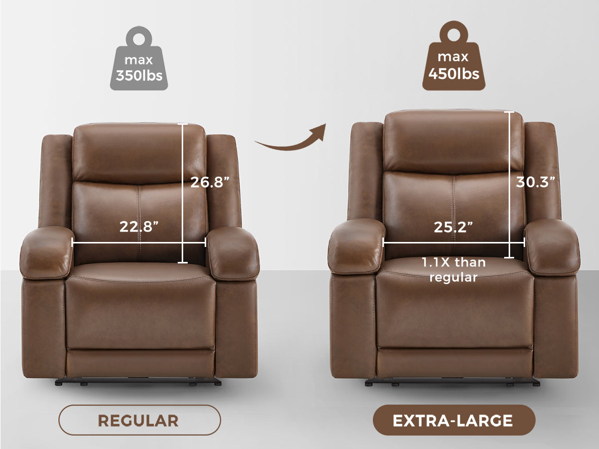 Isaac recliner now comes in two sizes designed for true comfort. For those who like more space, the new extra large version offers a wider 25.2" seat and supports up to 450 lbs. Both deliver the same dual-motor reclining, power headrest, and premium leather—crafted to give every body the perfect fit.
