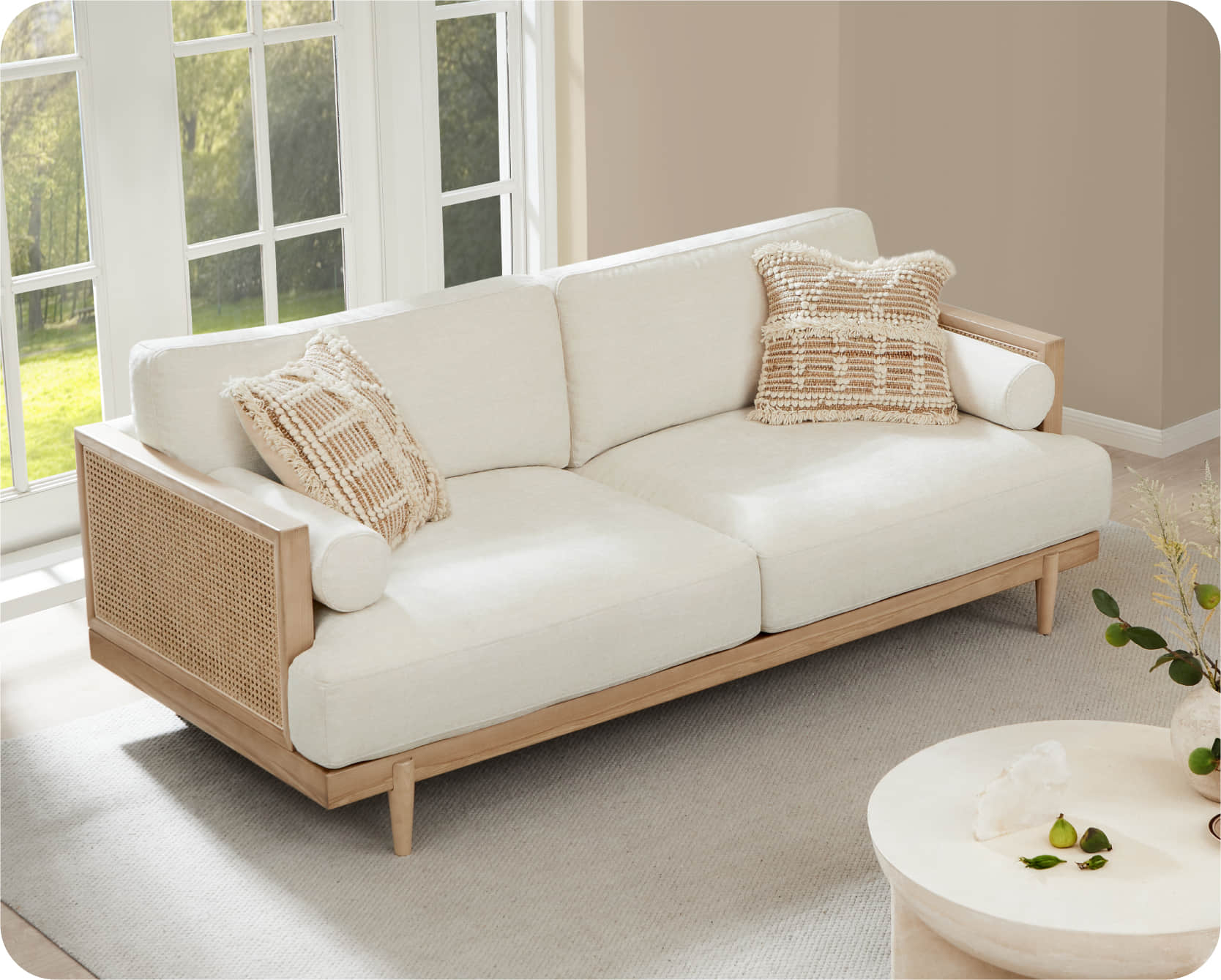The Julane Modern Cane Sofa is a thoughtfully designed statement piece, crafted with solid ash wood trims, woven rattan panels, and a soft linen fabric that adds a touch of organic flair and warmth to any living room. Its clean silhouette, marked by straight lines from the wood, is balanced elegantly by the cylindrical arm pillows and plush cushions.