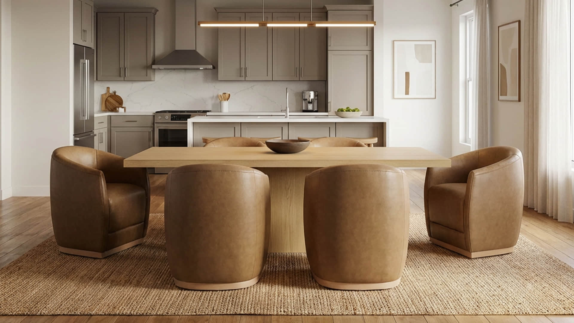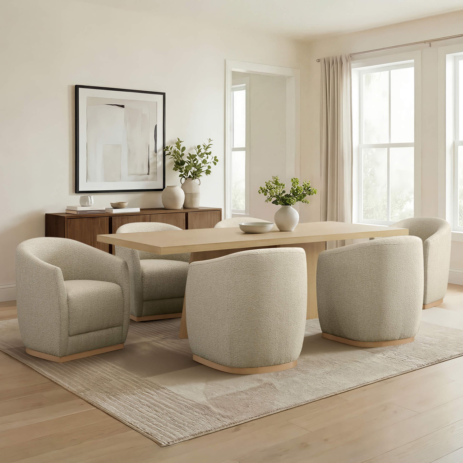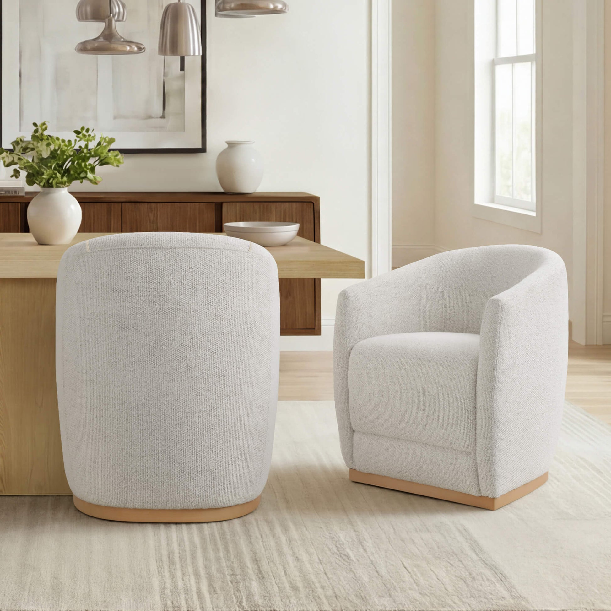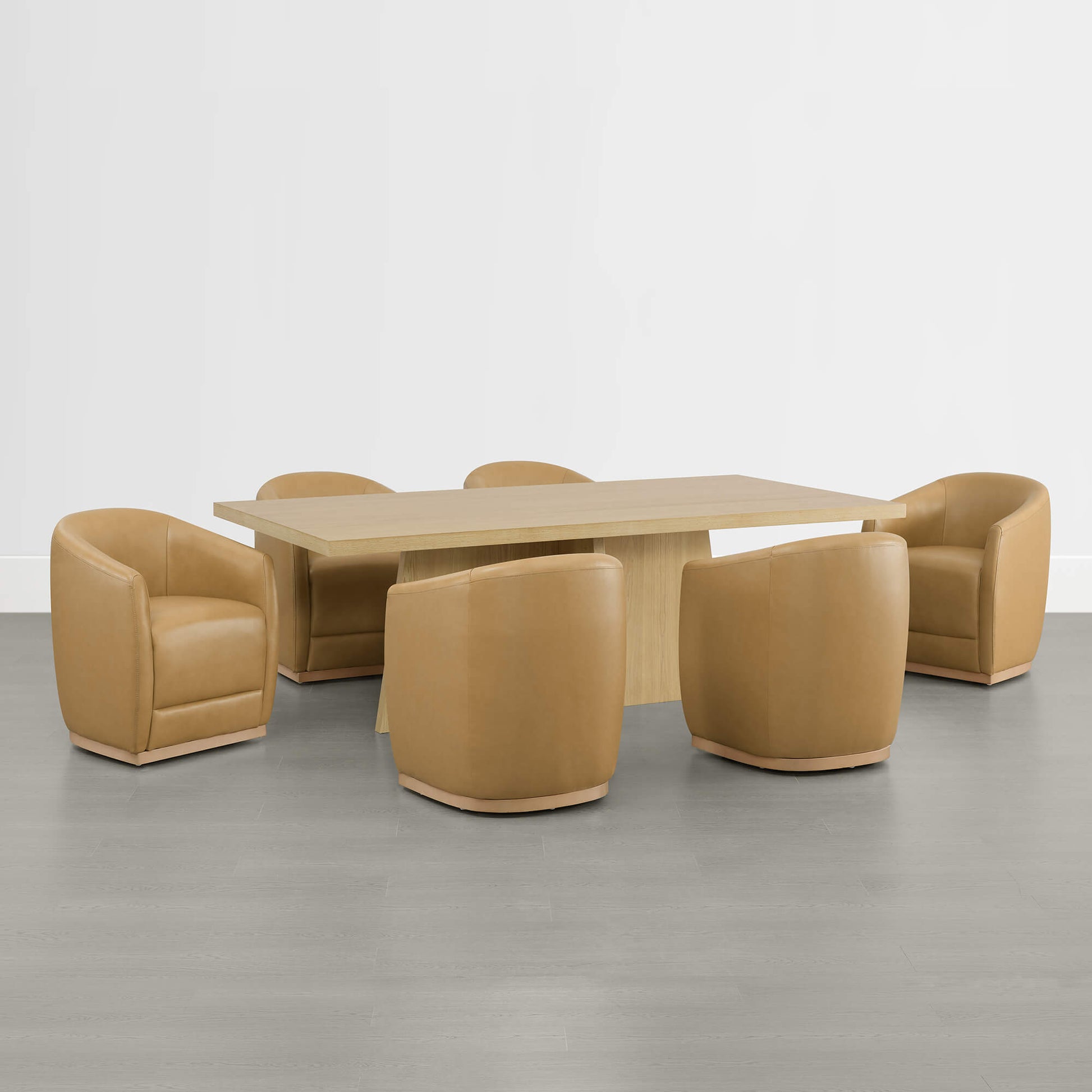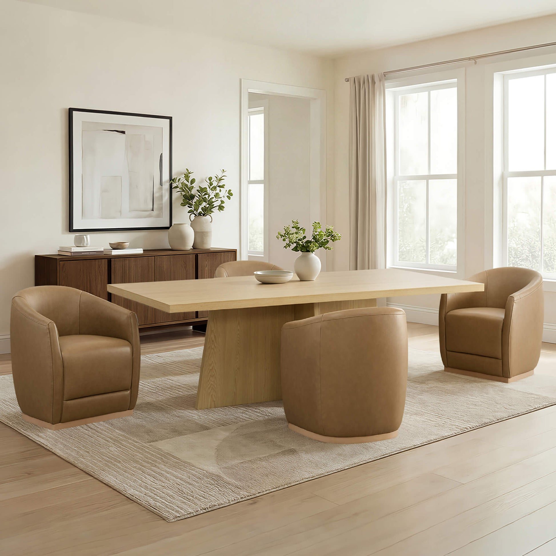 The Mateo dining chair brings movement and comfort to everyday moments. Its sculpted barrel silhouette wraps you in balanced support, while smooth 360° casters glide effortlessly from dining table to desk. Built with kiln-dried hardwood and high-resilient foam, it offers lasting durability with a medium comfort feel. Designed for modern homes that value flexibility, craftsmanship, and thoughtful detail.