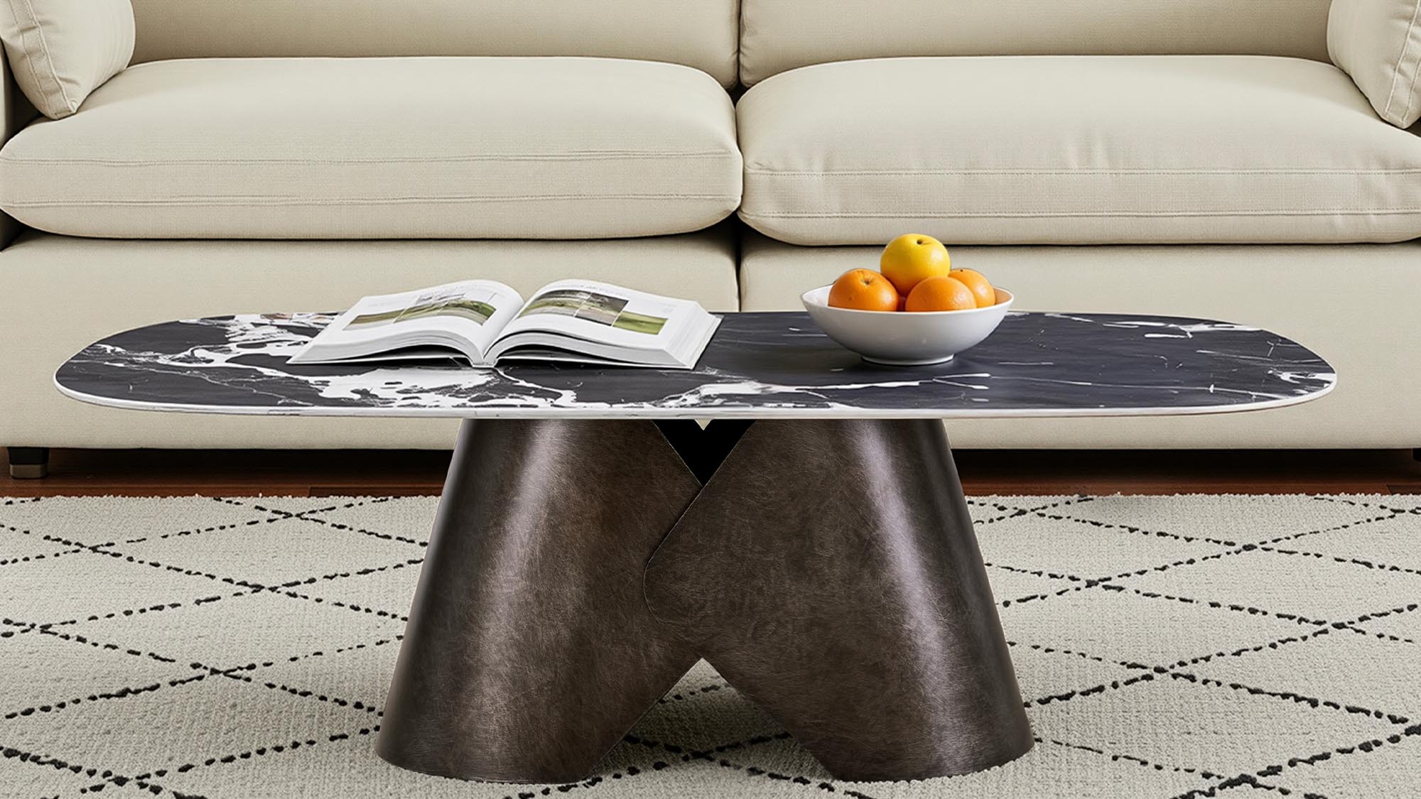 The Natalie coffee table embodies modern light luxury with an elegant oval silhouette. Its Napoleon ceramic tabletop features striking black-and-white marble veining, enhanced by fluid curves and softly rounded edges, meticulously crafted for a refined, sculptural presence. The central base is formed from multi-curved metal tubing, finished in a black textured coating that introduces bold industrial character. This dramatic contrast between strength and softness creates a distinctive visual centerpiece, elevating the living space with a forward-looking, artistic statement.