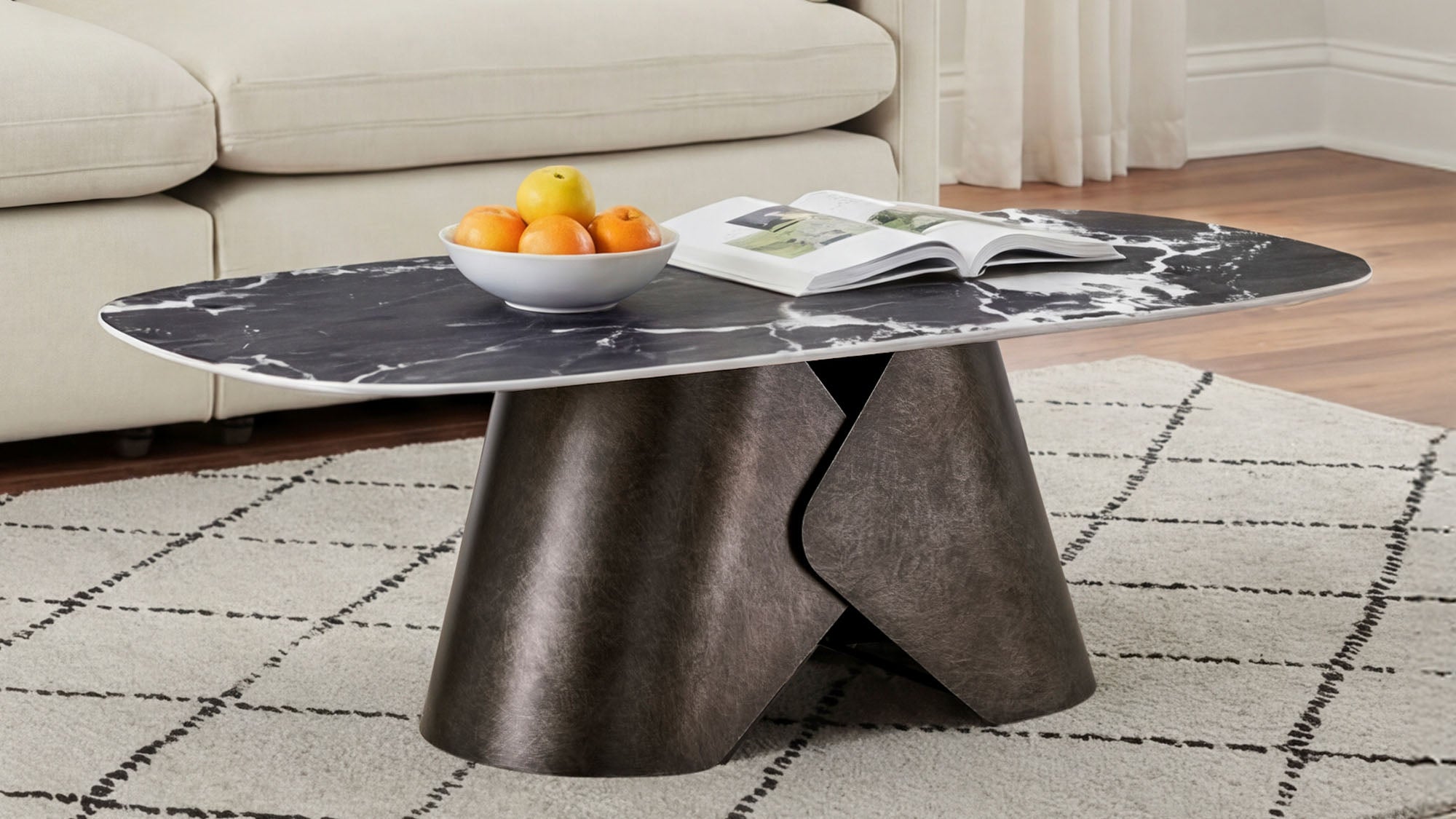 • Natalie black ceramic coffee table: oval Napoleon ceramic top with dramatic white marble veining, textured black metal base.