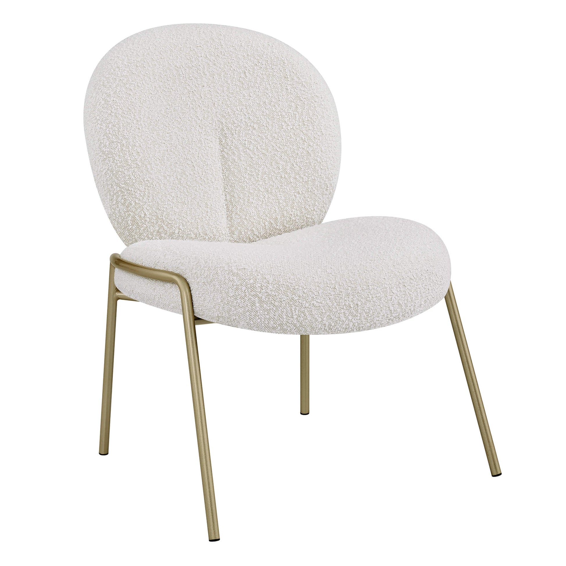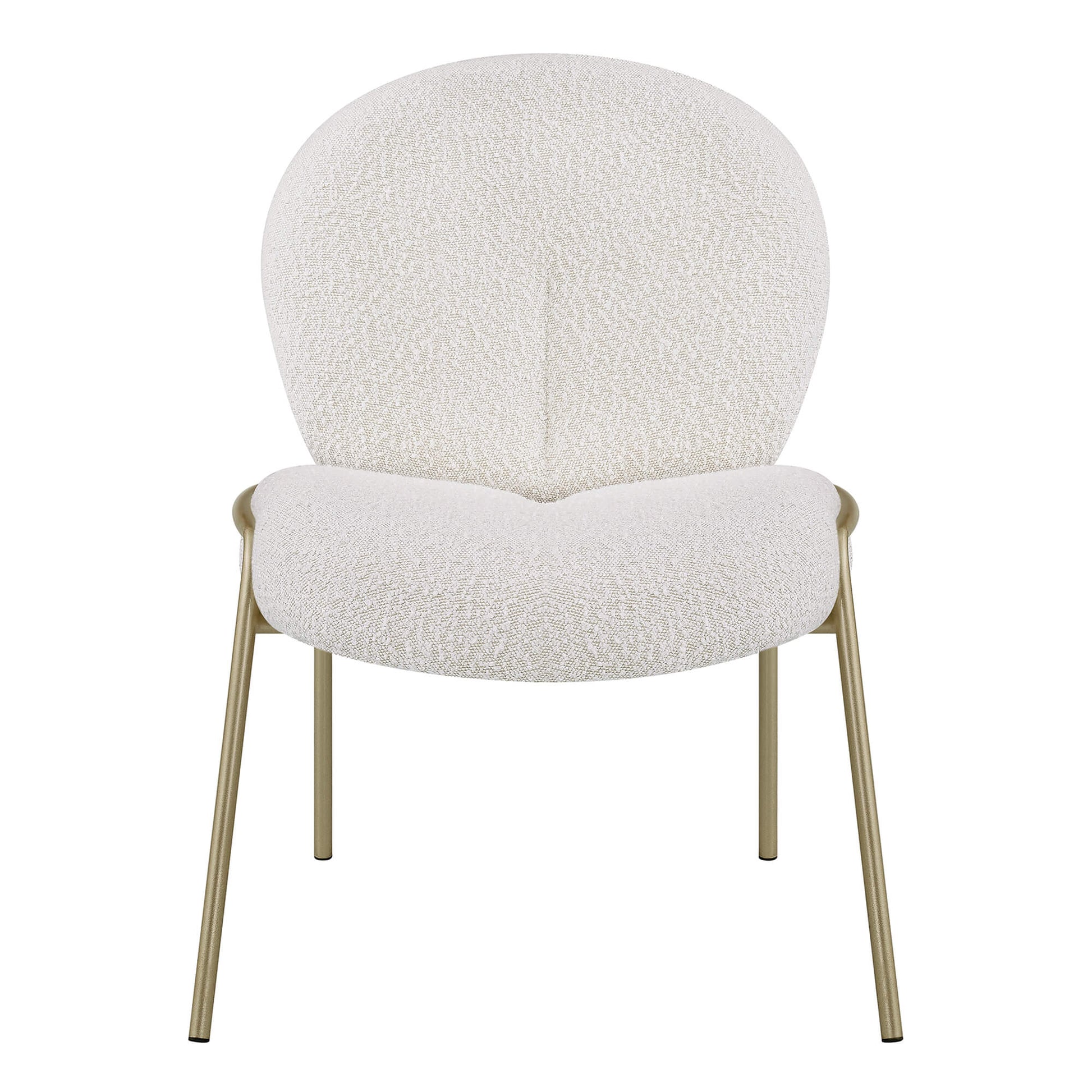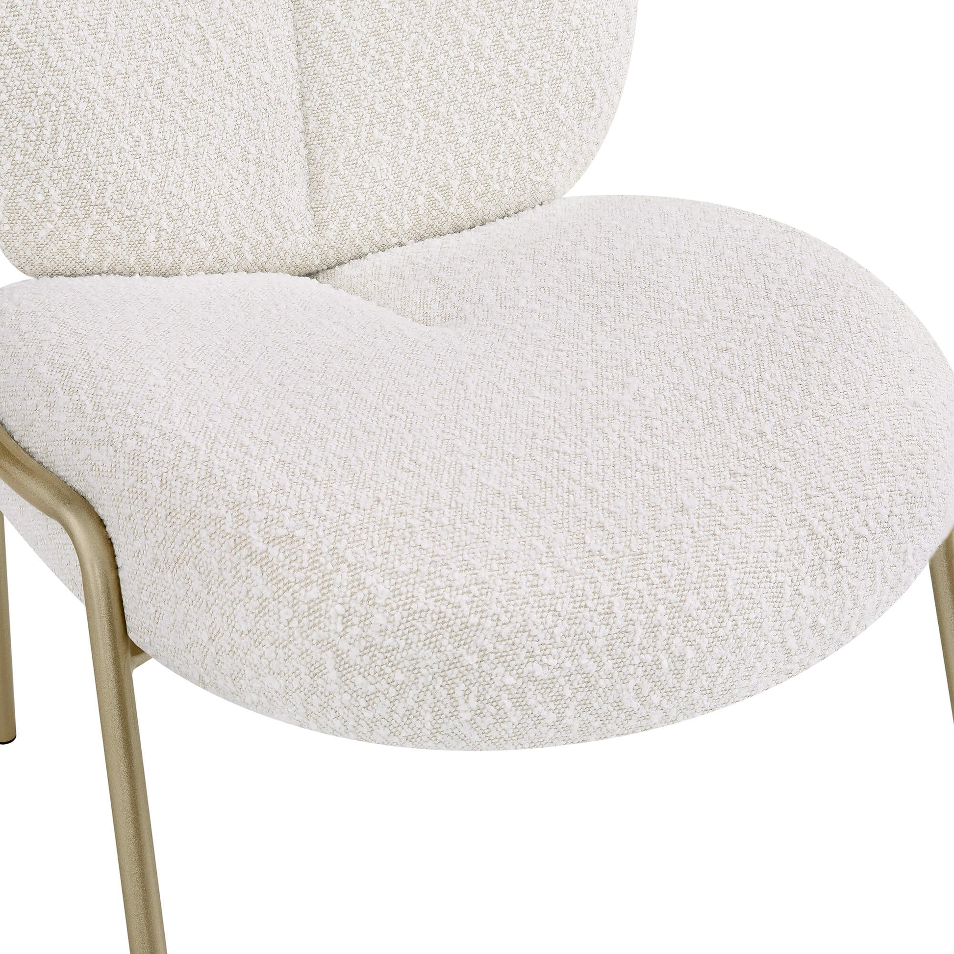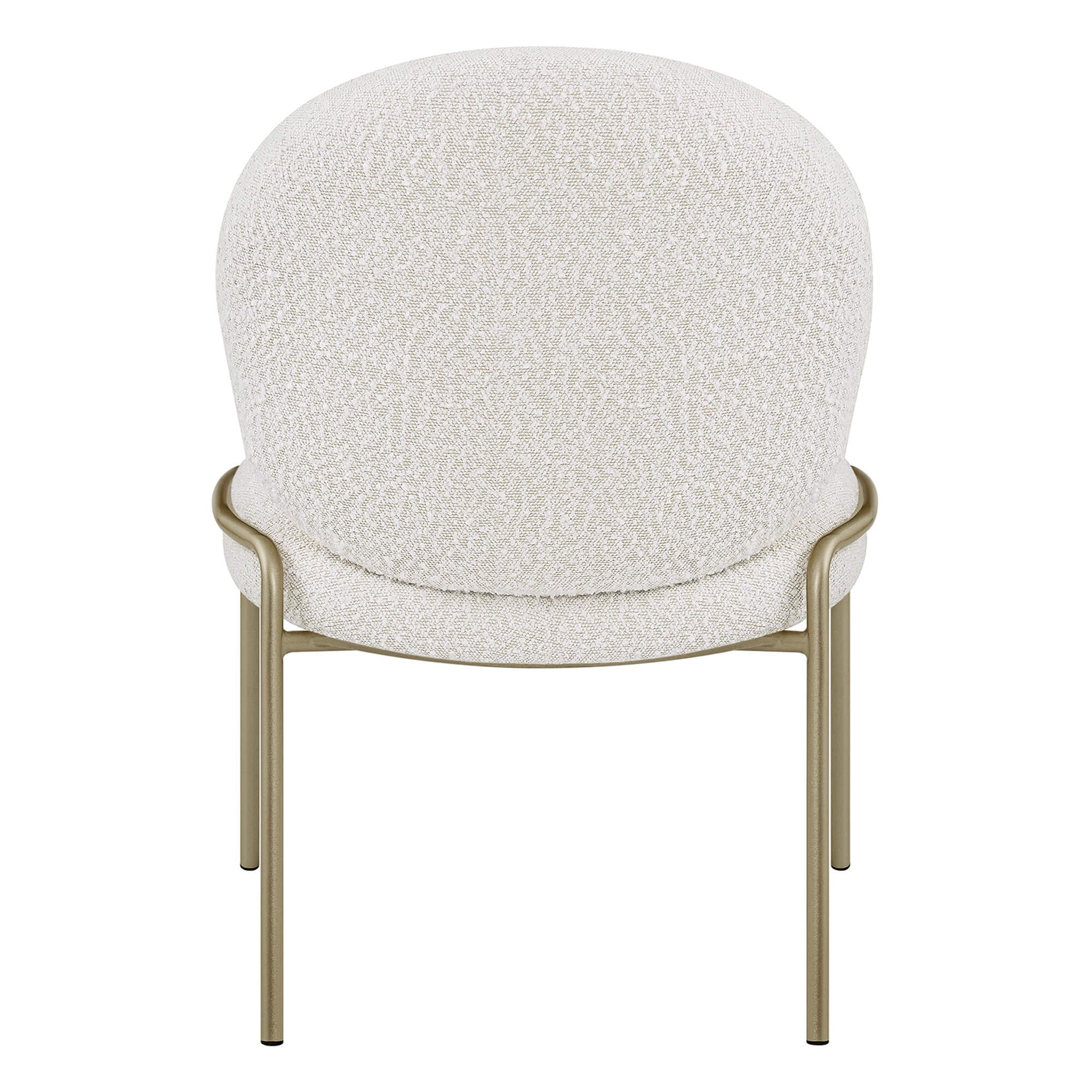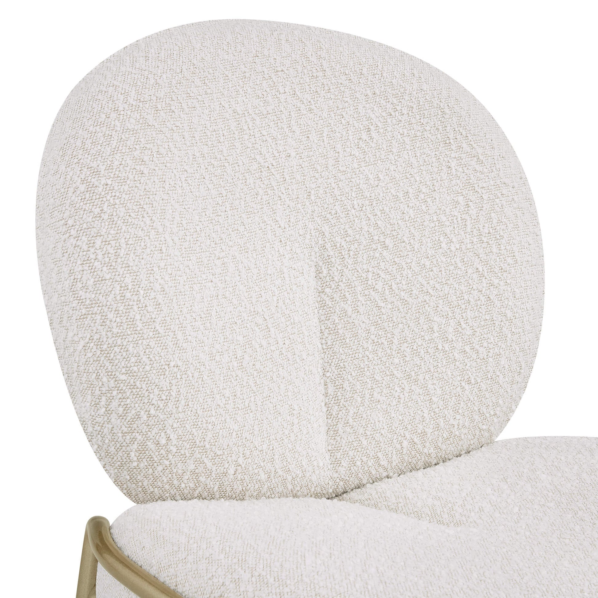 Elevate your space with the teresa white metal frame dining chair designed for cozy corners, bedrooms, or living rooms. Its plush teddy upholstery and thick high-density foam offer a soft, cloud-like touch with reliable ergonomic support. A wrapped, curved backrest naturally hugs your body, creating a soothing, comfortable sitting experience. Built with a reinforced iron frame and champagne-gold metal legs, it balances durability with light, refined elegance. The rounded “bubble” silhouette brings a gentle, healing vibe that complements contemporary, soft-minimal, and chic interior styles.