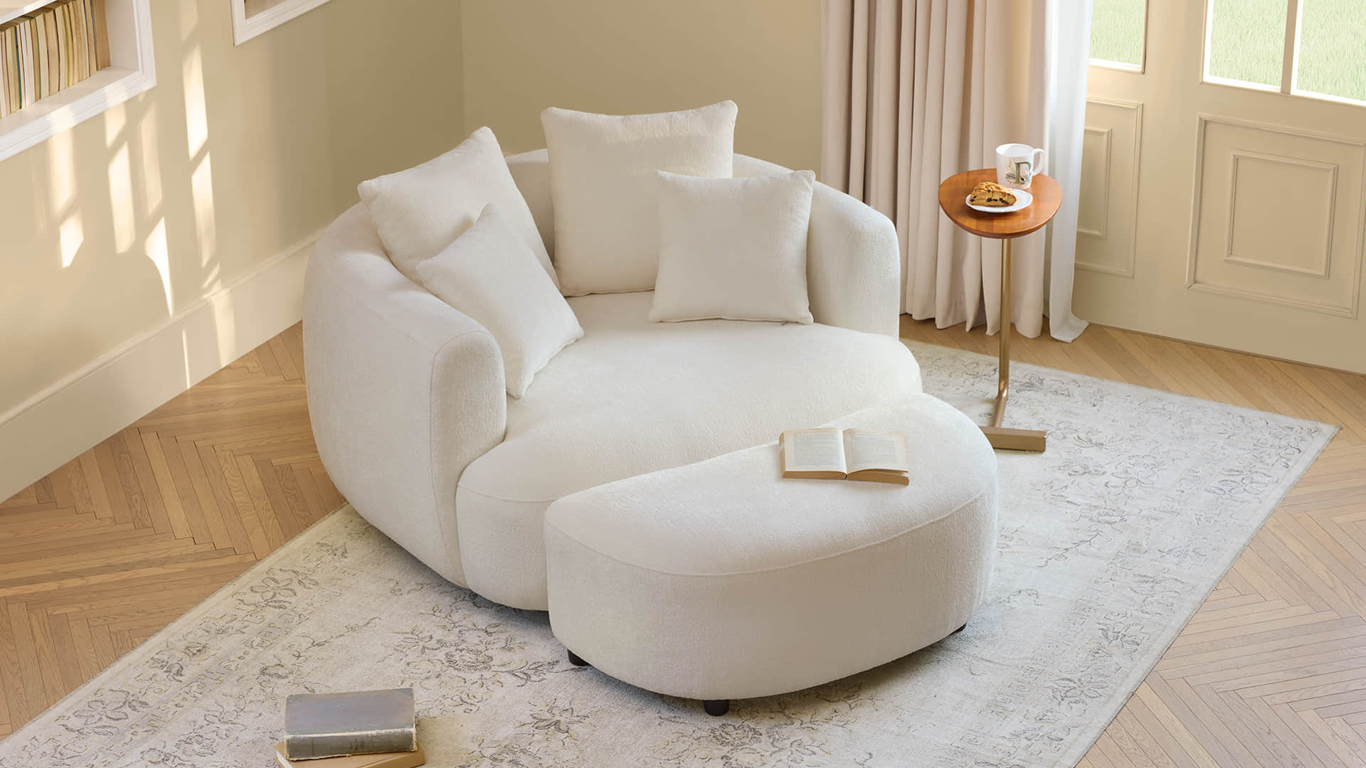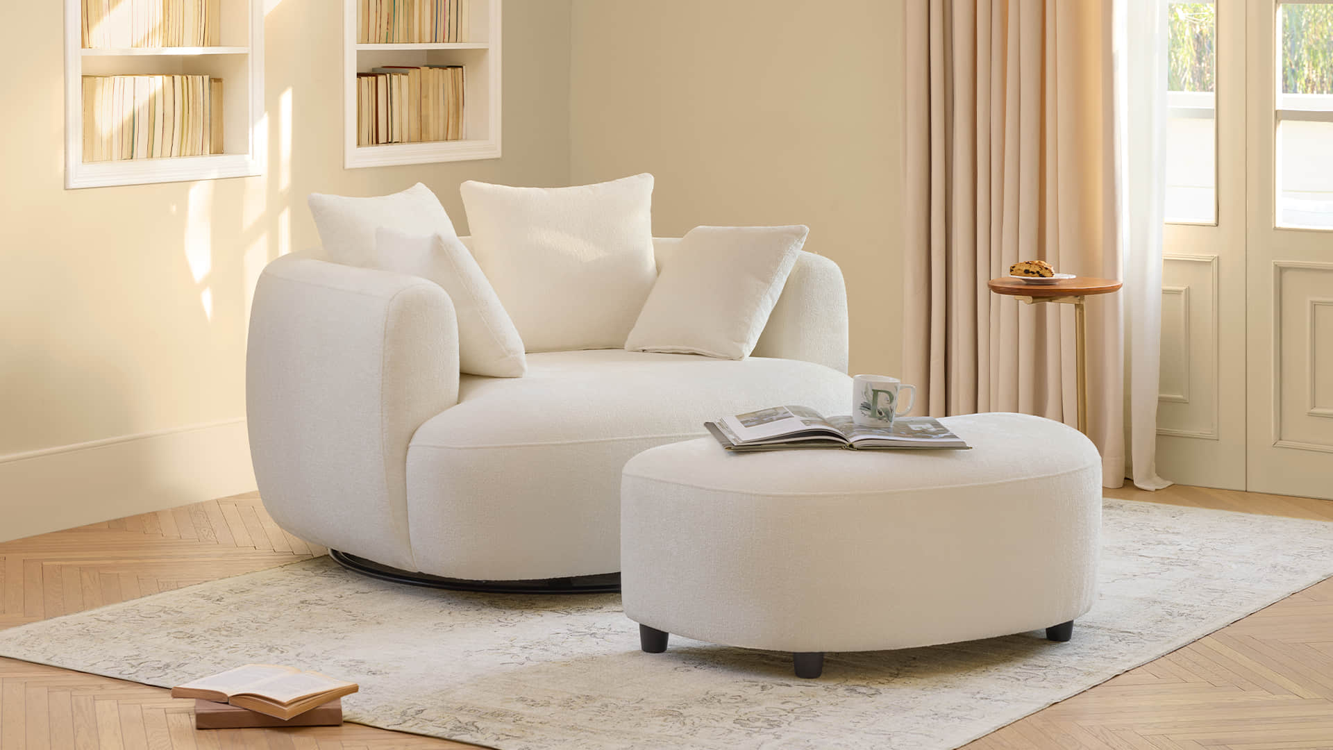 Zenith invites you to slow down with its wide, sculpted seat and cloud-soft curves. The 360° swivel base lets you turn with ease, while the crescent ottoman extends the lounge into a full-body retreat. Wrapped in OEKO-certified, easy-clean performance fabric and supported by kiln-dried, FSC-certified wood, this chair offers medium-firm comfort that holds its shape through everyday life.